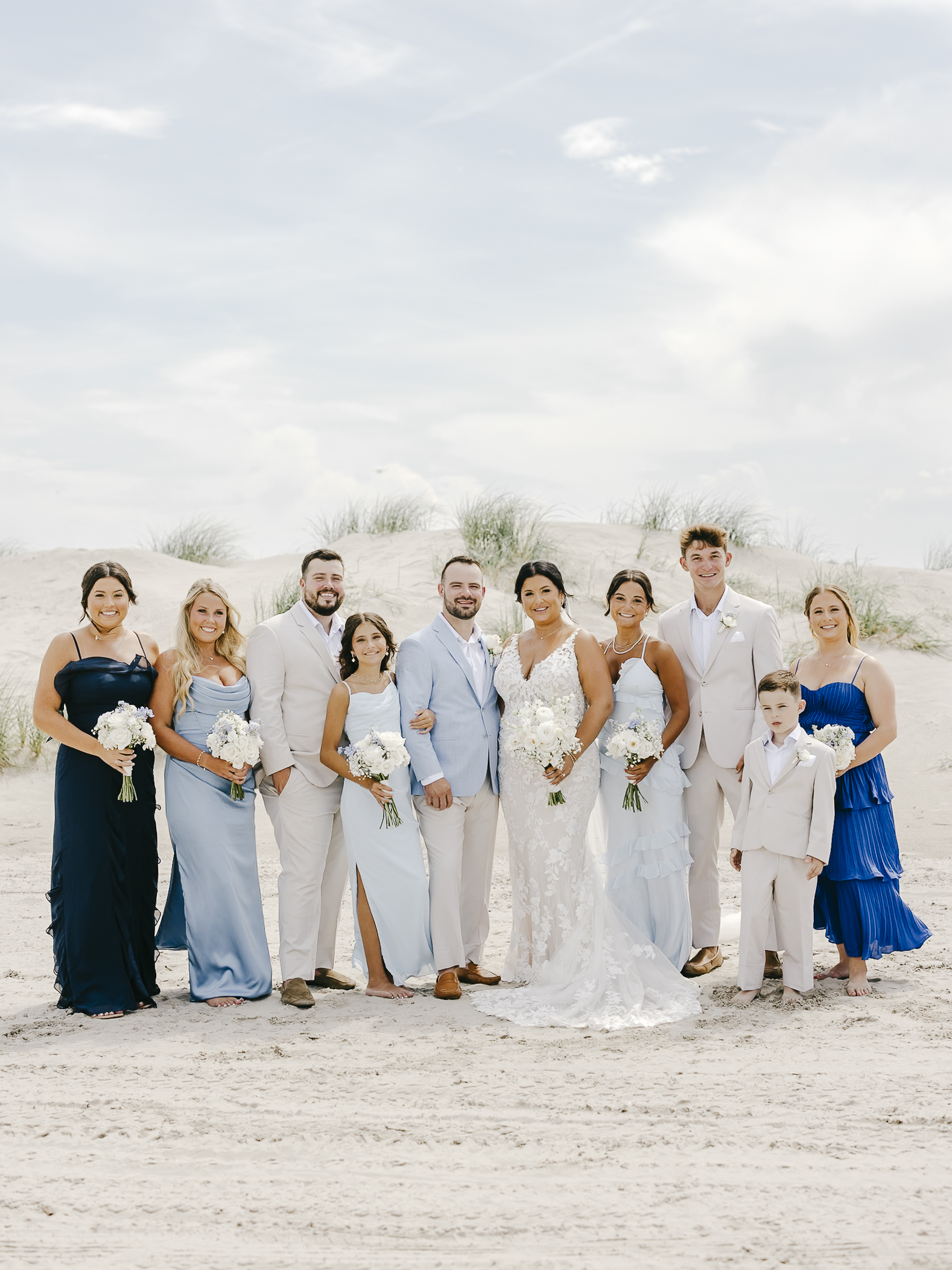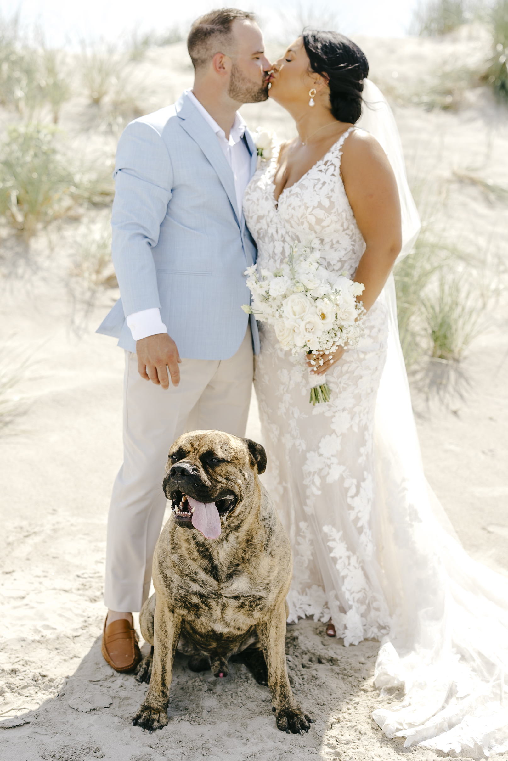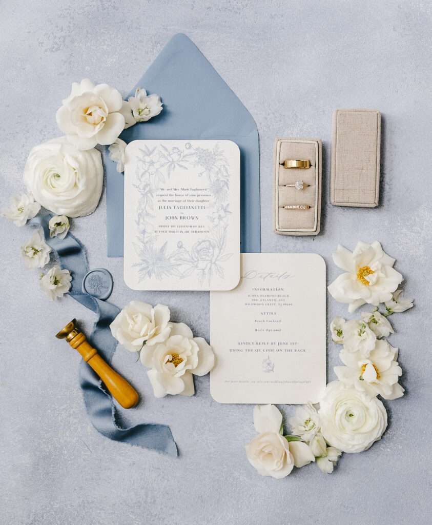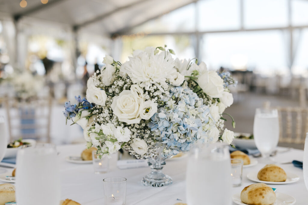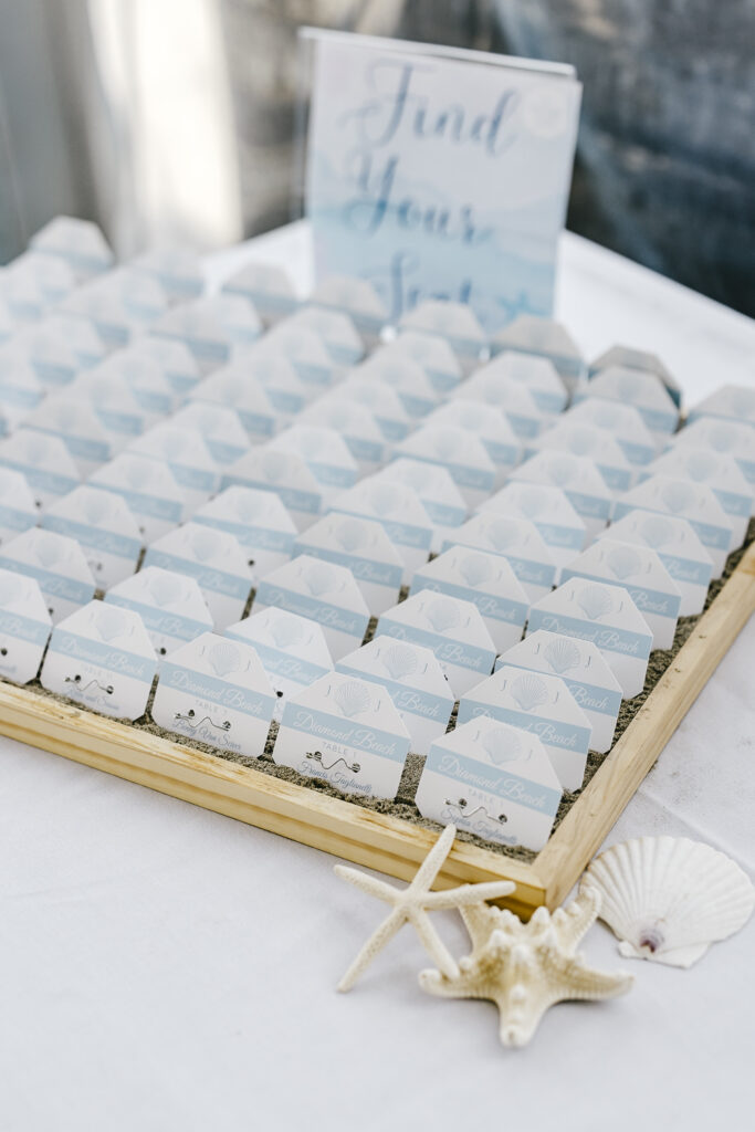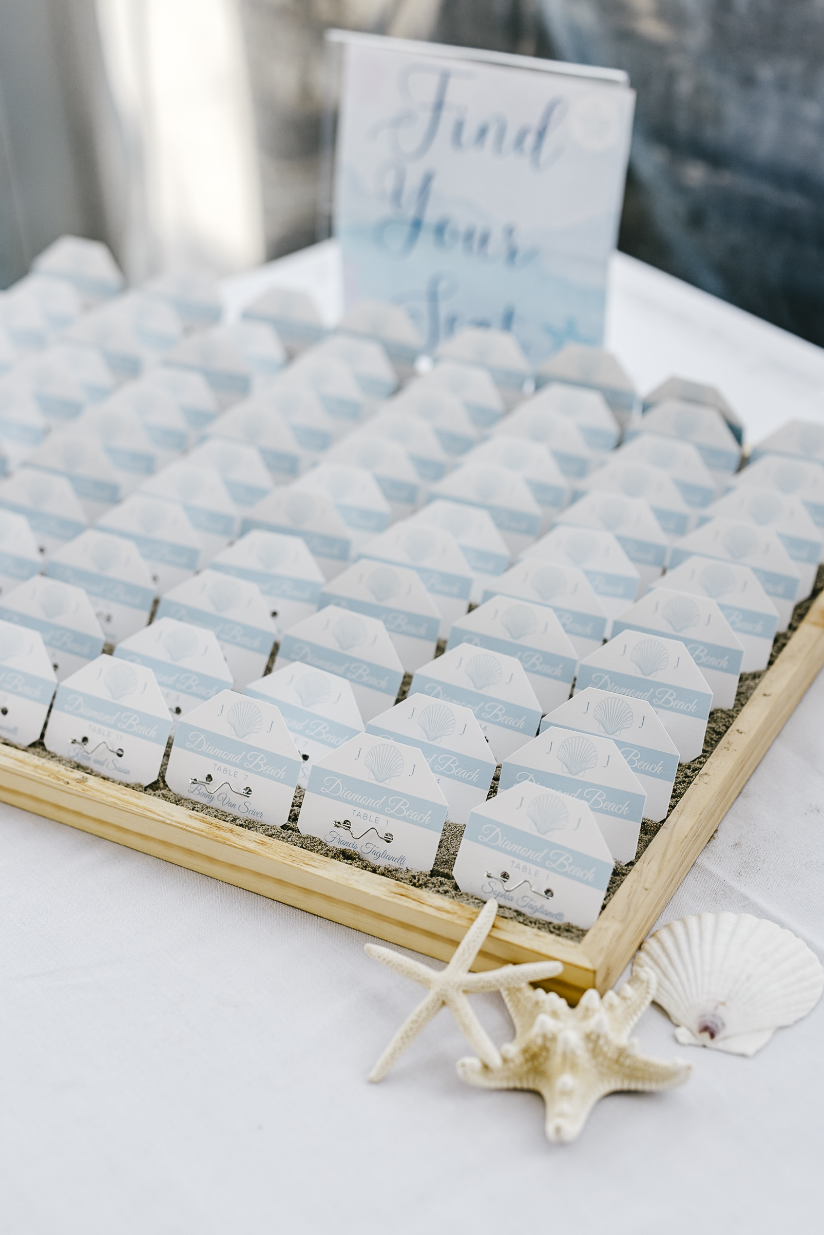 The day was centered around a baby blue color scheme, accompanied by a babies breath wedding arch, table seating cards inspired by New Jersey beach tags, and blue and white reception table decor.
