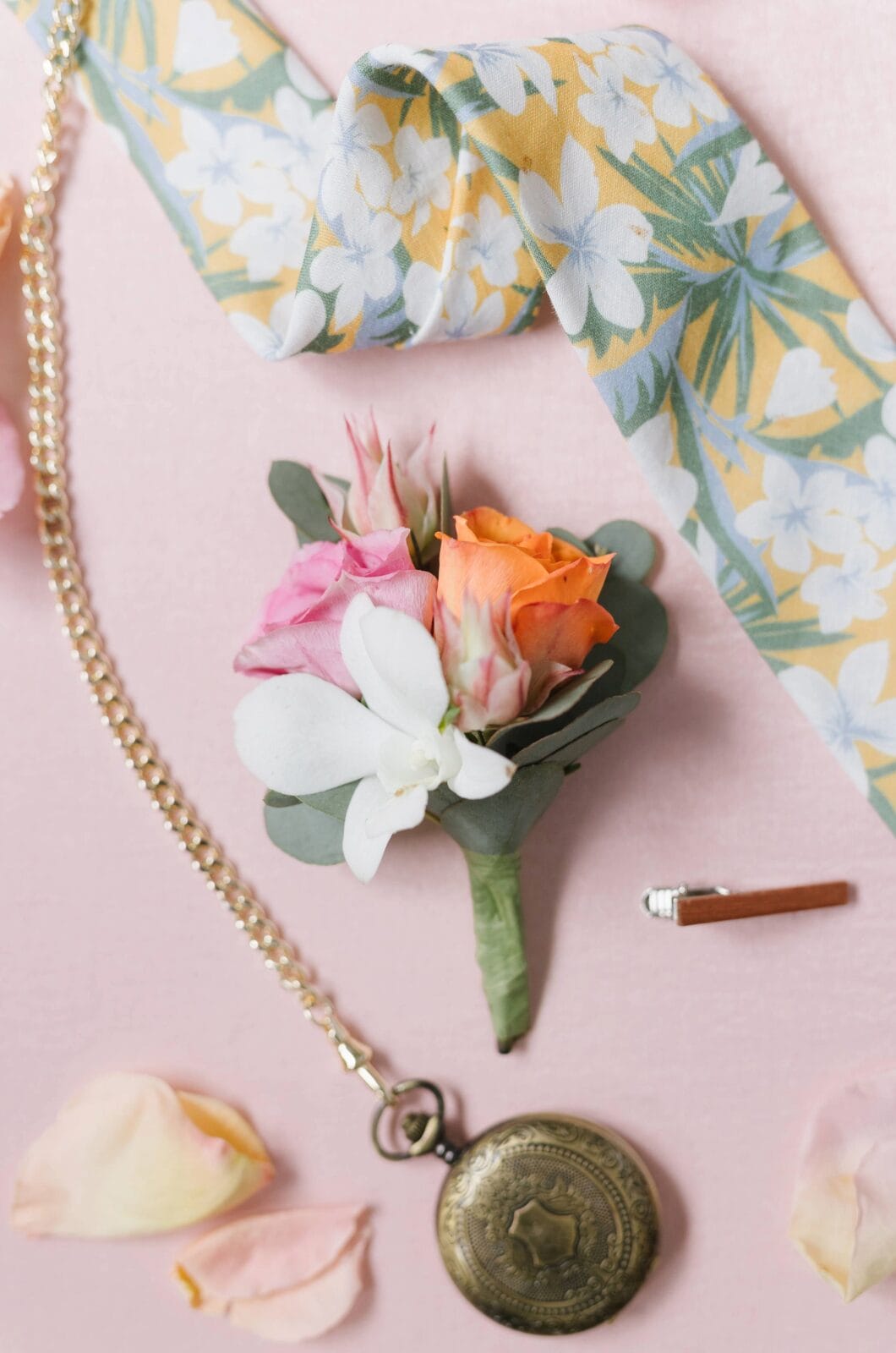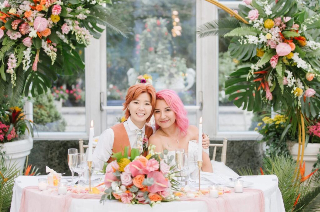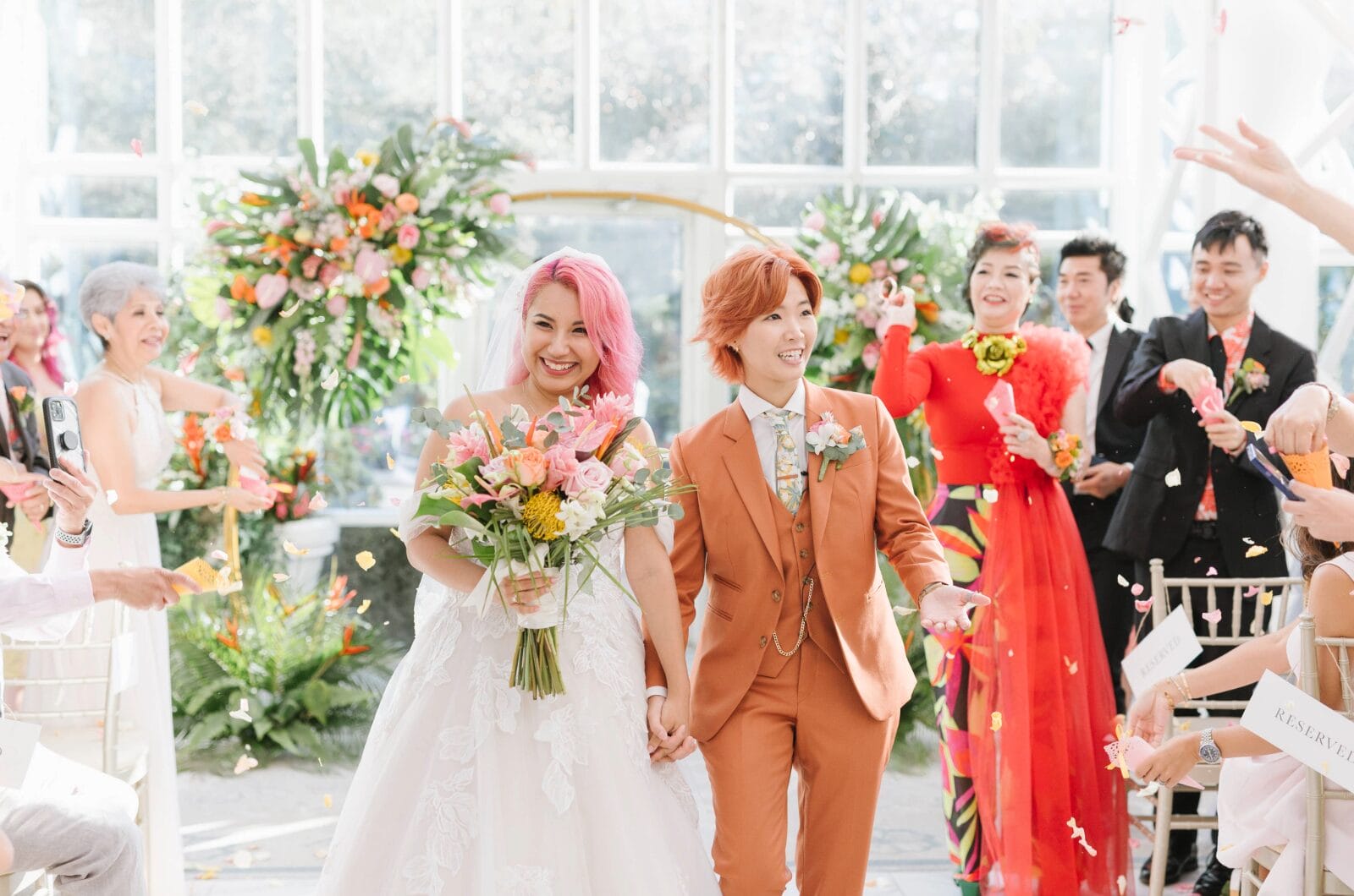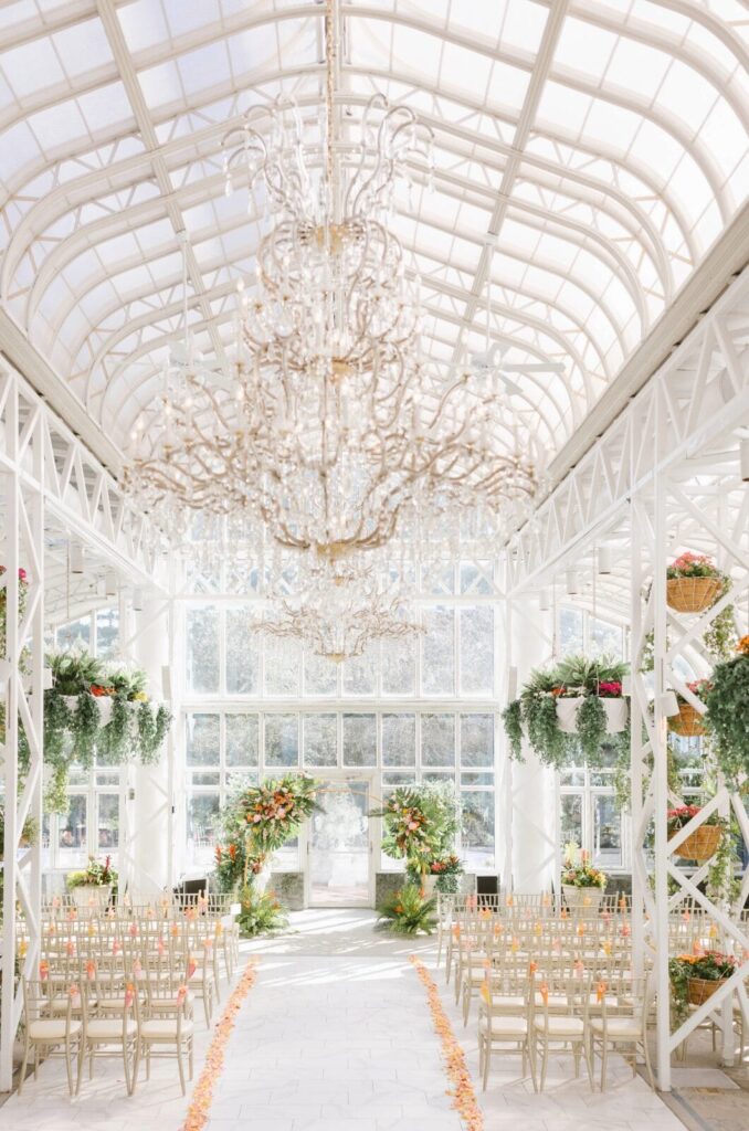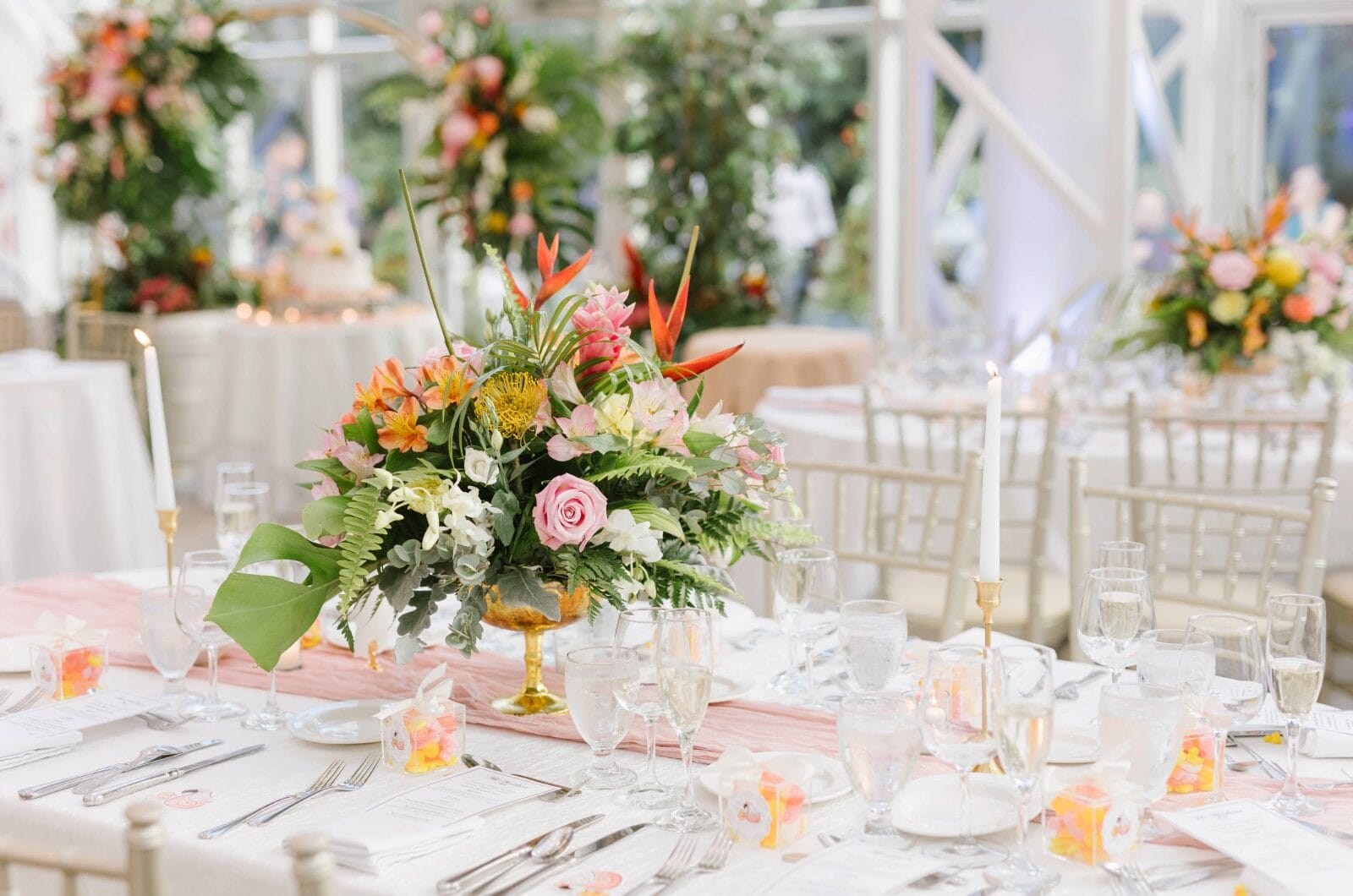 A tropical vibe defined the day. The bright, glass-enclosed venue was filled with lush greenery and floral displays in yellow, orange and pale pink.