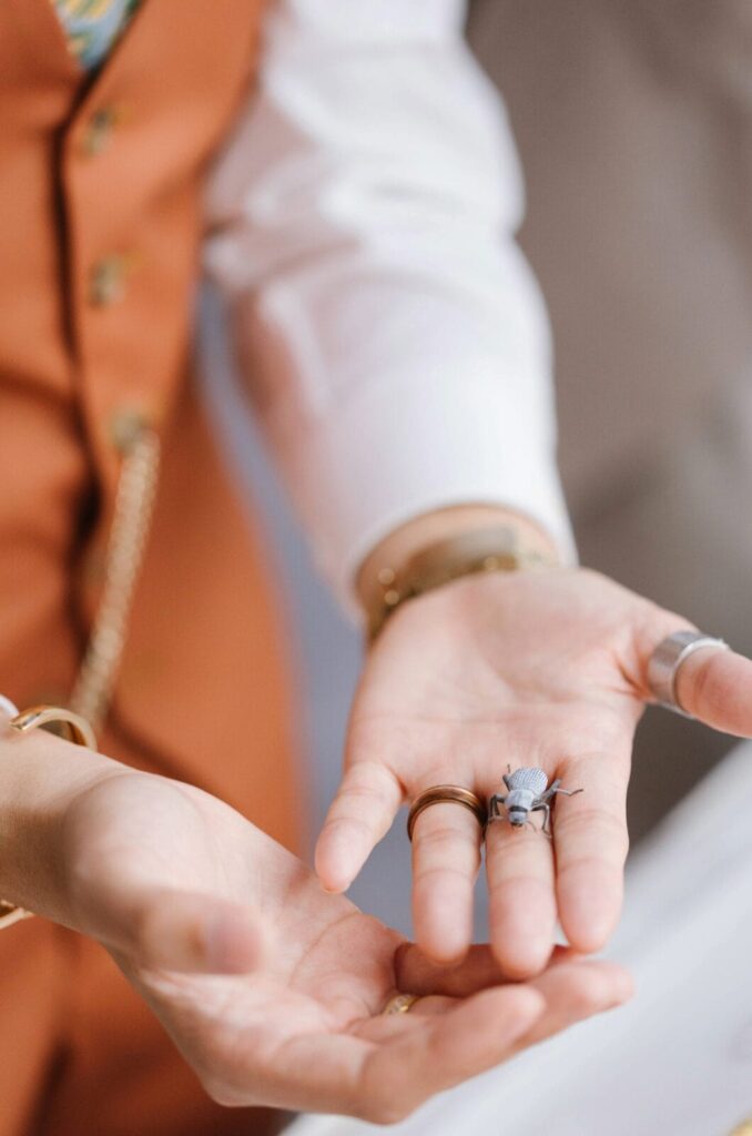 The couple’s dog, Kipper, had his own Hawaiian shirt for the wedding photos. Other special guests, four of Abby’s pet beetles, were displayed in a terrarium. Brief drama ensued when the beetles escaped during the party, but all were found safe.