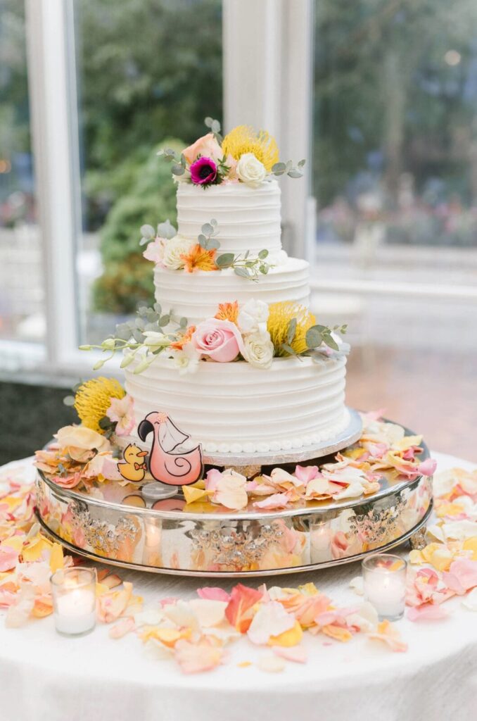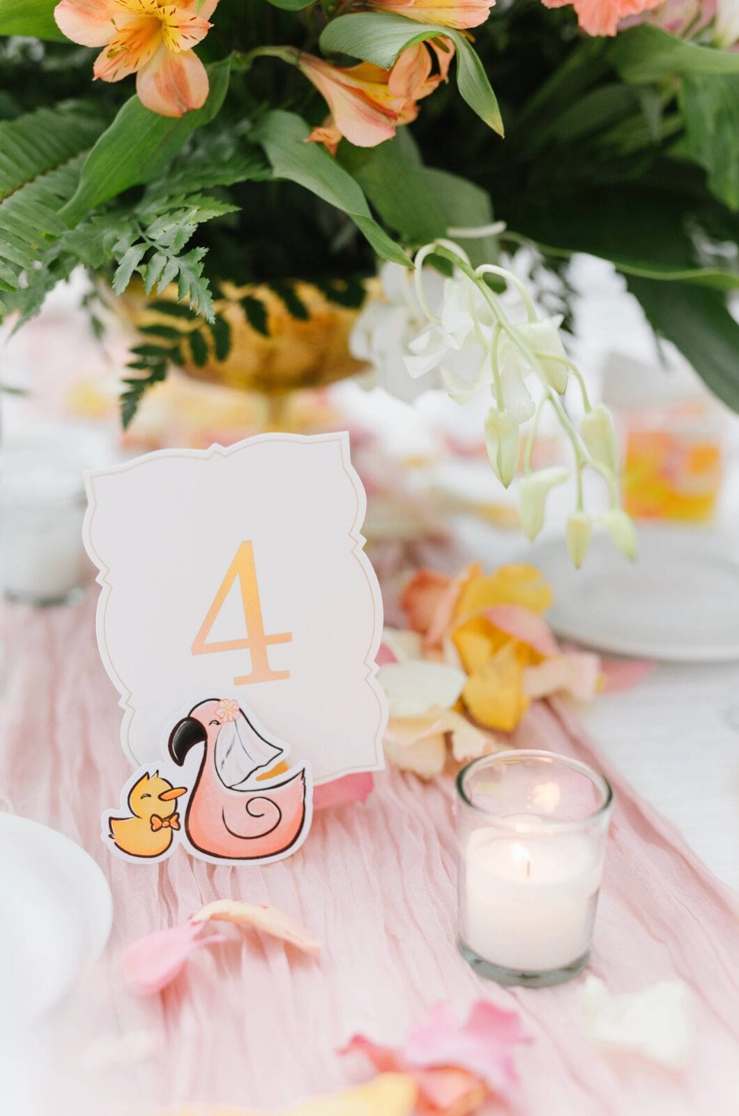 “We wanted wild and chaotic elements combined with refined details,” says Tanya. Of course, duck-and-flamingo renderings were all around—from the cake topper to the candy favors.