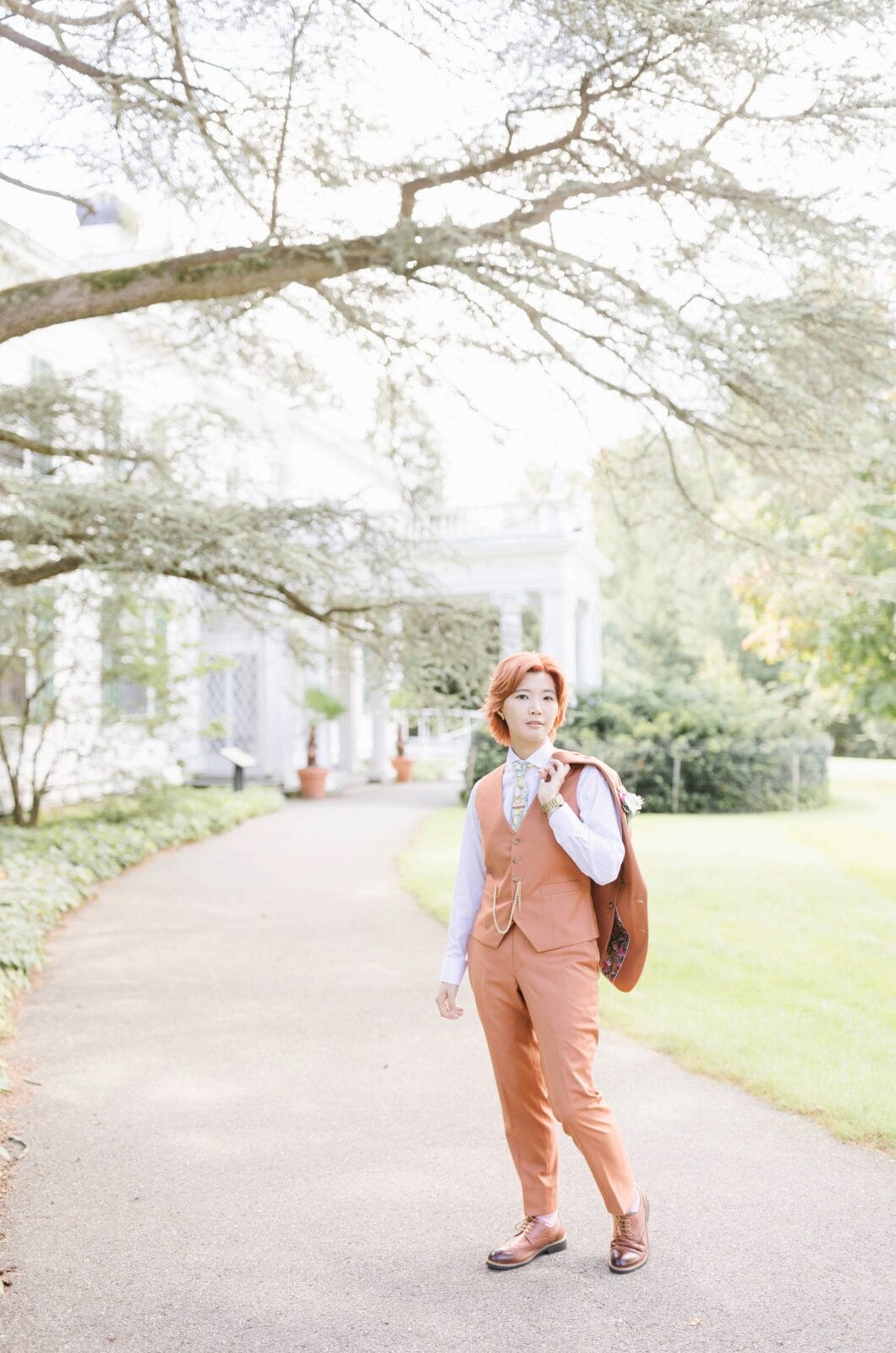 Abby worked with tailored-suit company Bindle & Keep for the perfect orange suit, complete with a tiger-print lining.