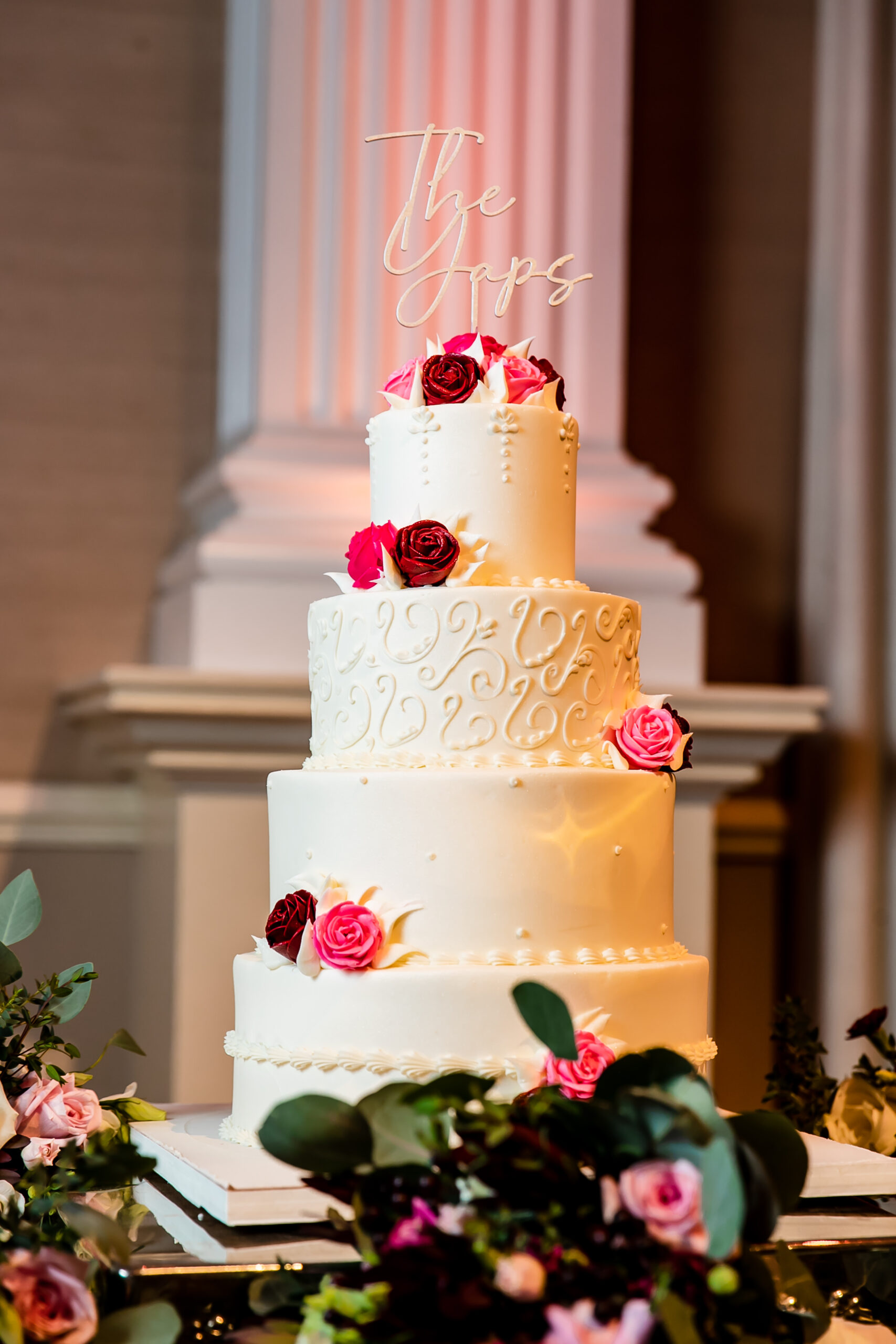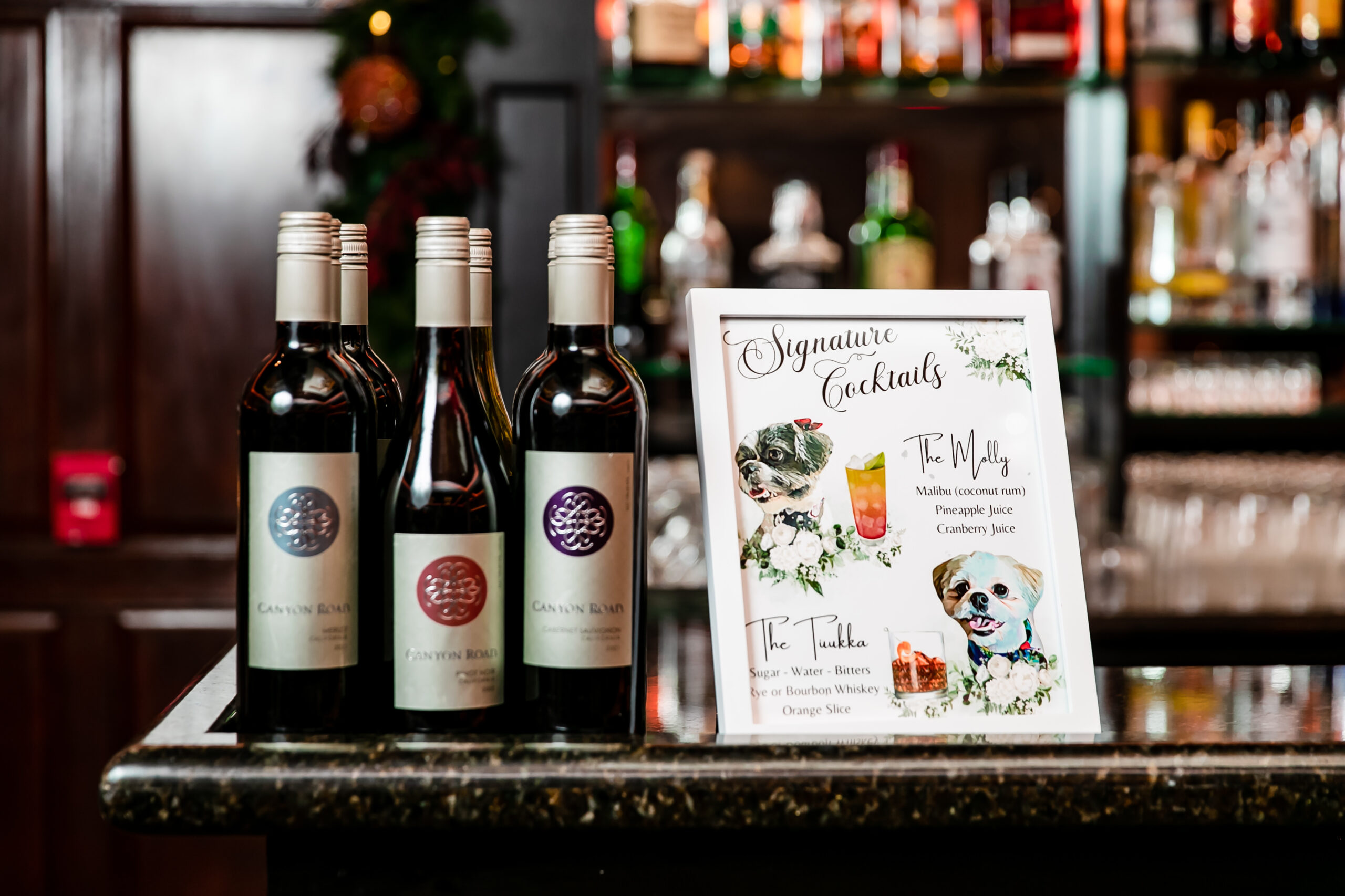 At cocktail hour, stations featured various cuisines, including hibachi stir-fry, pasta, seafood and a suckling pig. The couple chose a Shih Tzu theme for their signature cocktails—an old-fashioned named for their pup Tuukka and a Malibu bay breeze named for their pooch Molly. Palermo’s Bakery made the four-tier cake with lemon, chocolate pudding and cannoli fillings. The couple also opted for a Viennese display with mini pastries, crème brûlée and Belgian waffles with bananas Foster.