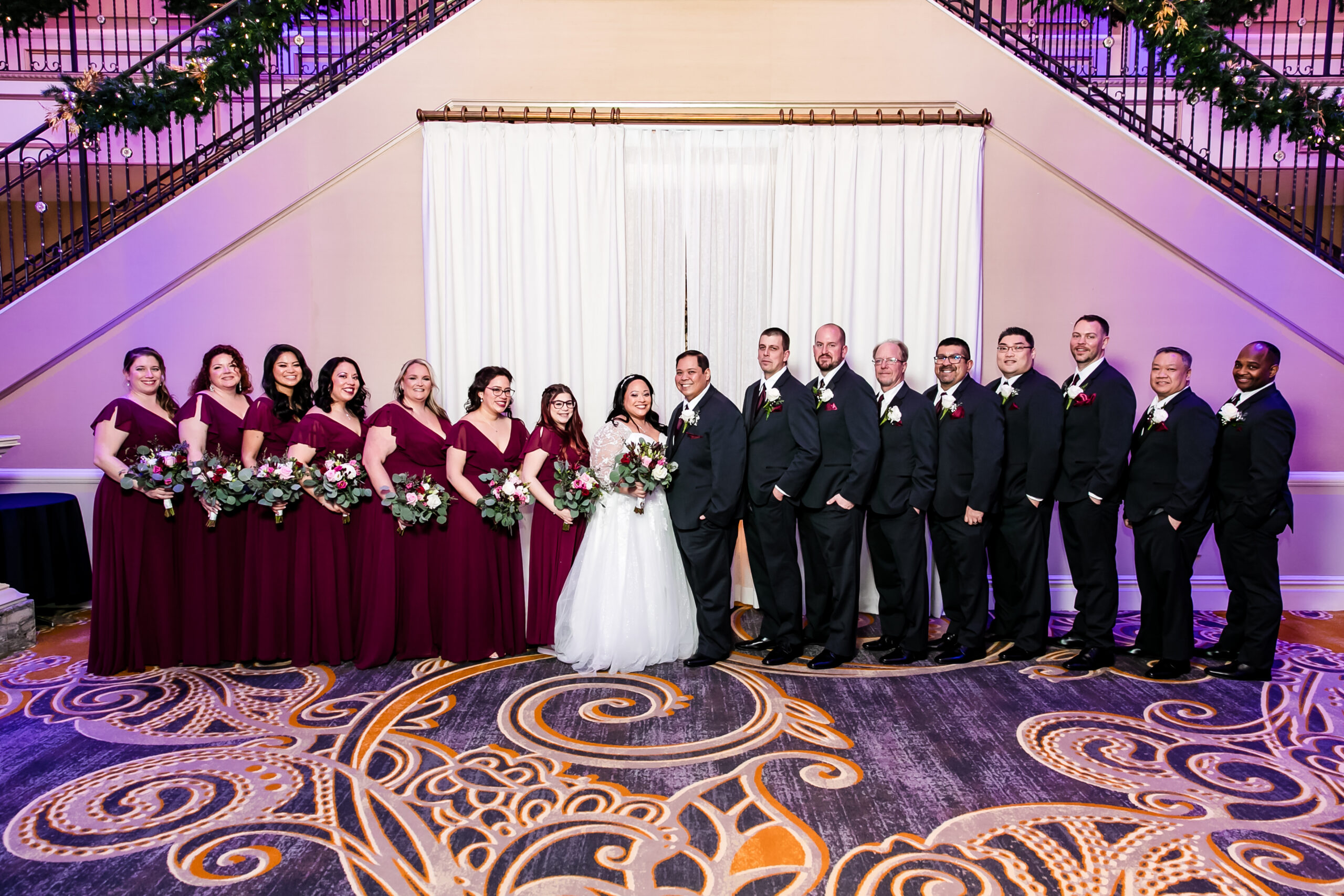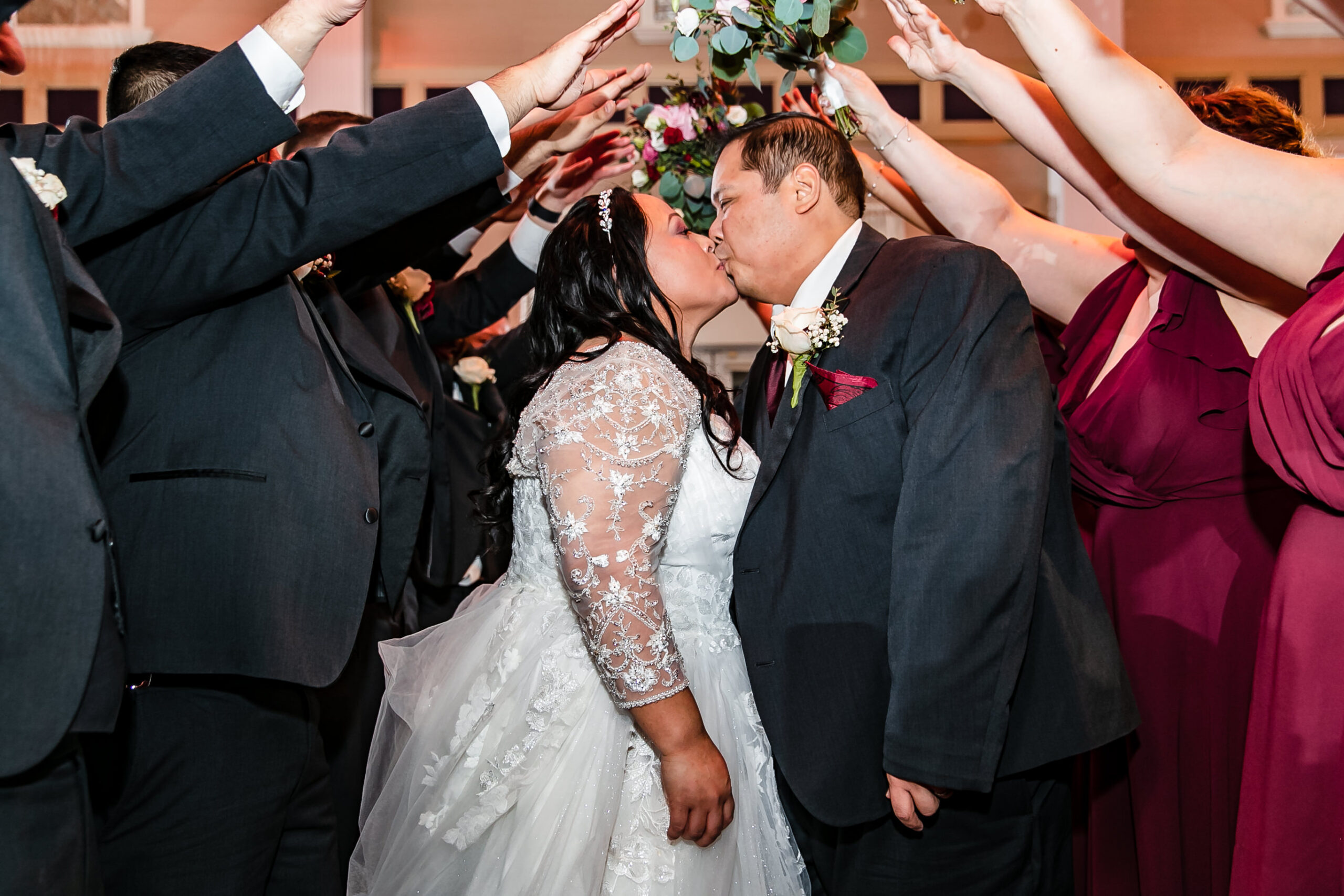 On January 7, 2023, they tied the knot. Their 136 guests traveled from as far as the Philippines and, of course, there were many bowling friends in attendance. It was important to Abby to honor her father, who passed away 11 years ago. On her bouquet, she included a brooch with a photo of her dad. Abby and her father loved Christmas. Luckily, both the church, St. John Vianney Roman Catholic Church, and the venue, the Palace at Somerset Park, still had holiday decorations on display. Abby and Russ wanted a traditional ceremony, so “we didn’t see each other until I was walking down the aisle with my brother,” says Abby. “I was thinking, I can’t wait to get to him.”