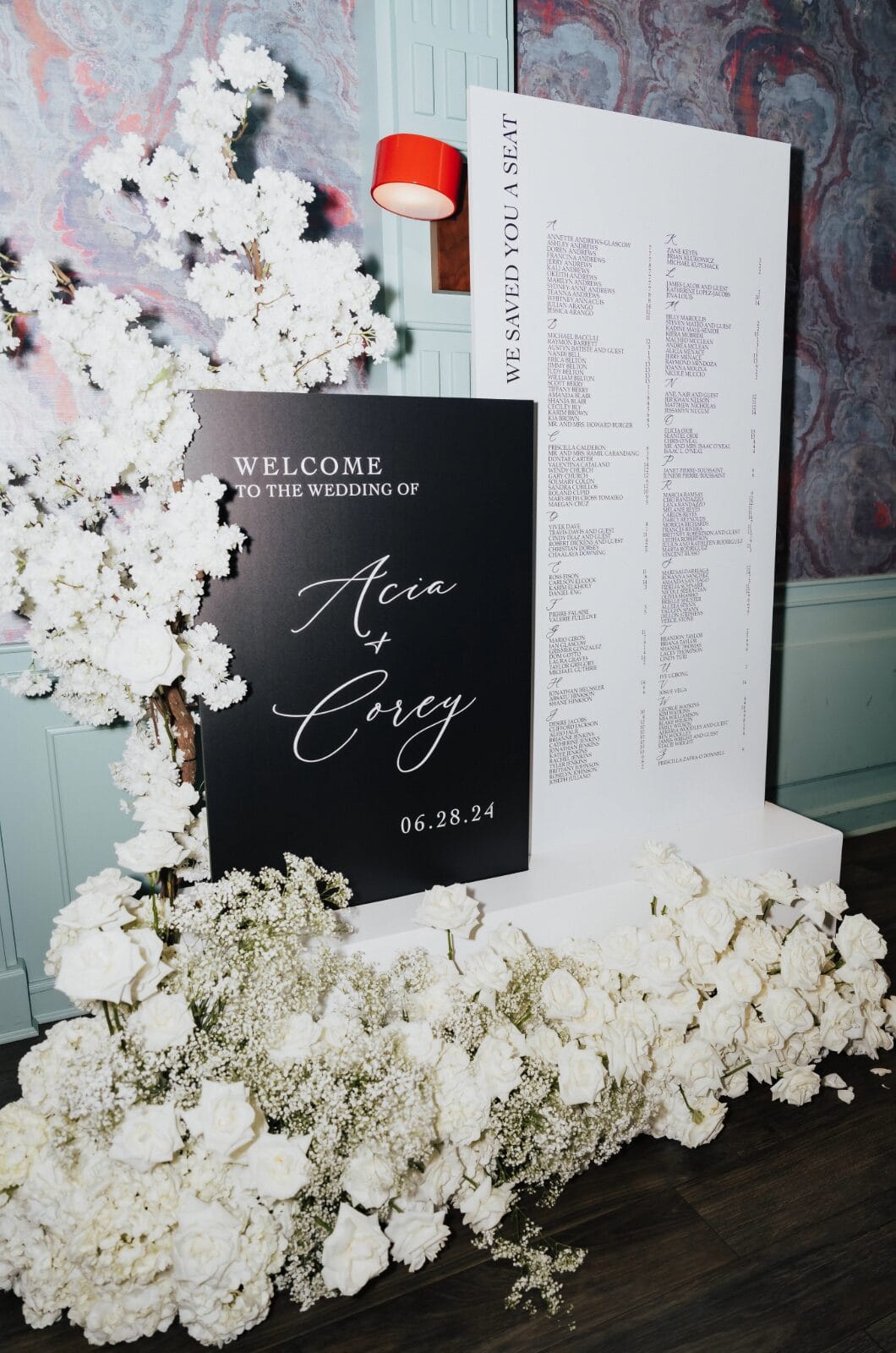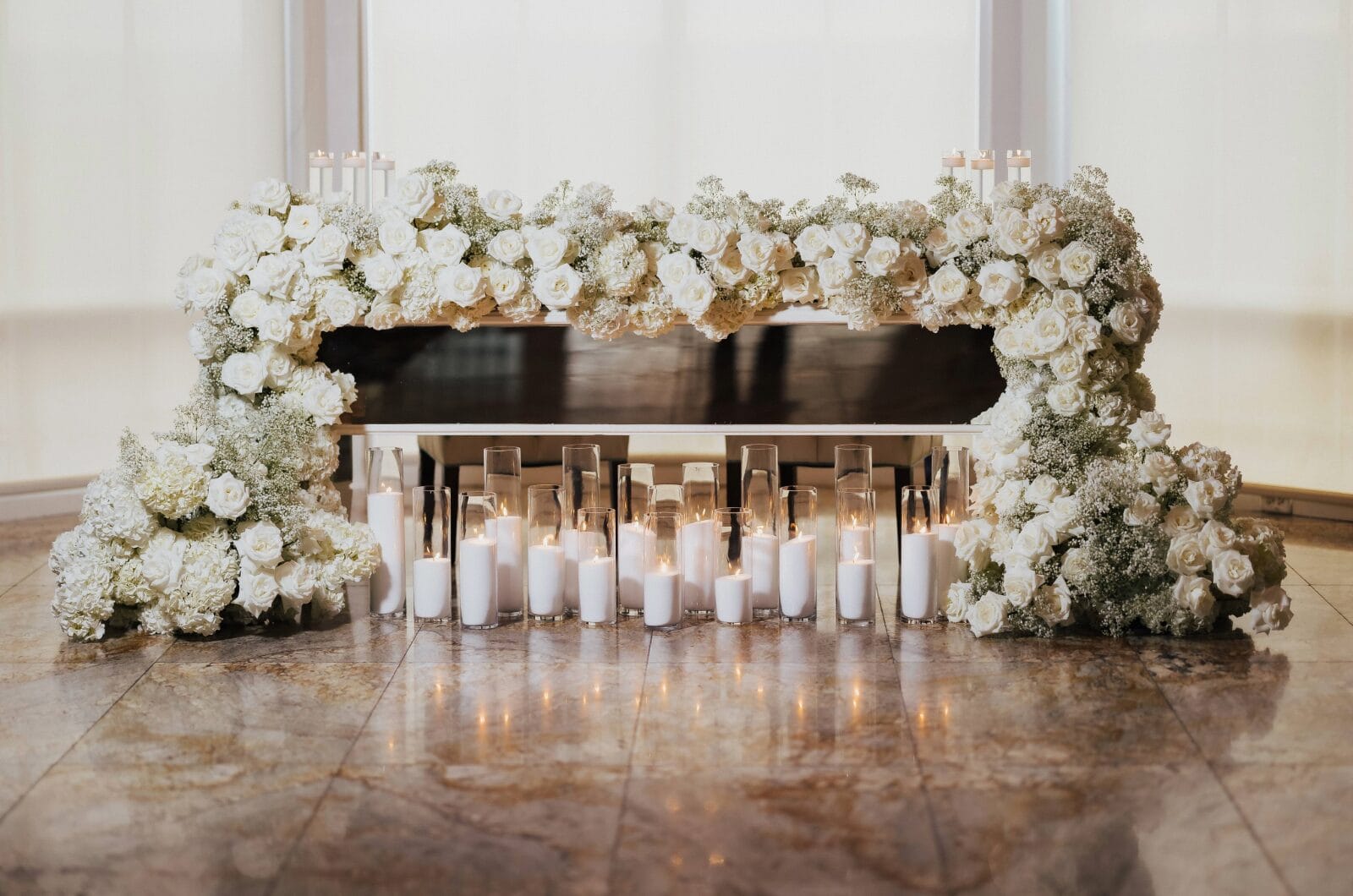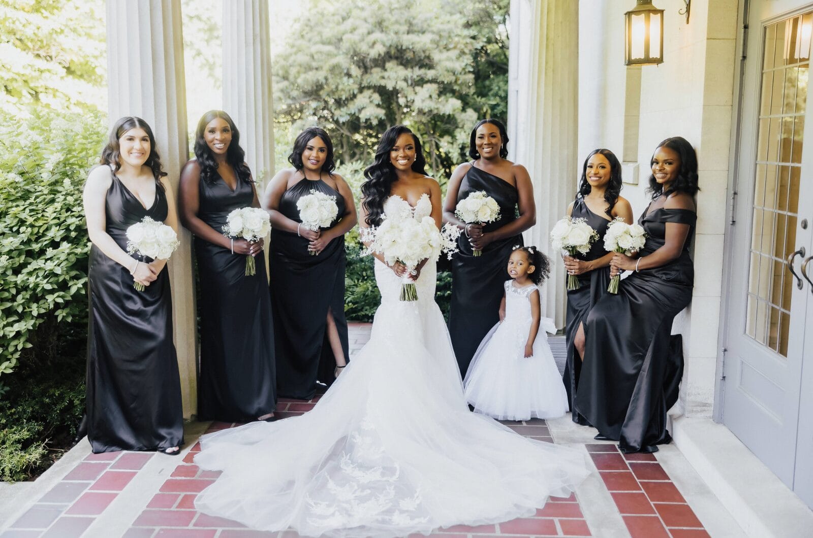 Their wedding vision was rooted in classic romance. A timeless palette of black and white with satin touches, candlelight, and a mixture of understated white florals—hydrangeas, roses, and baby’s breath—combined to bring a beautifully ageless yet modern elegance to the space on June 28, 2024.