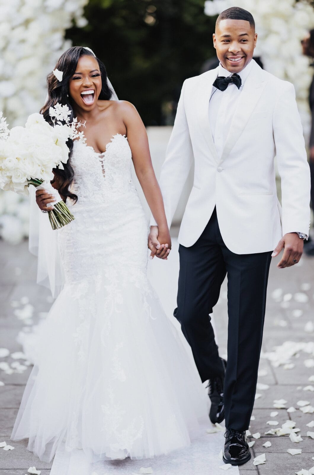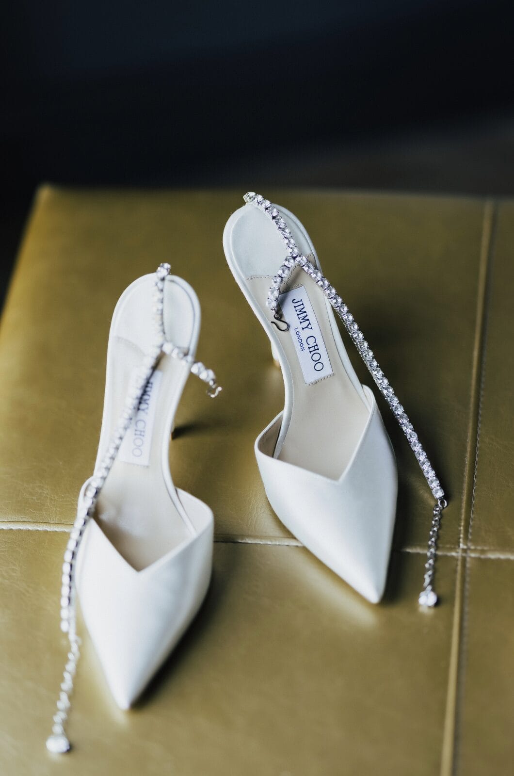 The bride chose a strapless mermaid-style gown by Enzoani, paired with Jimmy Choo’s Saeda pumps, a Swarovski bracelet, and Ettika earrings.