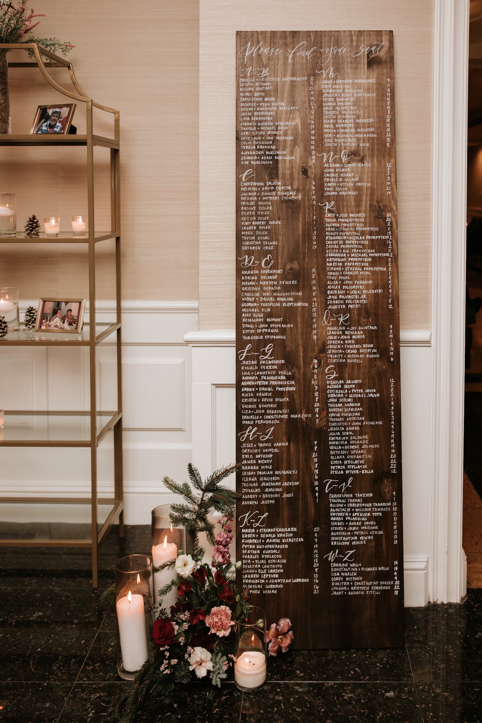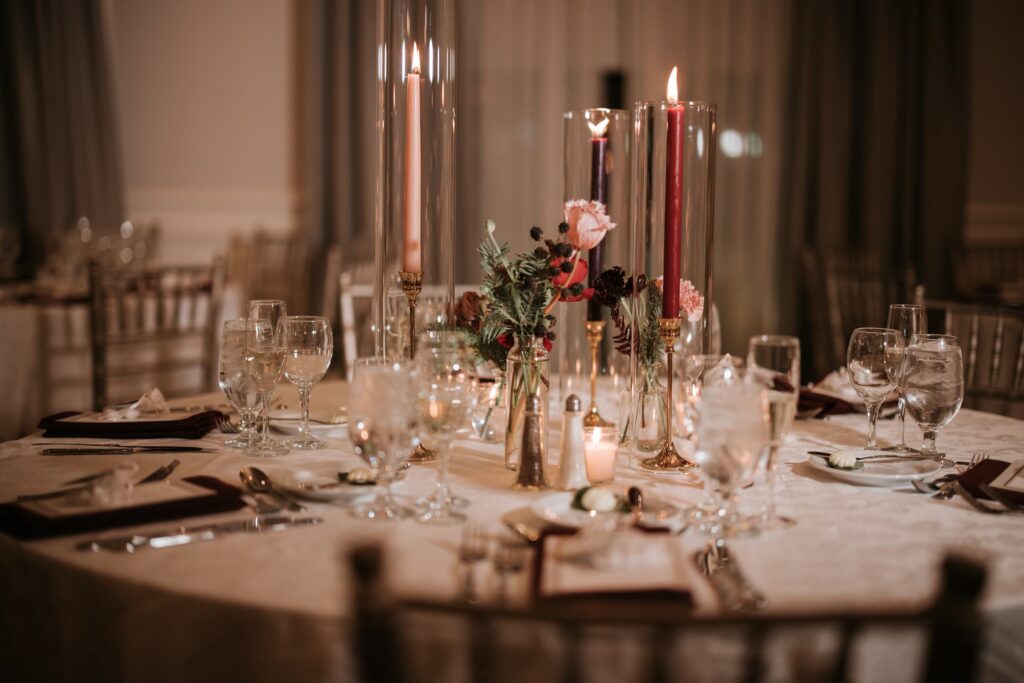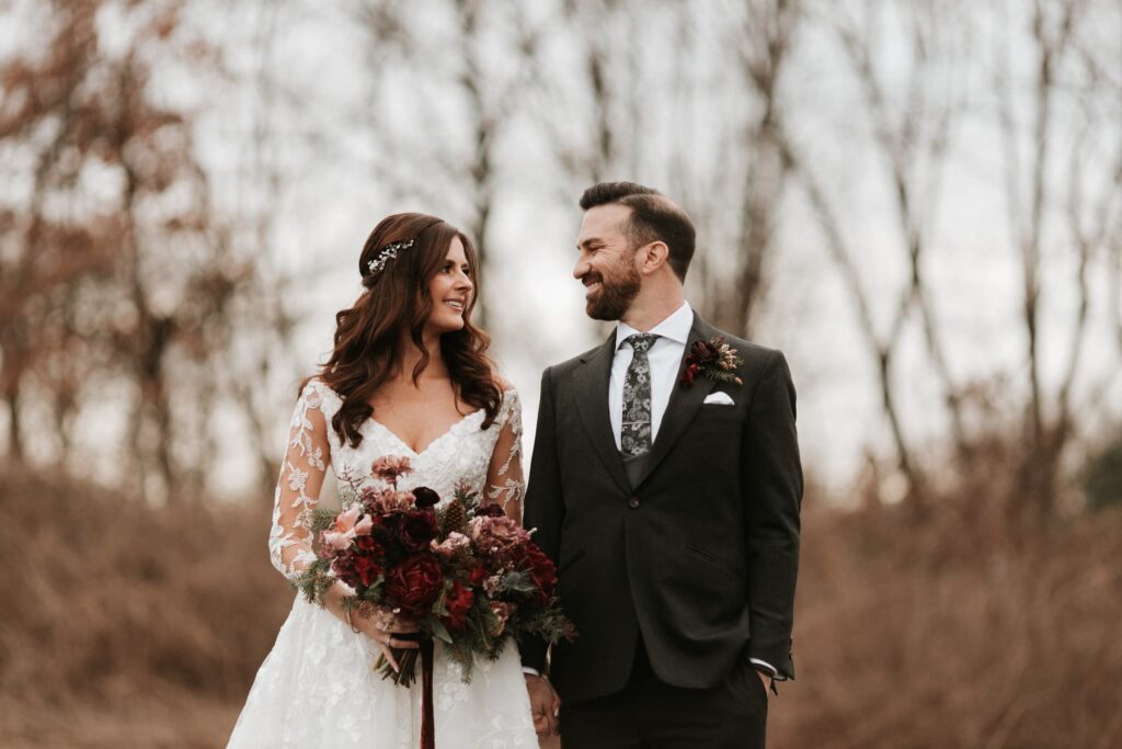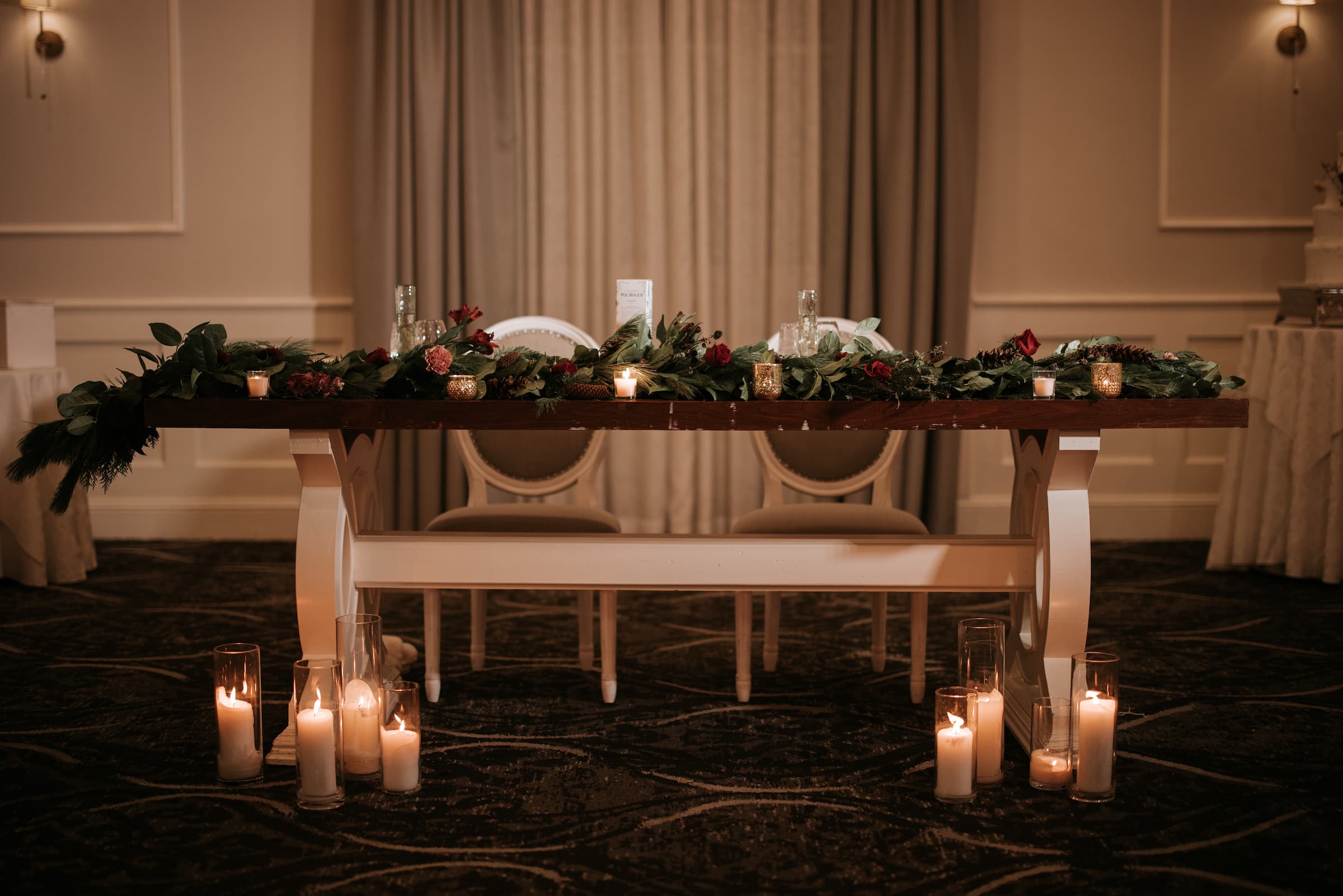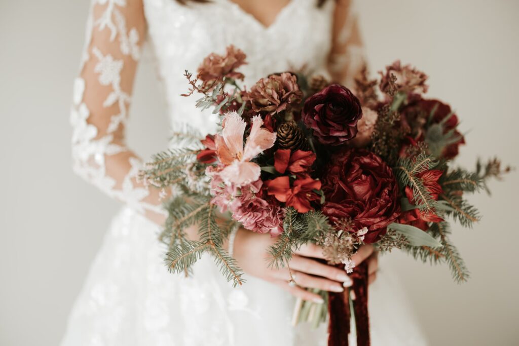 For their January 28 wedding, Alana wanted a winter wonderland vibe with lots of candlelight, “to make it feel like a cozy evening on a cold winter’s night,” she says. The color scheme was burgundy and dusty rose with gold tones mixed in. She had her florist mix in ranunculus flowers and pine cones.