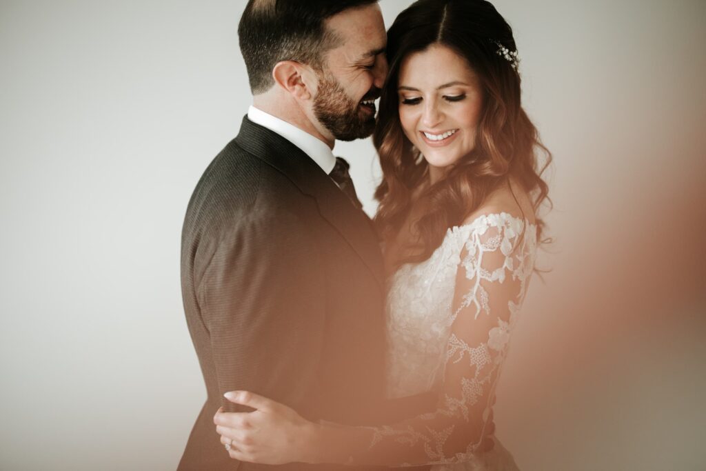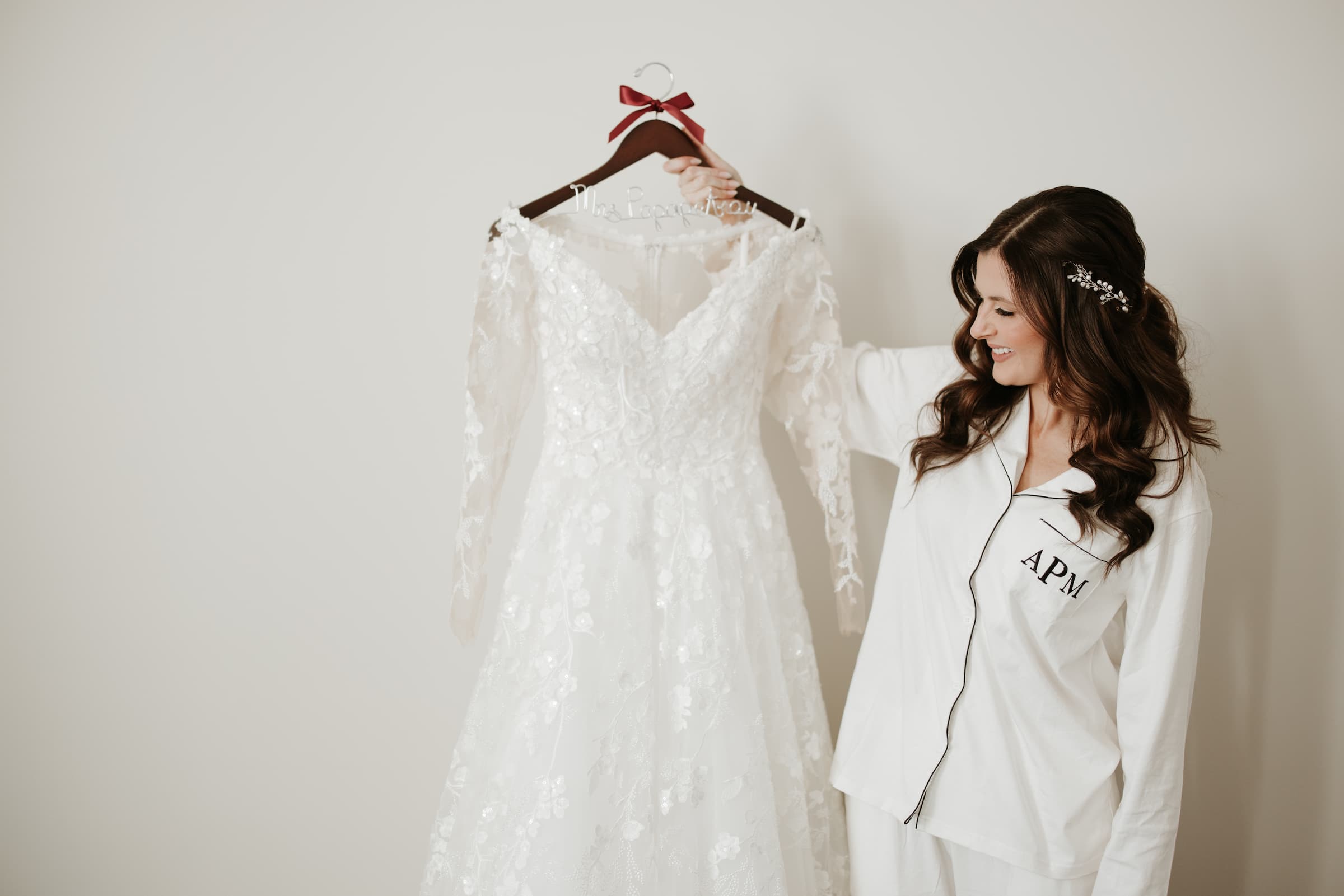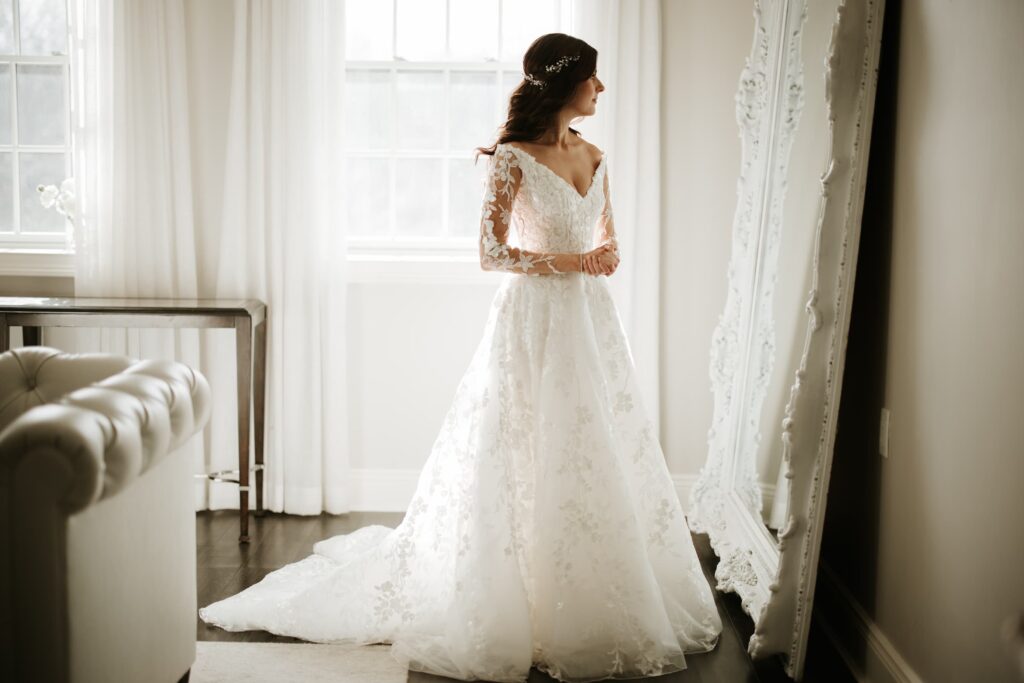 Alana’s gown was, “exactly what I dreamed it would be,” she says. “The gown was elegant, classy, had a bit of a princess touch, and had different pop factors, such as the illusion sleeves and the gorgeous open design on the back. I also loved that Kleinfeld’s was able to work with me to make the front a bit more conservative. I also liked how it fell slightly off the shoulder. It was just the right amount of ‘poofy.’ The way the flowers and branches were on the gown gave it a winter feel,” she says. “It just gave me the feels and fit into the exact vision I had,” she says. “I found it on my first day of dress shopping, and never looked back!”