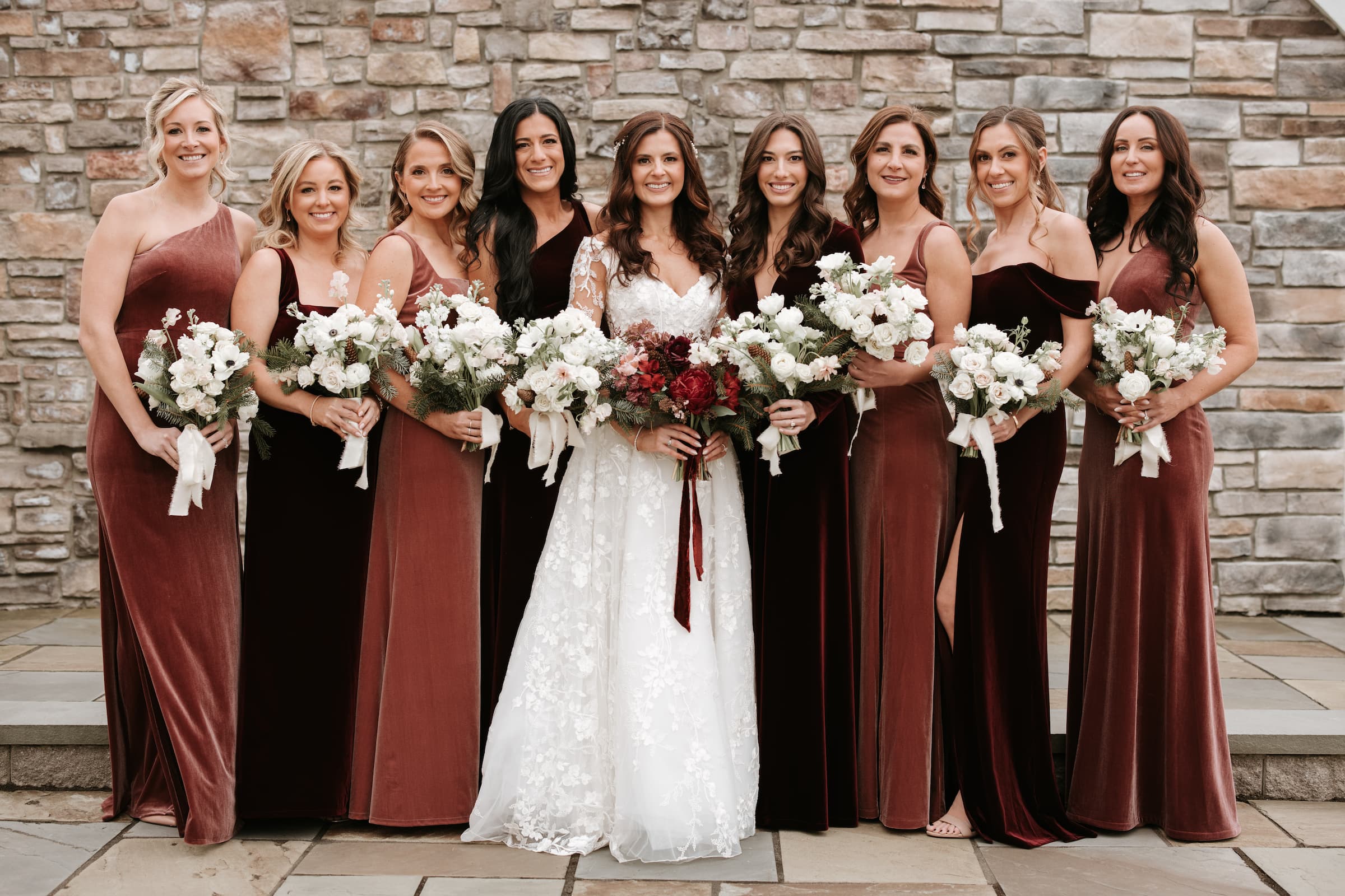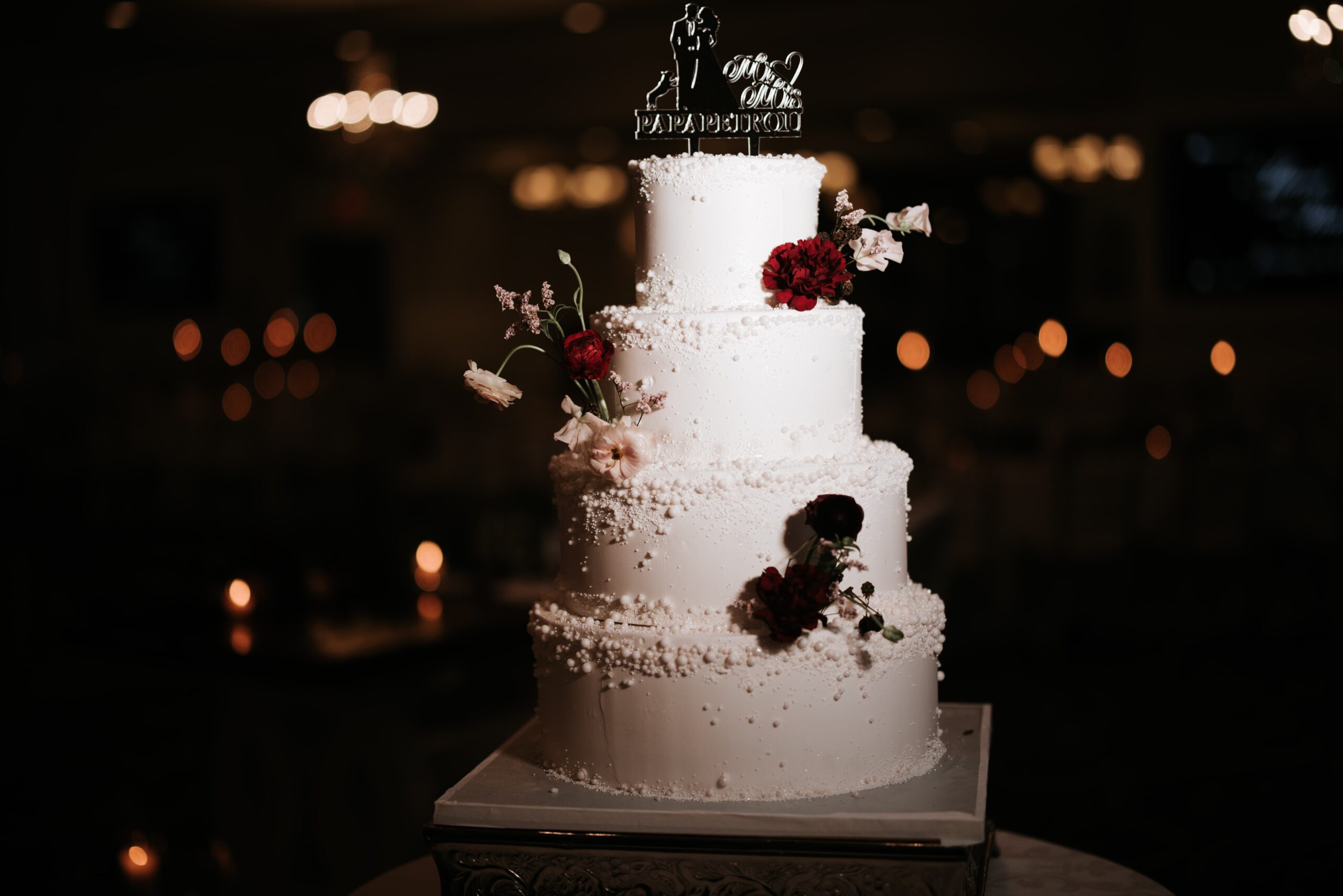 “The food at The Mansion at Mountain Lakes is absolutely incredible and extensive,” says Alana. Their cocktail hour had a large antipasto table with various cheeses, meats and Mediterranean finger foods (grape leaves, artichokes, pita, etc.). They also had ten passed hors d’oeurves including chicken and waffles, beef wellington, spanakopita, ahi tuna, sweet corn fritters and mini Reubens. Stations included macaroni and cheese, beef braciola, chicken piccata, calamari, sliders, two pasta stations, a beef brisket carving station and an Asian cuisine station. Guests chose between the following entrees: chateaubriand, lemon chicken Romano and a salmon with Dijon mustard beurre blanc sauce. All were served with seasonal vegetables and potatoes. Dessert was an assortment of pastries (eclairs, cheesecake, baklava, cannoli). The four-layer wedding cake incorporated three flavors: vanilla, red velvet and decadent chocolate. The outside was a buttercream icing and in between the layers was a cream cheese frosting.