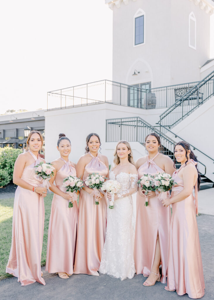 Alejandra wore a stunning off-the-shoulder lace gown while her bridesmaids wore halter-style soft pink bridesmaid dresses.