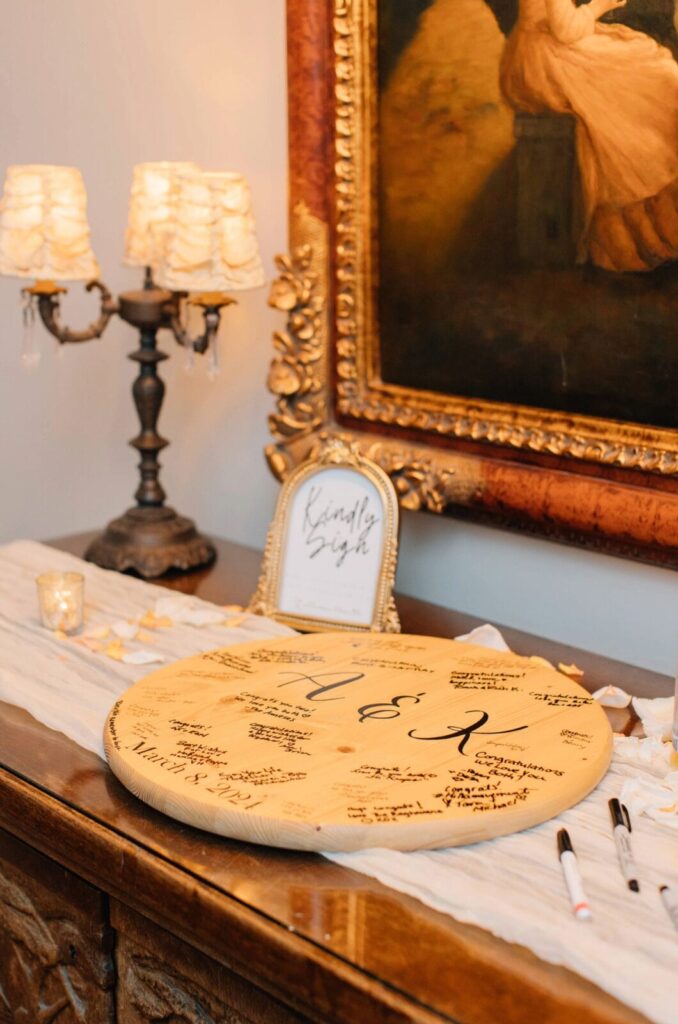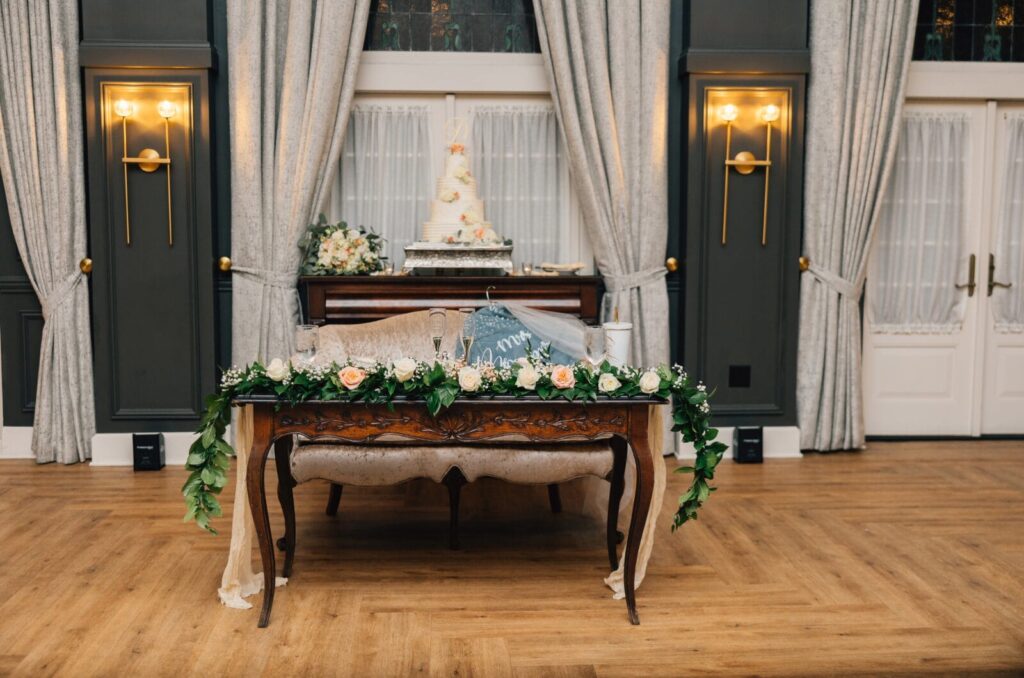 “From the wooden floors, antique bar from the 1700s, and ivy covered outdoor wall, this space is an absolute gem,” says the bride.