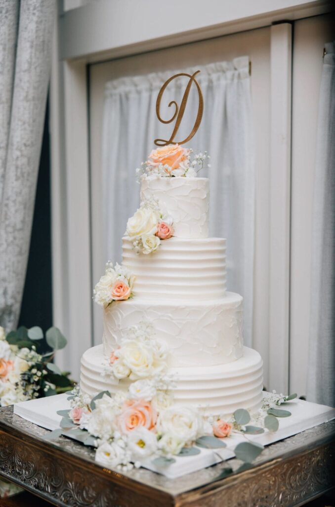 “My main inspiration for decor was lots of greenery and candle light,” says Allison. “Our flowers were filled with eucalyptus, greenery, white roses and peach flowers for a pop. Floating candles and tea lights lit the room and added a taste of elegance.”