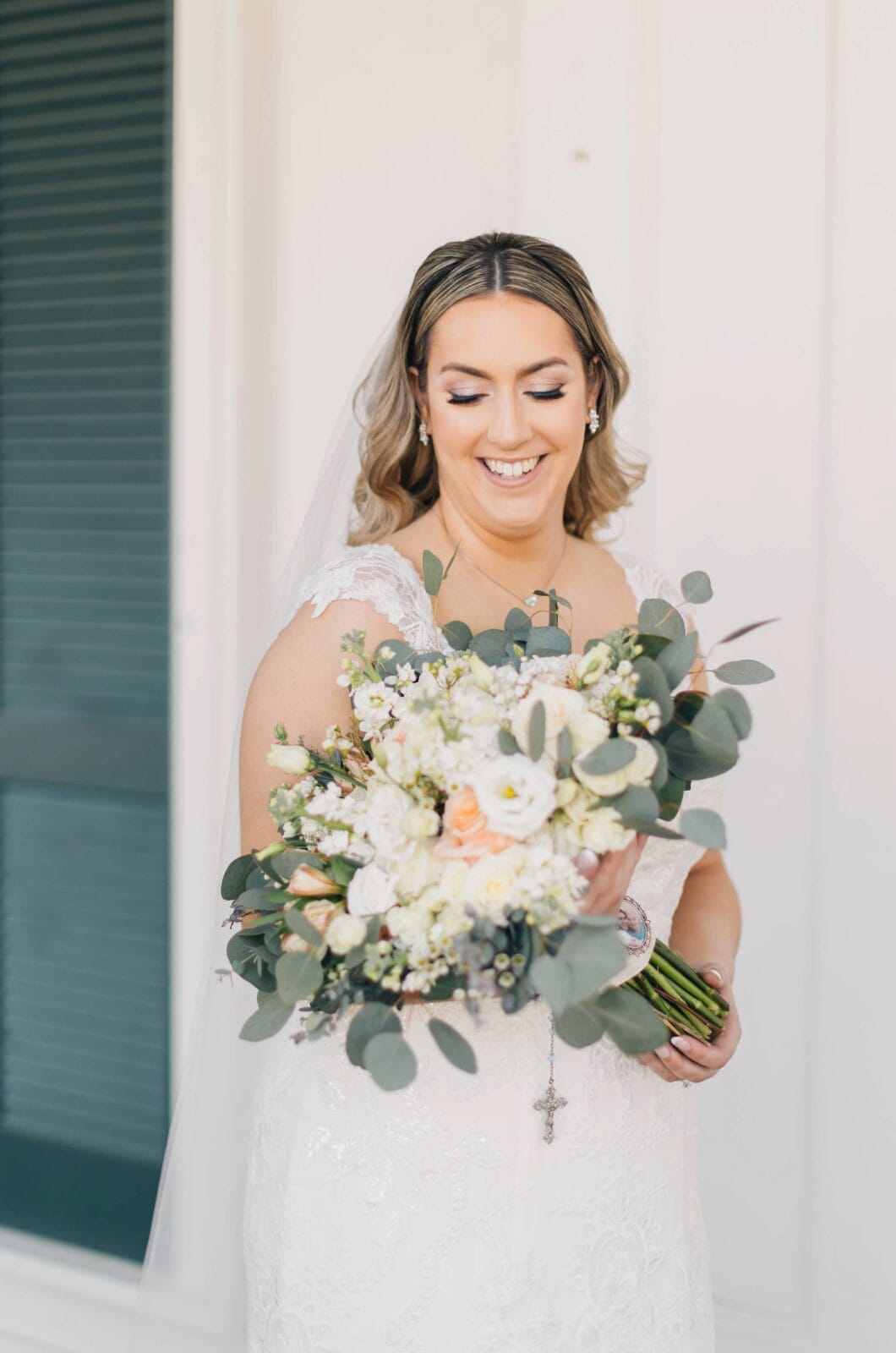 “My main inspiration for decor was lots of greenery and candle light,” says Allison. “Our flowers were filled with eucalyptus, greenery, white roses and peach flowers for a pop. Floating candles and tea lights lit the room and added a taste of elegance.”
