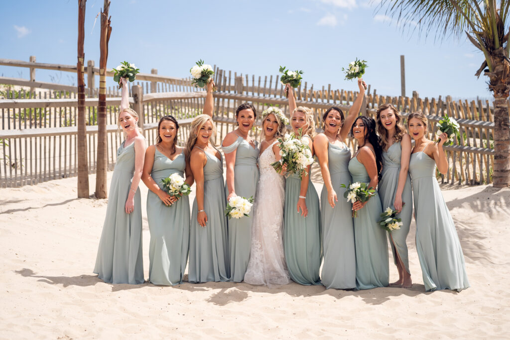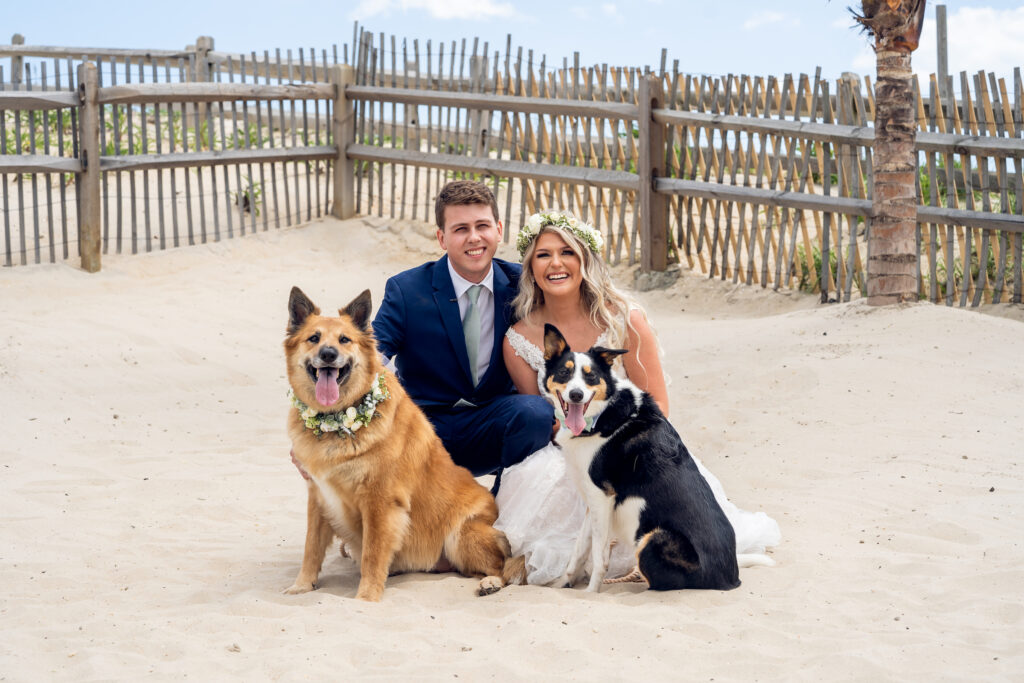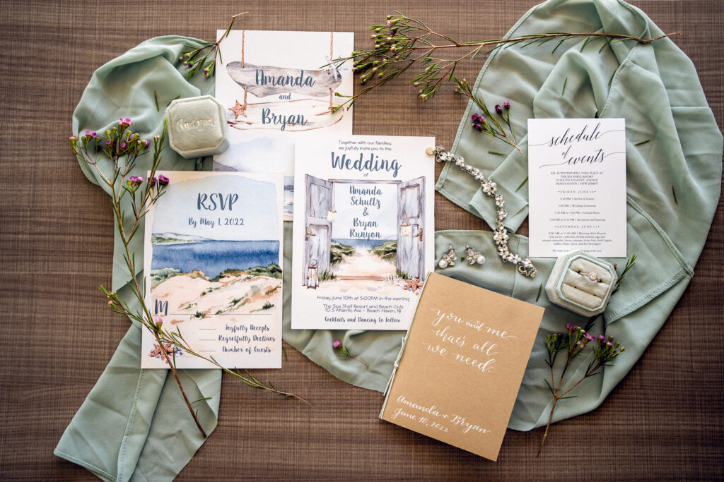 Knowing that the beach was special to both of them, the couple searched tirelessly to find the perfect location for their June 2022 dream wedding. The Sea Shell Resort and Beach Club on Long Beach Island offered a laid-back, cocktail-hour-style wedding right on the water. Sand dunes created the perfect private beach scene for a personalized ceremony with friends and family. Amanda’s bridesmaids stunned in dusty-sage dresses paired with the groomsmen’s navy-blue suits. With details like an antique surfboard serving as their guest book and handmade centerpieces of sea glass, starfish and sand dollars, their reception was imbued with the beach theme. Their dogs made an appearance as well—along with signature cocktails named after them. For their first dance song, the couple chose “Settle Down Easy,” by Rebelution.