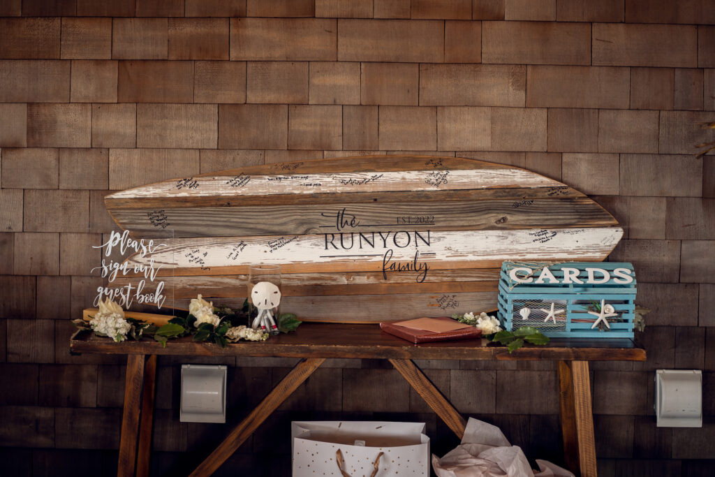 Knowing that the beach was special to both of them, Amanda and Bryan searched tirelessly to find the perfect location for their June 2022 dream wedding. The Sea Shell Resort and Beach Club on Long Beach Island offered a laid-back, cocktail-hour-style wedding right on the water. Sand dunes created the perfect private beach scene for a personalized ceremony with friends and family. With details like an antique surfboard serving as their guest book and handmade centerpieces of sea glass, starfish and sand dollars, their reception was imbued with the beach theme.