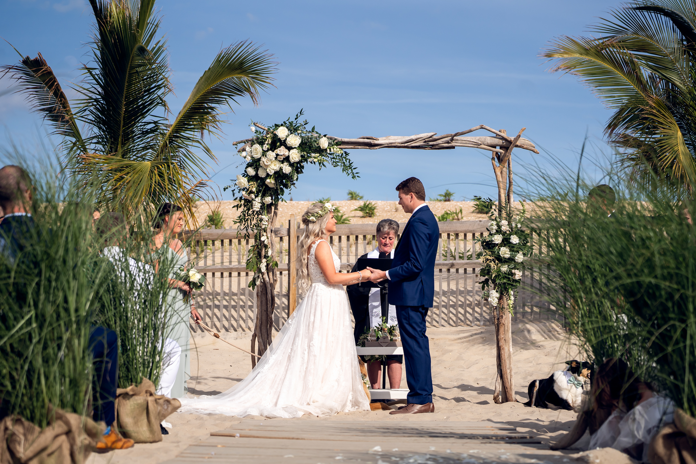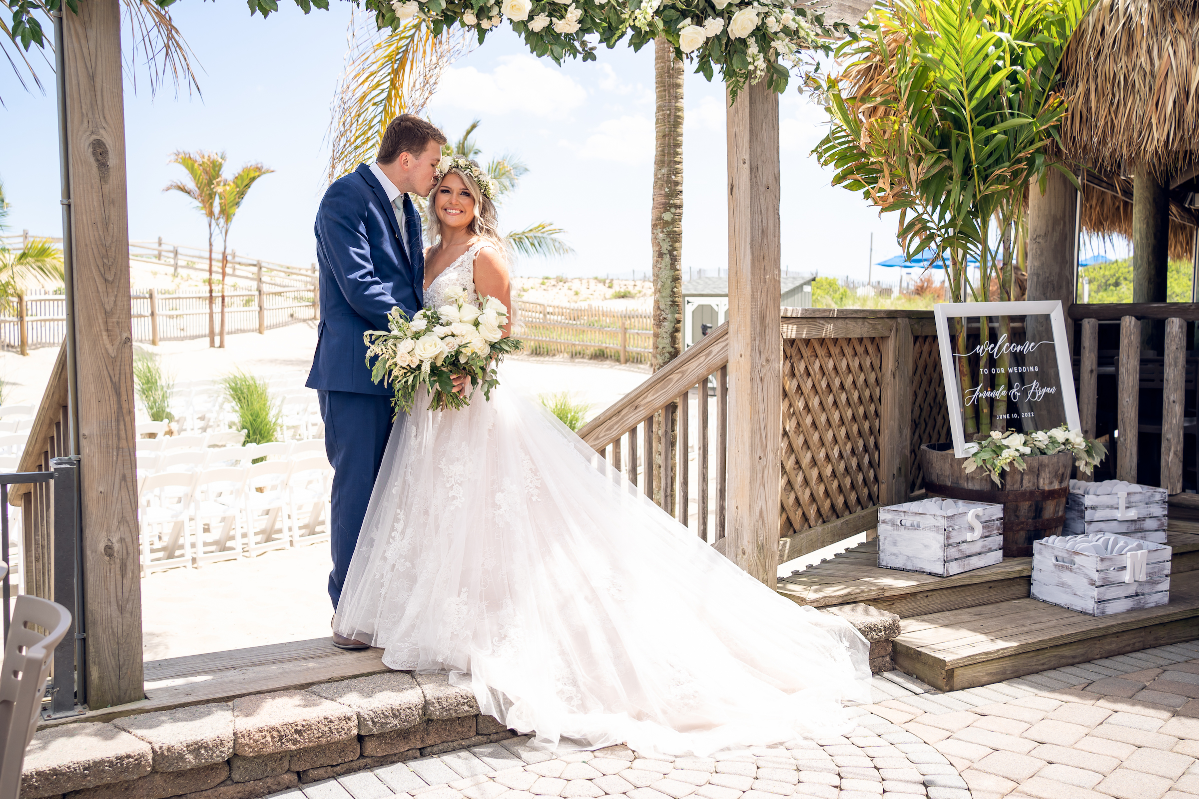Knowing that the beach was special to both of them, Amanda and Bryan searched tirelessly to find the perfect location for their June 2022 dream wedding. The Sea Shell Resort and Beach Club on Long Beach Island offered a laid-back, cocktail-hour-style wedding right on the water. Sand dunes created the perfect private beach scene for a personalized ceremony with friends and family. With details like an antique surfboard serving as their guest book and handmade centerpieces of sea glass, starfish and sand dollars, their reception was imbued with the beach theme.