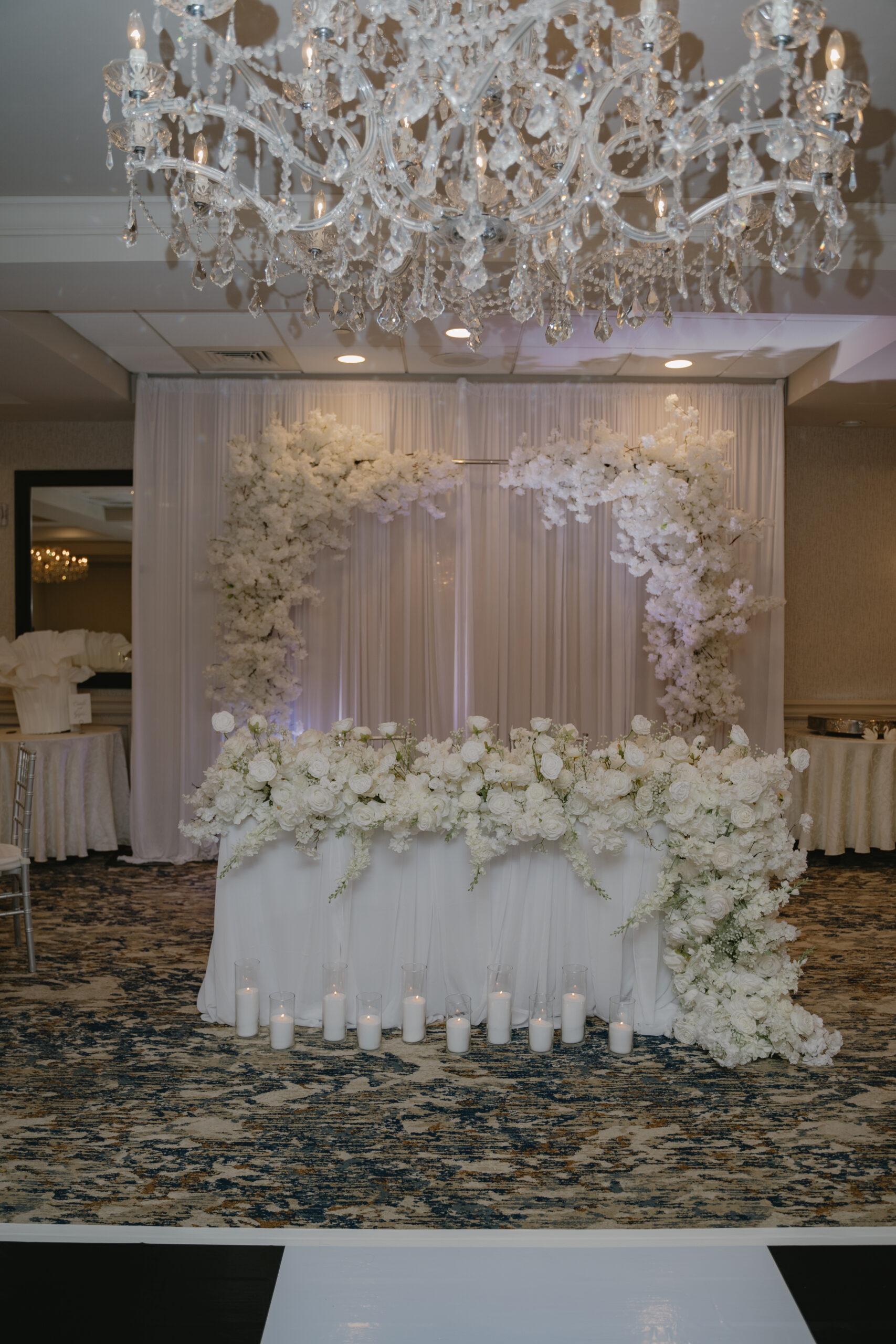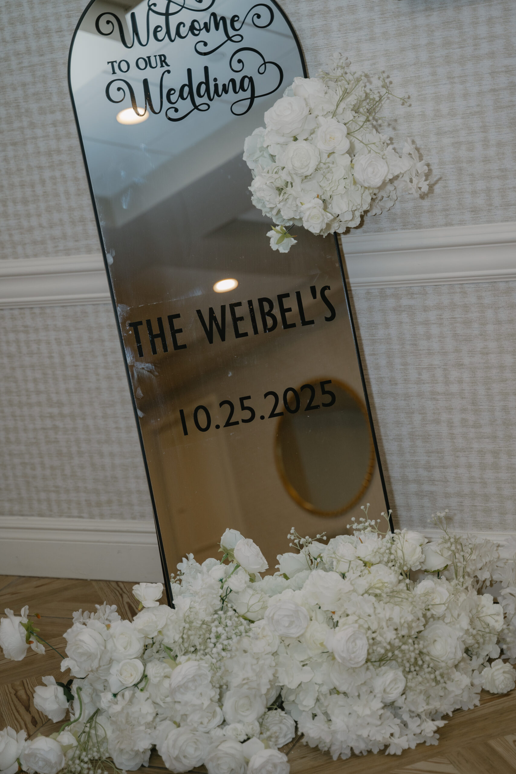 Their dance floor was wrapped in black and white. The menus were black and white. The floral centerpieces and backdrop for sweetheart table were all white.