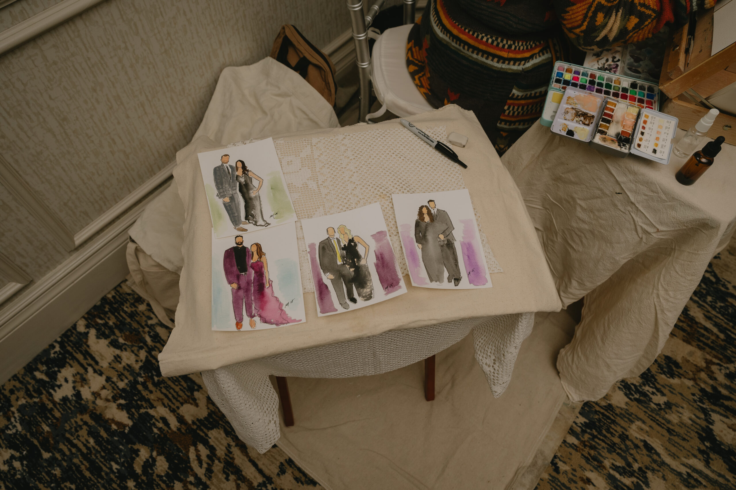 For favors they hired a live painter who drew guest portraits for everyone who attended.