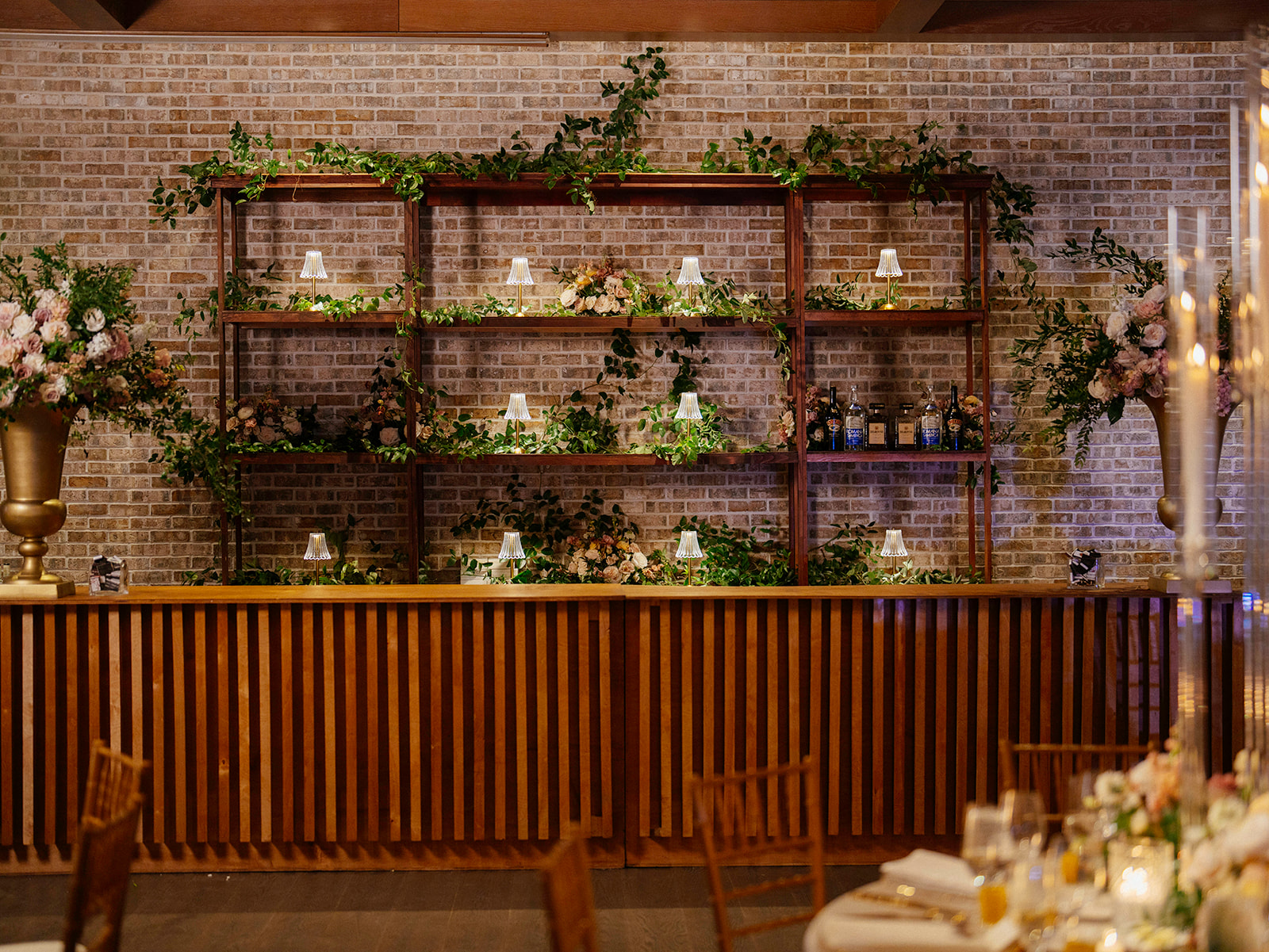 As the reception began, guests stepped into a ballroom transformed into a candlelit dreamscape, where blush and ivory florals intertwined with soft greenery. Members of the band flanked the entrance on platforms with brass instruments, welcoming guests with high energy.