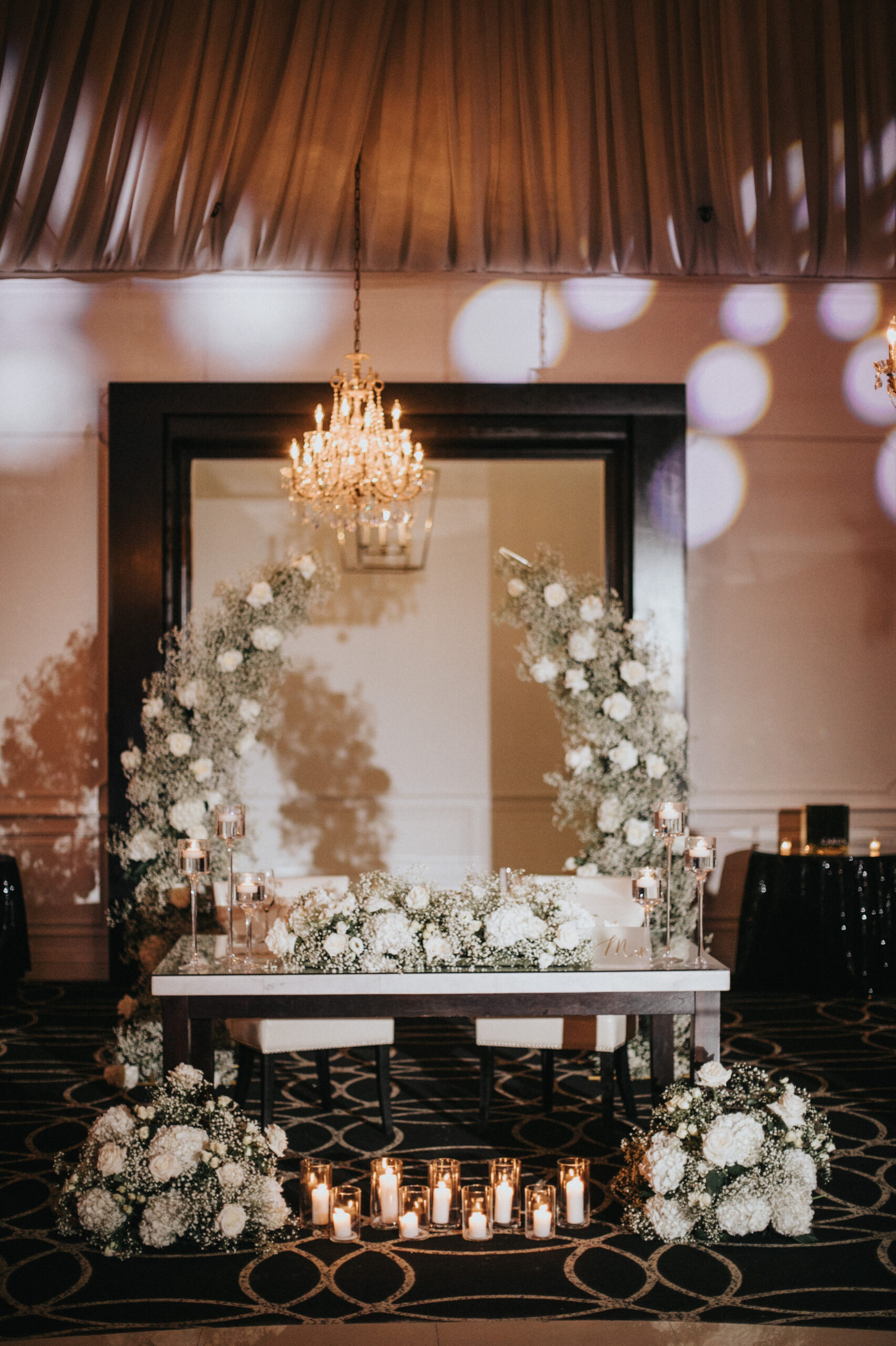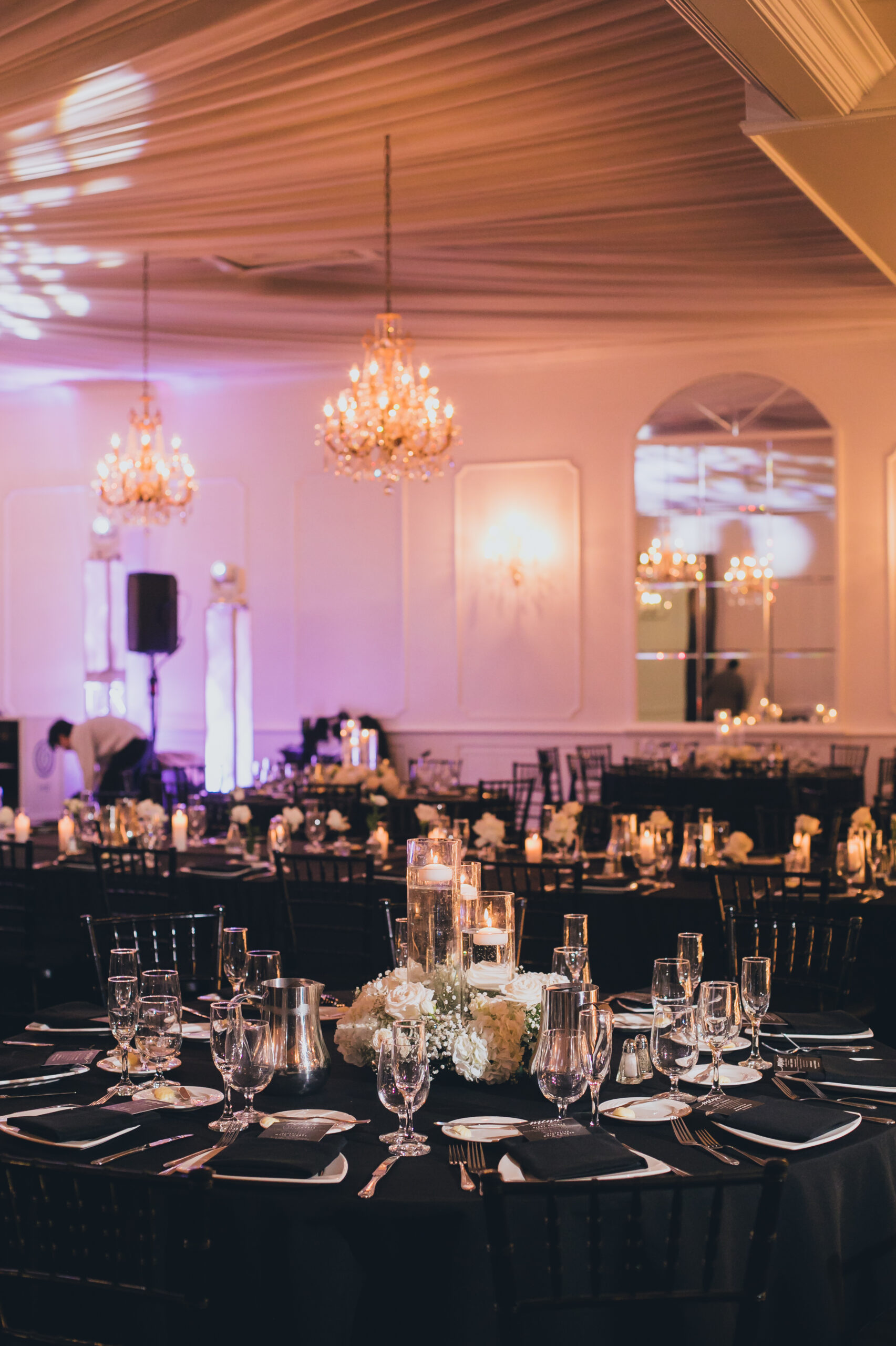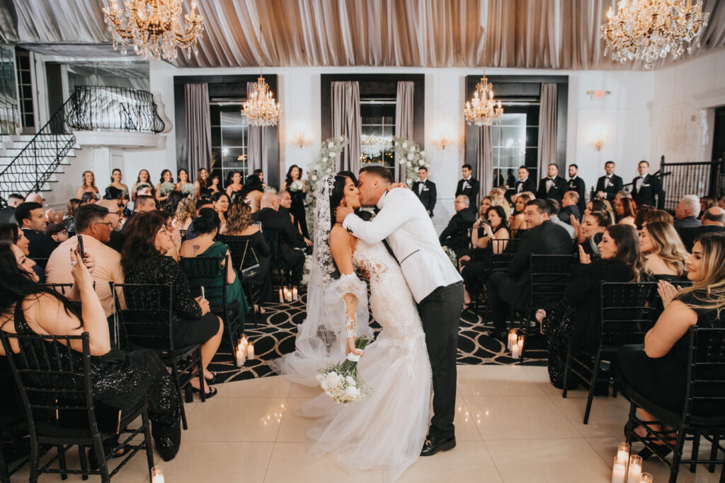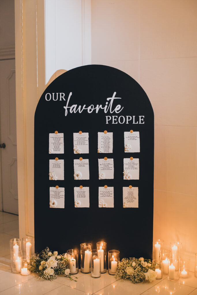 Their elegant wedding day vibe was punctuated with a black and white aesthetic. They were going for a very “classic and modern romantic” look with baby’s breath and candles incorporated throughout the decor.