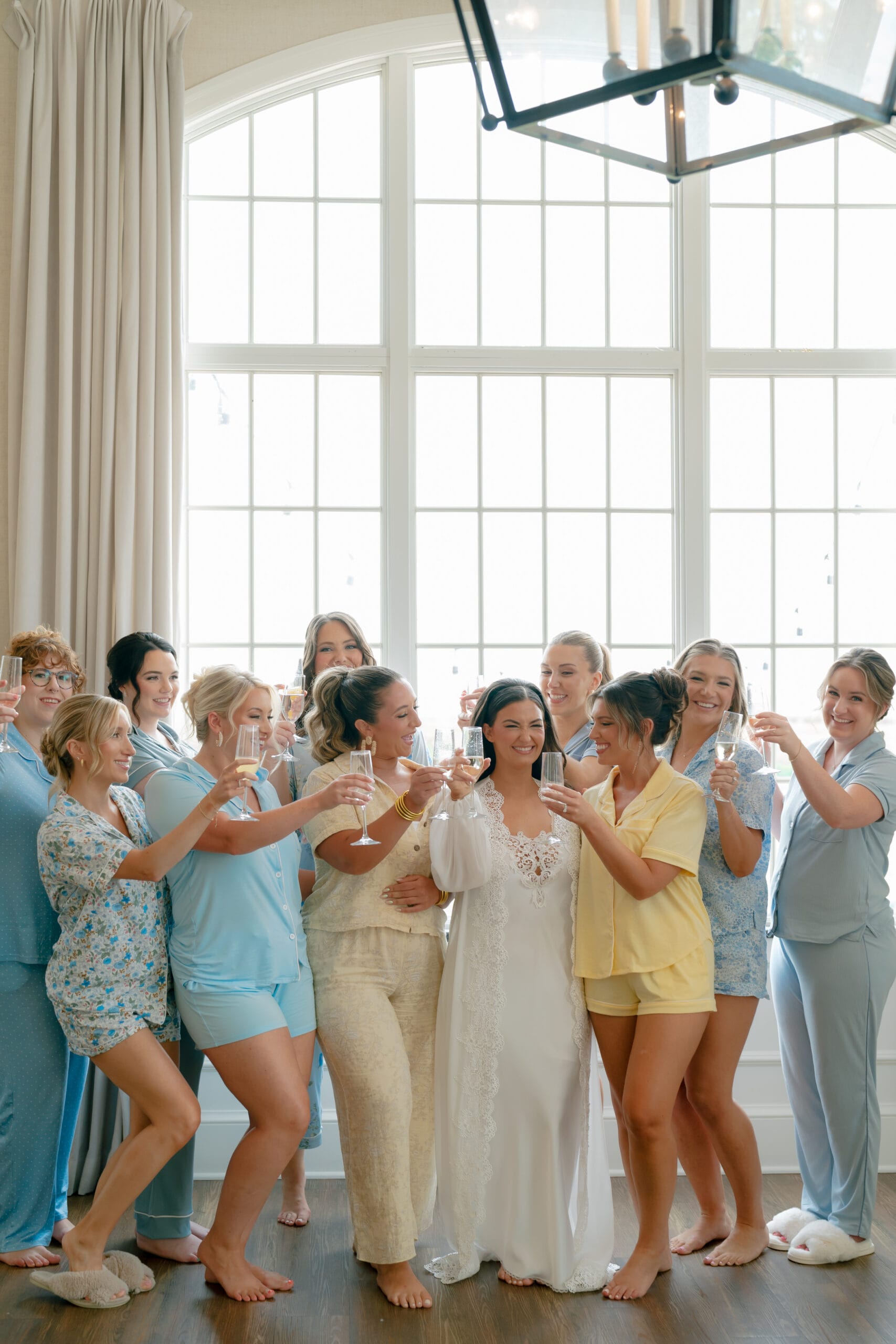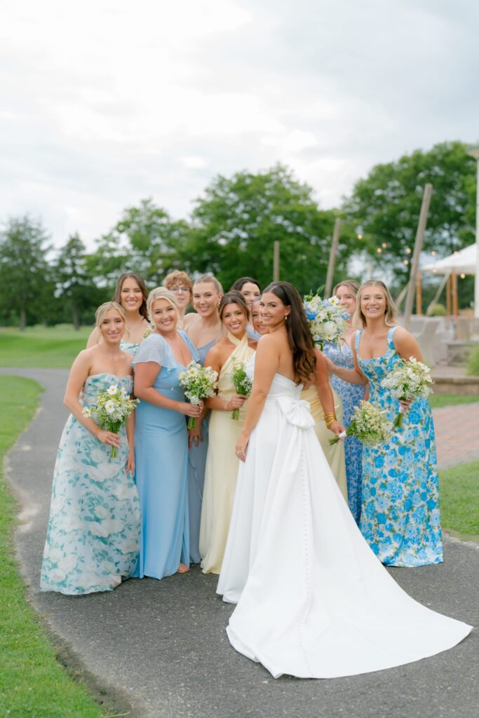 The bridesmaids all wore their own blue/patterned dresses and the MOHs wore yellow.