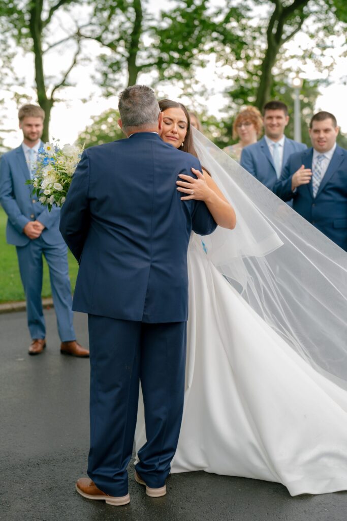 “Right as we started walking down the aisle,” says Arianna, “the sun broke through the clouds and the timing couldn’t have been more perfect, as ‘Here Comes the Sun’ played as our pre-planned processional song—fate!”
