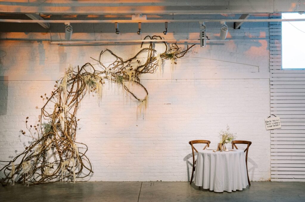 “One of our favorite and most stunning elements was the dried floral installation on the wall by the dance floor,” says Bailey. “With climbing wisteria vine, hanging amaranthus, and dartura pods, it was a show-stopping moment that provided a beautiful backdrop for the dance floor and added to the evening’s autumnal atmosphere.