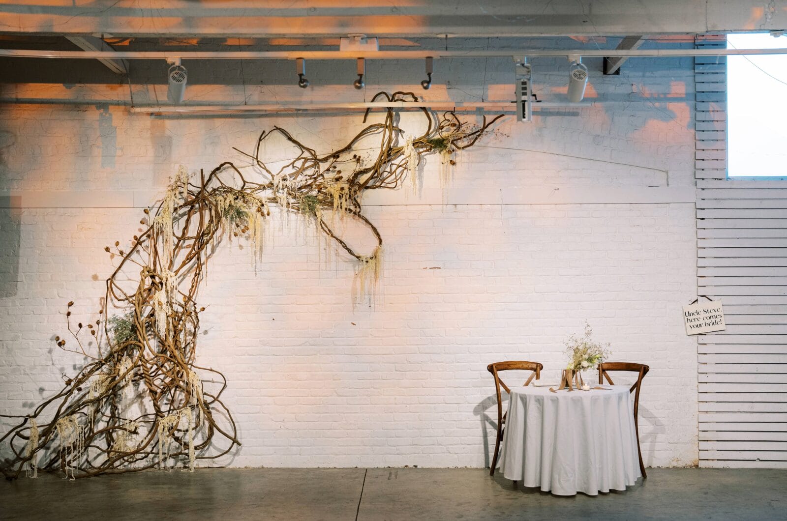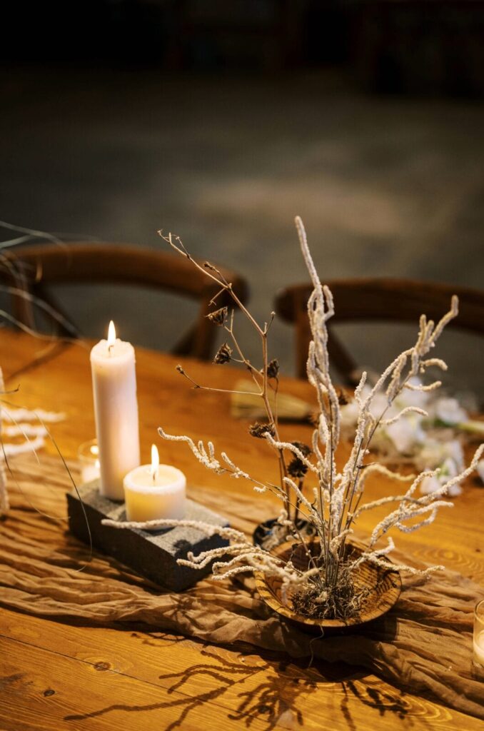 Dried floral arrangements, melty pillar candles and more elements created, “a warm, autumnal vibe” at Bailey and Steve’s wedding at the Whitechapel Projects on November 3, 2023.