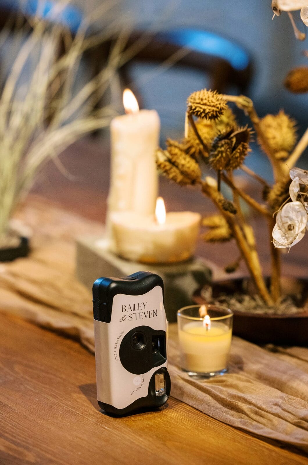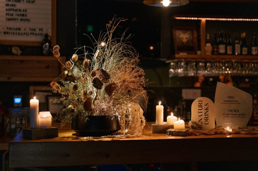 Throughout the venue, they continued the textured, industrial aesthetic. Candlelight and large dried floral arrangements decorated the bar and guest book areas, accented by wooden and stone drink signs that added a raw, natural touch.
