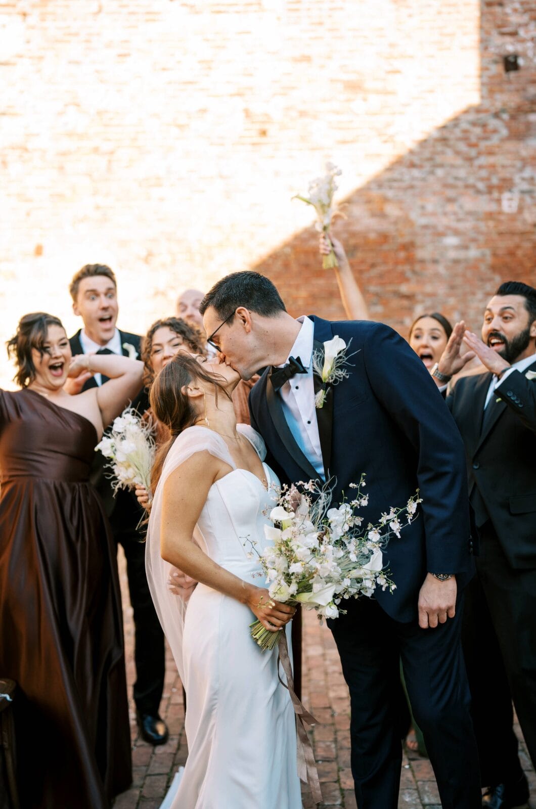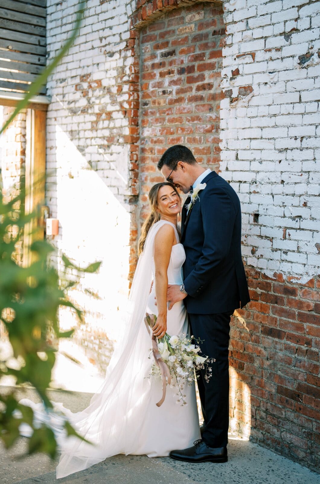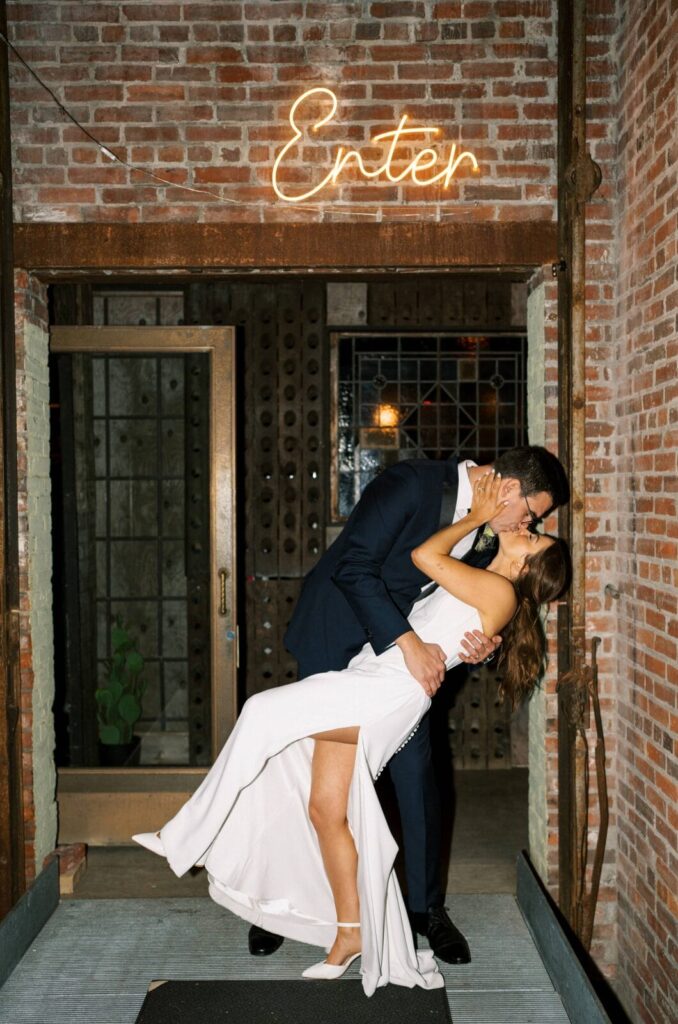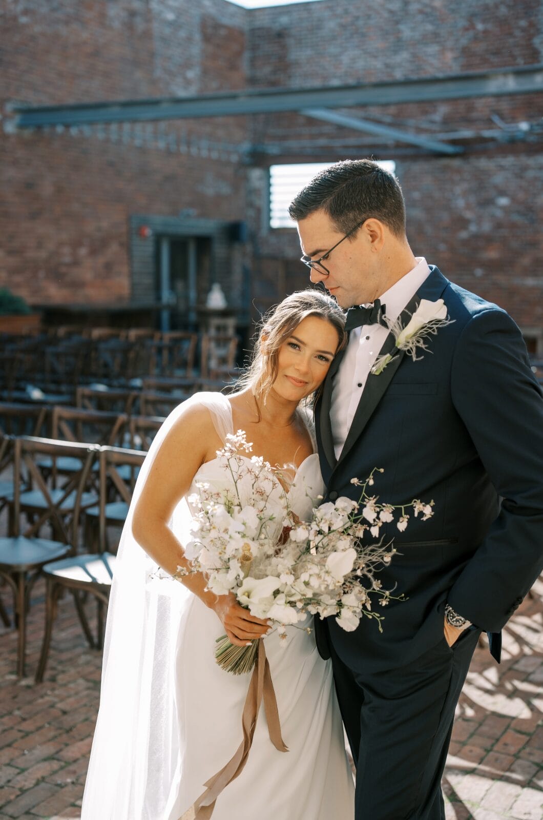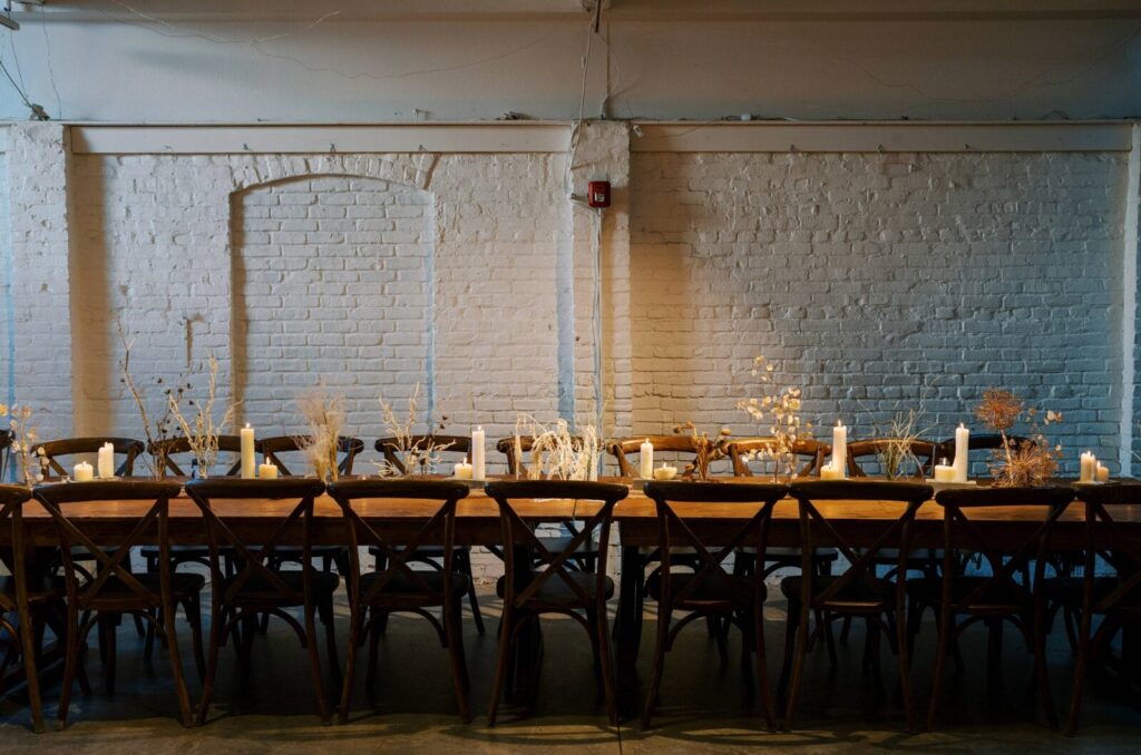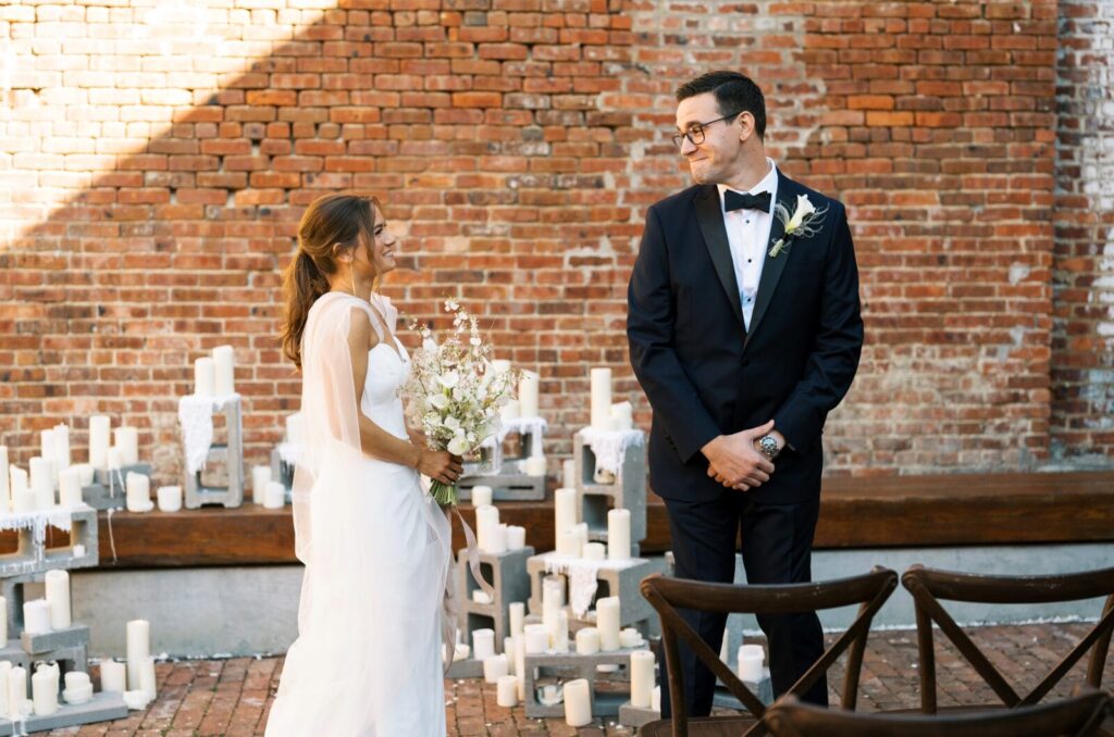 The ceremony took place in the venue’s brick courtyard, where they created, “a moody and intimate setting with melty pillar candles on large cinderblocks, casting a soft glow against the brick as we exchanged vows.”