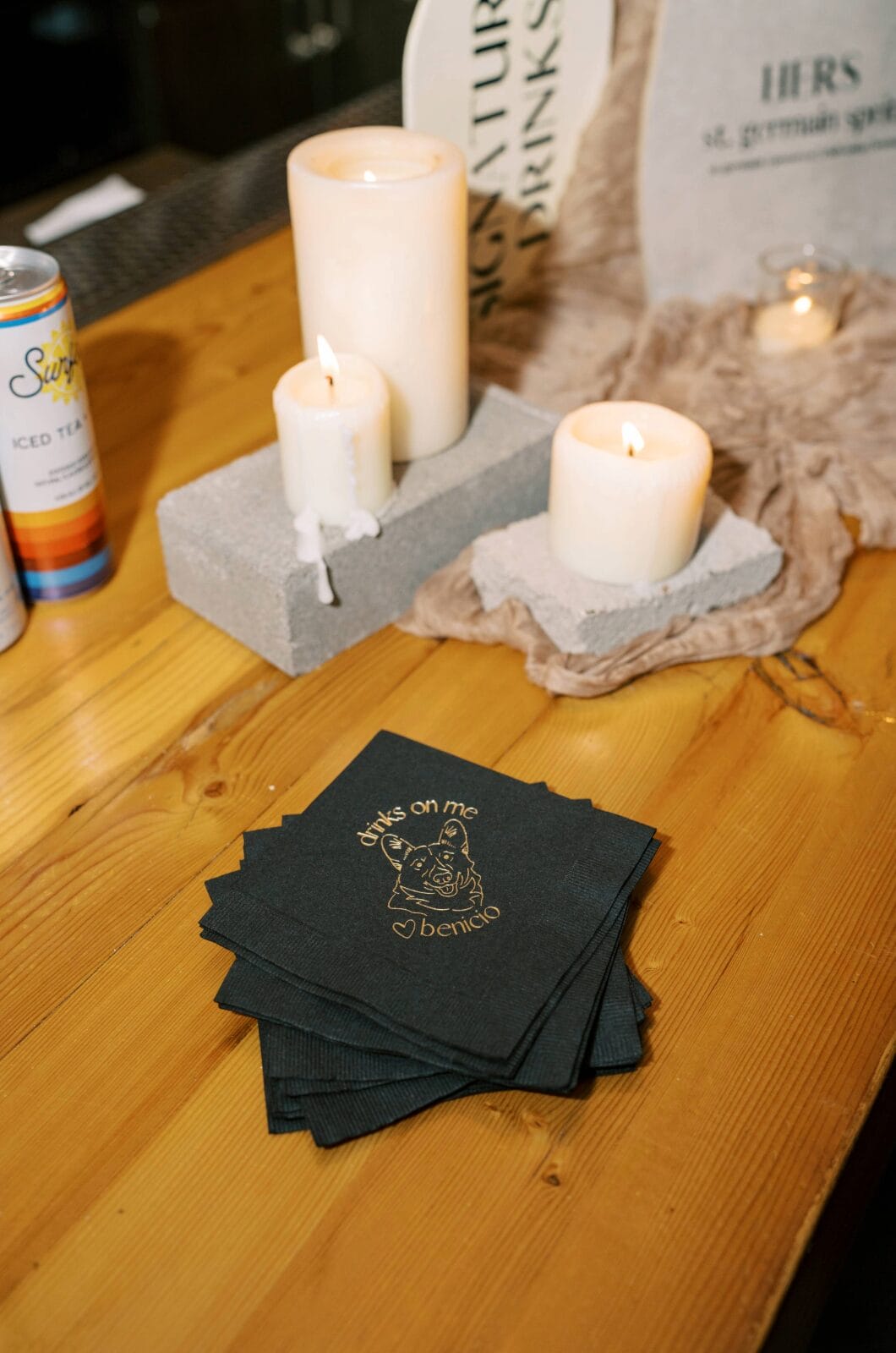 Pin-spot Lighting: Eagle Production Co. | Custom Napkin Art: Lil Peggy Hill ~ Maggie Green | Custom Bridal Ribbon: Dyed By Audrey | Bridal Party/Sister Gifts: West Village Tribe | Custom Scented Candle: Alchemy Scent Bar Montclair | Late Night Food: McDonald's