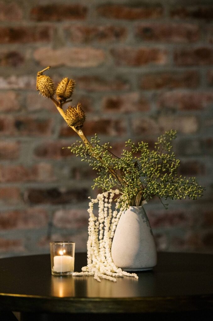 “We kept the floral arrangements minimal and intentional, using dried single-element florals in thrifted bowls and various vessels running down the center of the tables, while structural bud vases in cement vessels added texture and height to the high tops around the space,” says Bailey.