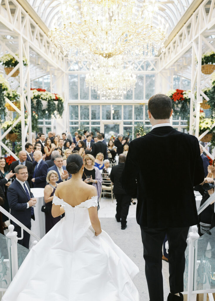 The couple particularly looked forward to the conservatory for their cocktail hour, enhancing the overall classic and charming feel of their winter wedding.