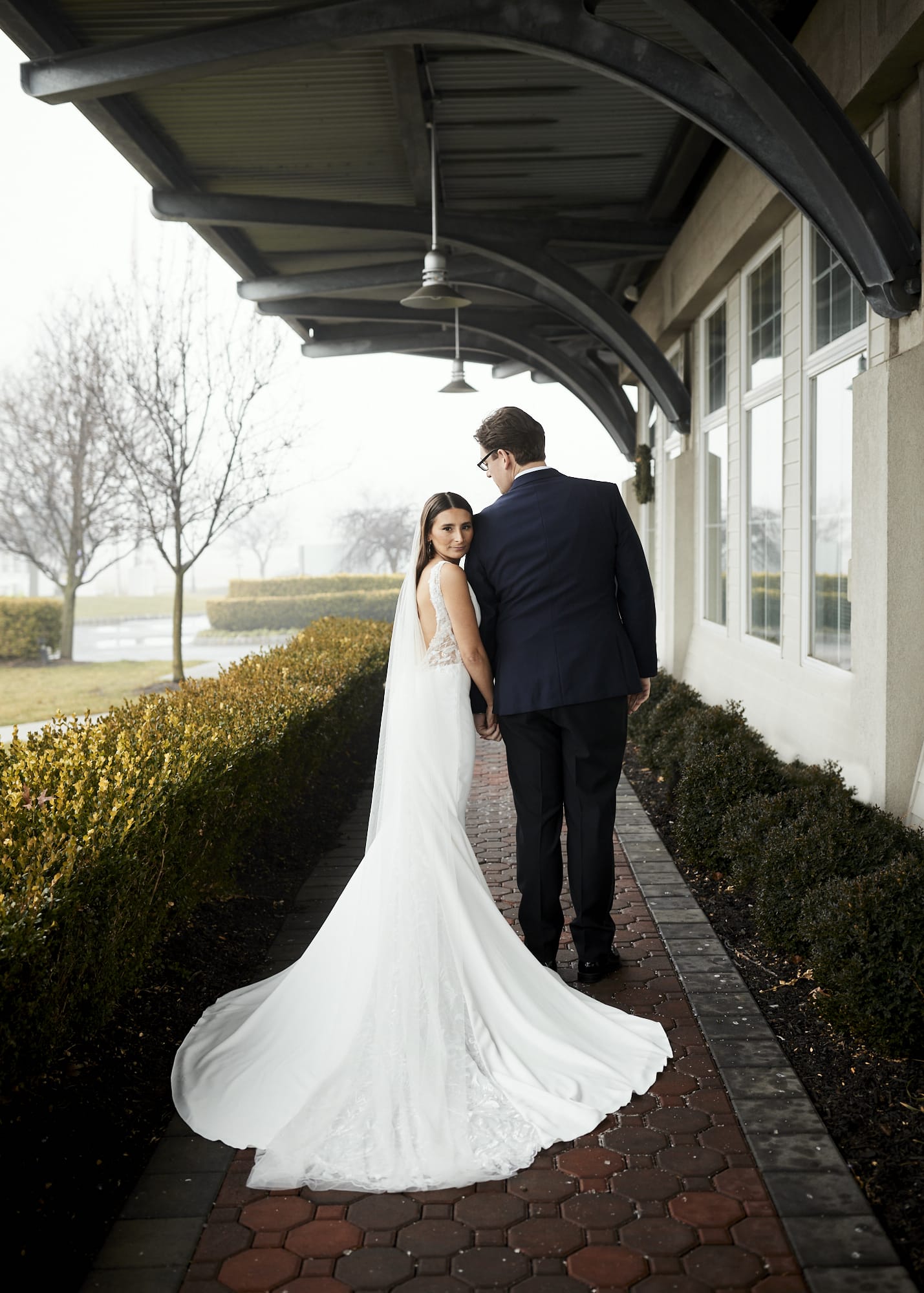 Taylor chose a beautiful Pronovias gown from Seng Couture with a low back. “I have very simple and clean taste but I am very particular about it,” says Taylor. “So I was looking for something that would remain classic through the years but had a little fun to it. I love that from the front my dress looks very clean and classic, but there’s a wow factor in the back that goes along with the NYE, winter wonderland theme.”