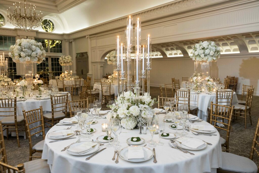 For their winter wedding, they wanted to incorporate a lot of candlelight and white flowers. The Park Château still had its holiday decor on display, which further enhanced the couple’s vision. Caitlin describes the vibe they were after as “very clean, modern, a lot of glamour.”
