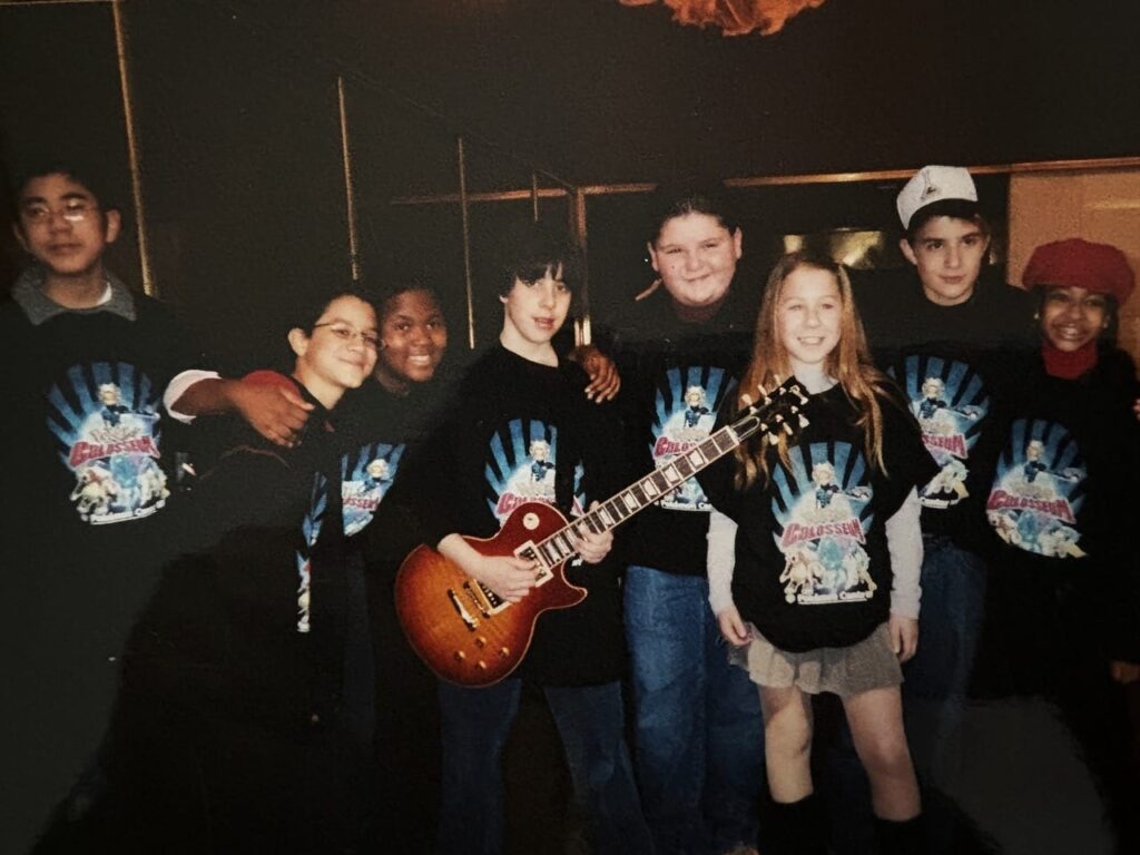 While filming in New York City, Angelo, who was 10 years old, and Caitlin, who was 11, had the best time with their fellow child castmates. (Caitlin was cast as Marta “Blondie,” a backup singer for the band, and Angelo played Frankie “Tough Guy,” the band’s security guard.) They’d all grab hot chocolate in the morning before heading to the set. During downtime, the group would do schoolwork, play video games and have snowball fights. They have fond memories of outings to Dylan’s Candy Bar and Madame Tussauds wax museum. The group’s favorite spot to eat was Benihana for hibachi.