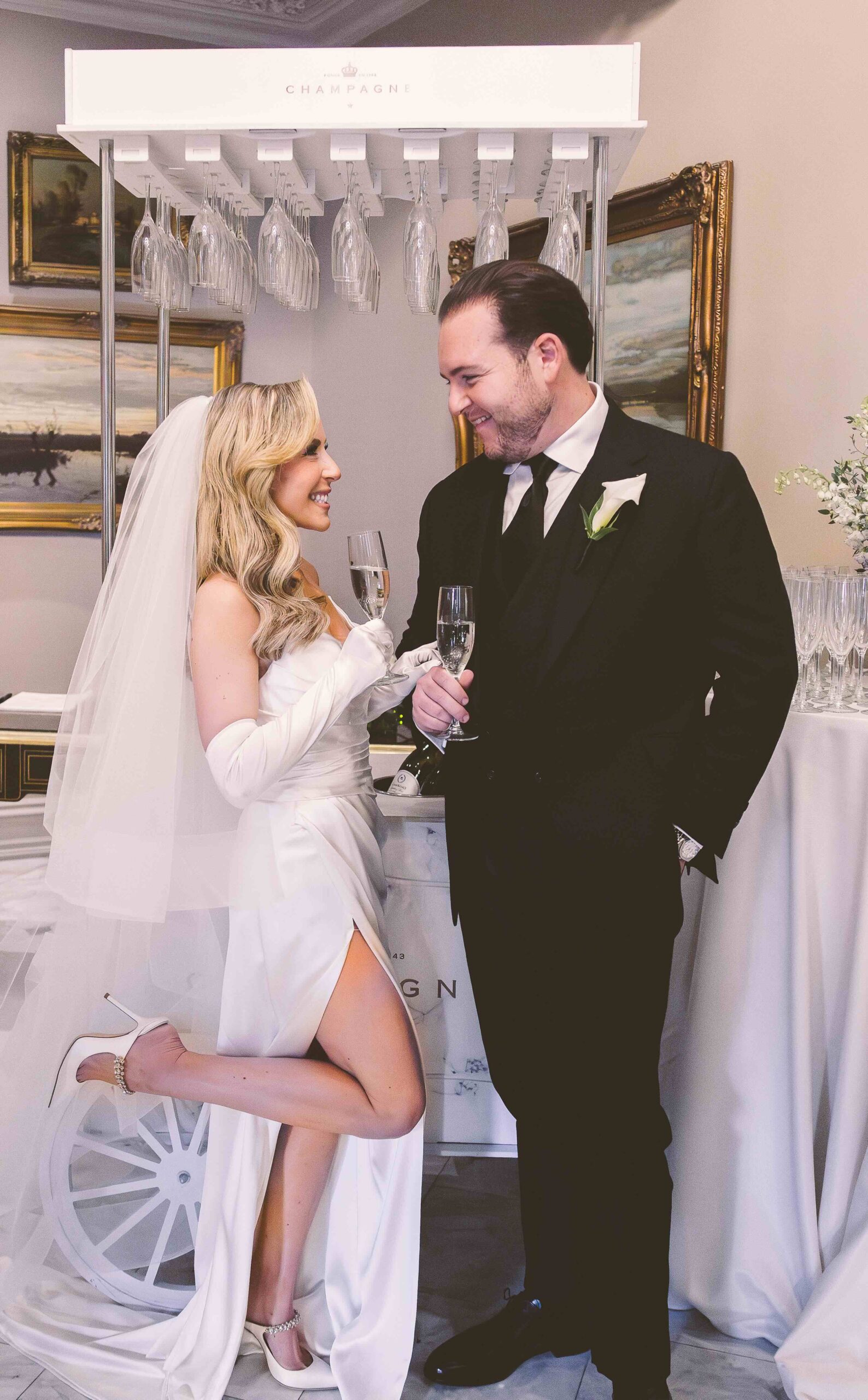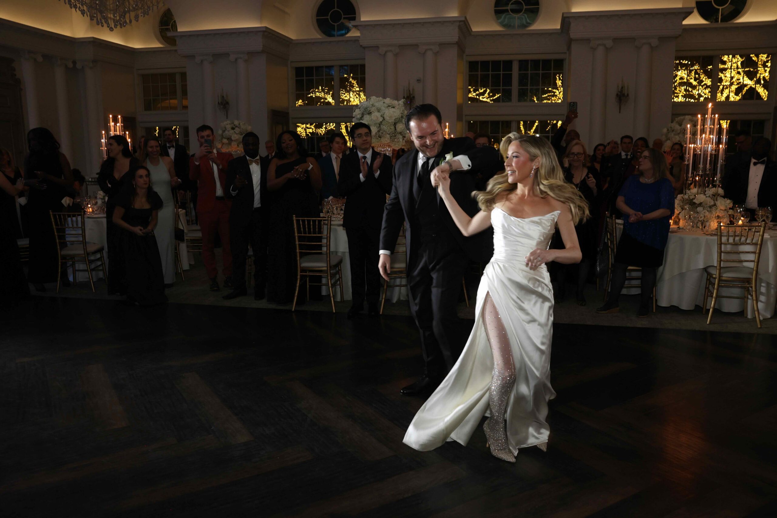 Speaking of glamorous, Caitlin rocked thigh-high sheer, bedazzled Berta boots for the reception. She had three fittings just for the footwear. “They were more high maintenance than the dress,” a sleek strapless gown also by Berta, she says. Angelo looked dapper in a black suit by Cad & The Dandy.