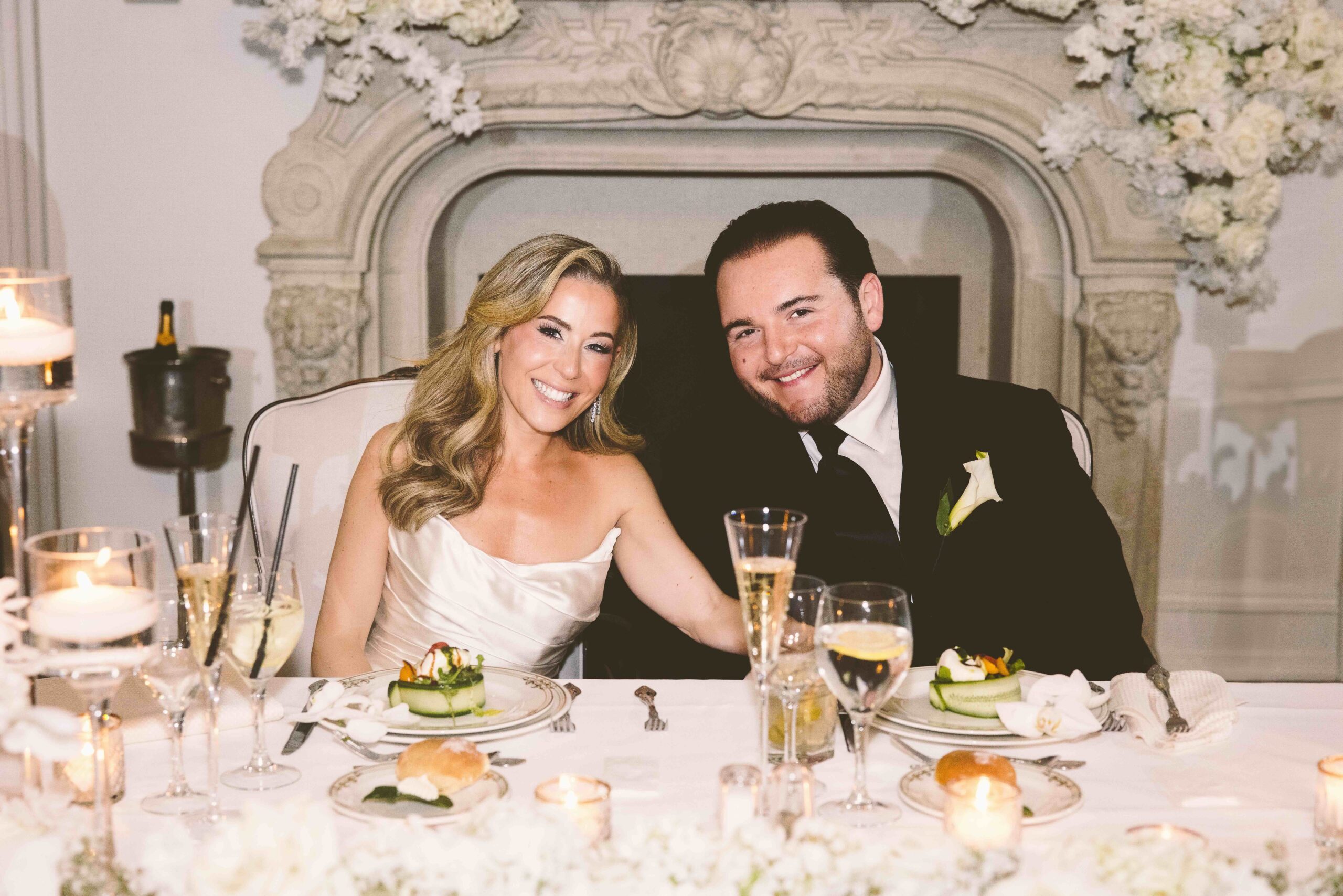 For their winter wedding, they wanted to incorporate a lot of candlelight and white flowers. The Park Château still had its holiday decor on display, which further enhanced the couple’s vision. Caitlin describes the vibe they were after as “very clean, modern, a lot of glamour.”