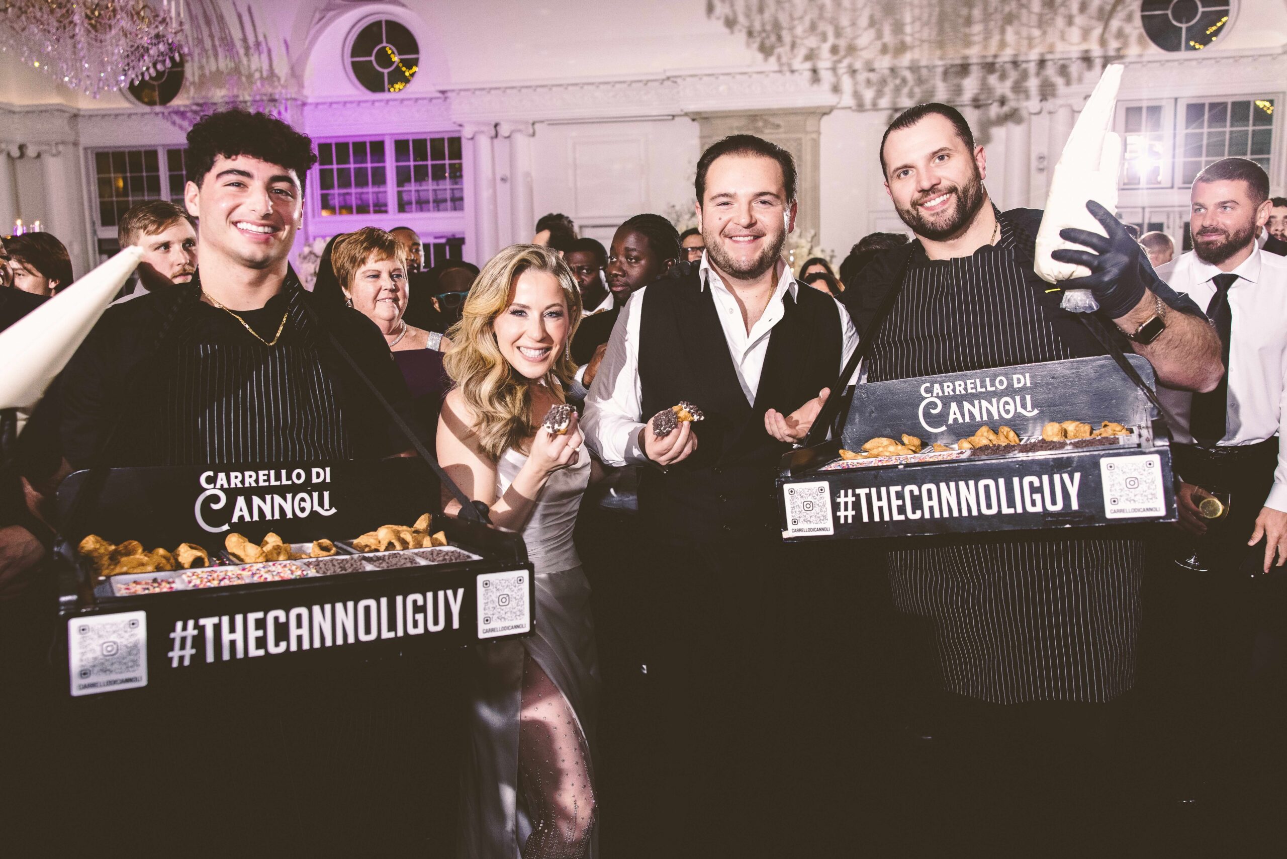 They had a saxophonist, Sax Man Art, who was “so much fun and engaging with everybody,” says Caitlin. There was a live painter who created a portrait of Caitlin and Angelo during their first dance and also sketched portraits of guests throughout the night. When it was time for dessert, Carrello di Cannoli, better known as the Cannoli Guy, made his way onto the dance floor. “He gets right out there and makes cannolis for people and he is dancing around and it’s just high energy the whole time,” says Caitlin.