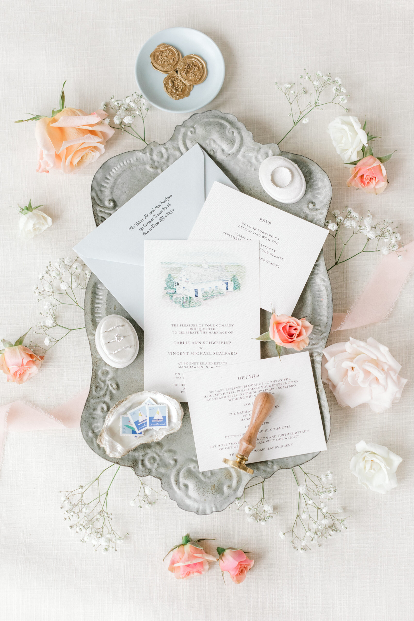 “Our greatest inspiration for our wedding details was Bonnet Island Estate itself,” says Carlie. “After touring the estate, the vintage aesthetic decor with a nautical twist was a dream and we wanted to build on that.”