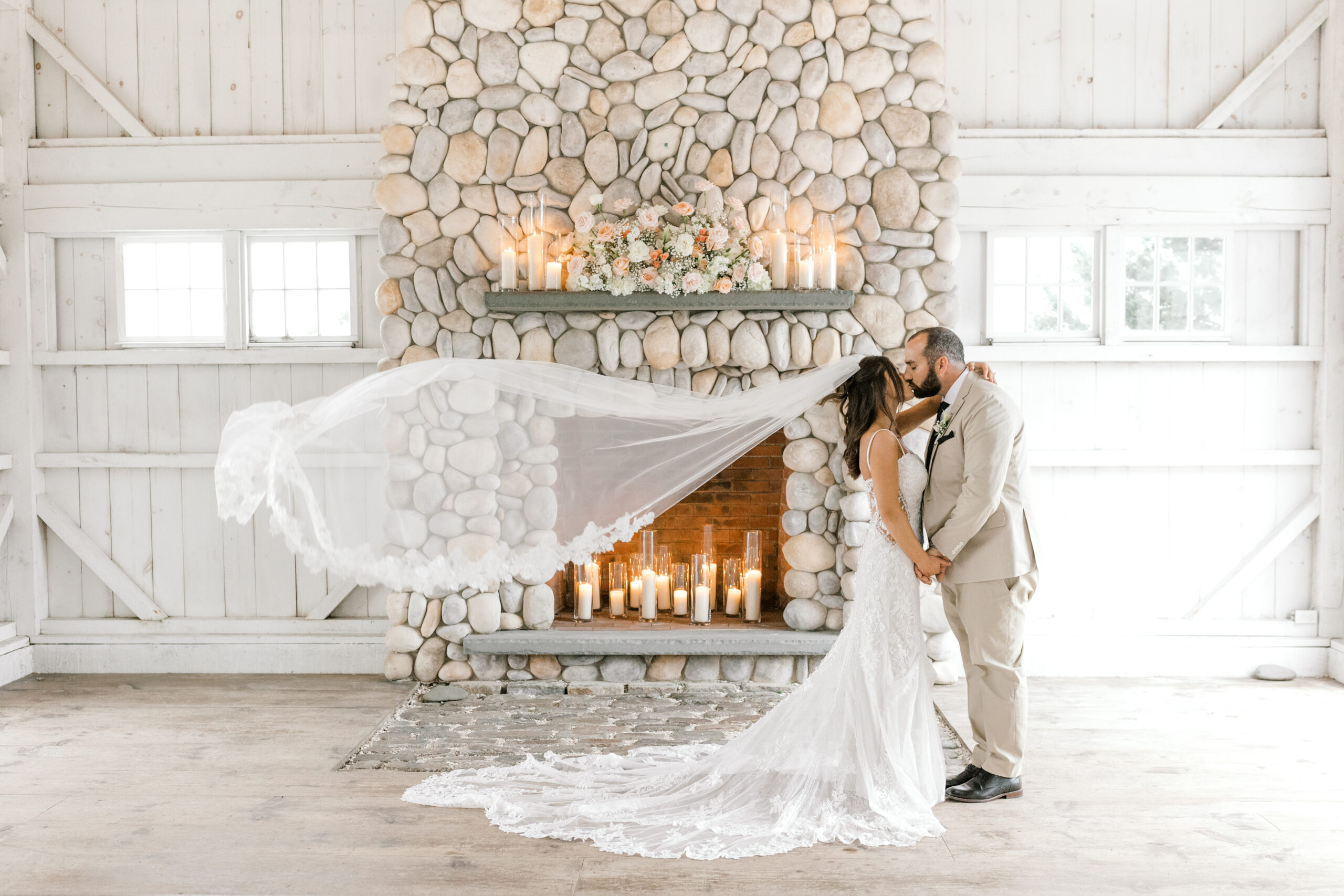 “Our first kiss as a married couple,” says Carlie. “Inside a warm candlelit boathouse chapel on a blustery, rainy day was the perfect and most intimate setting to marry the love of your life.