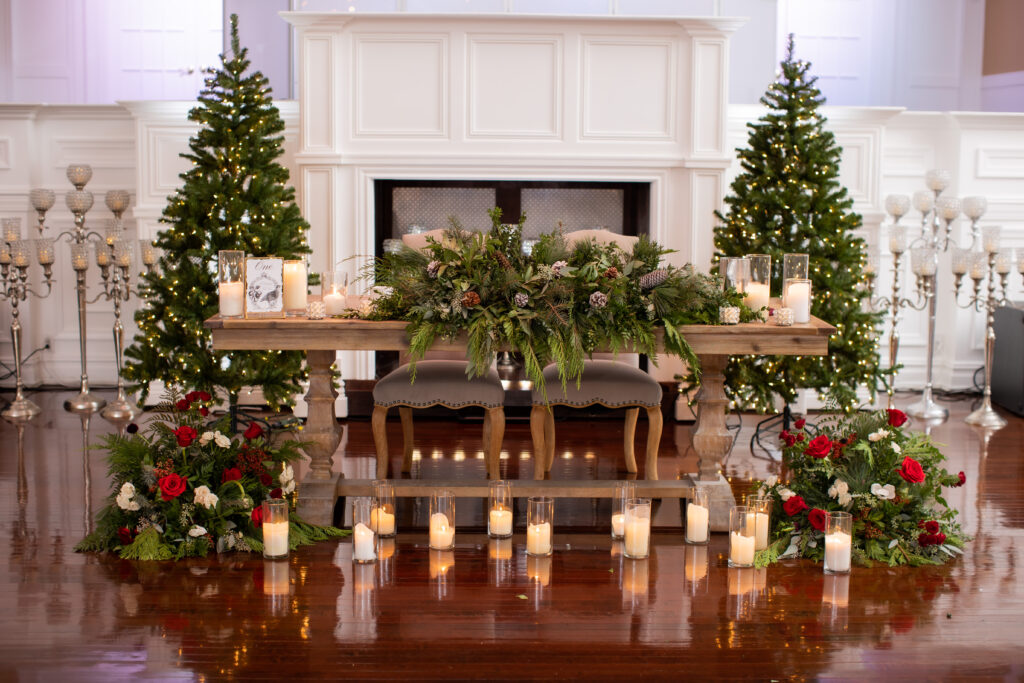 “Our sweetheart table was so romantic and straight out of a Hallmark movie,” says the bride. “Two Christmas trees were placed as a backdrop with three winter floral arrangements with greenery, pine cones, red romantic flowers alongside candles.”