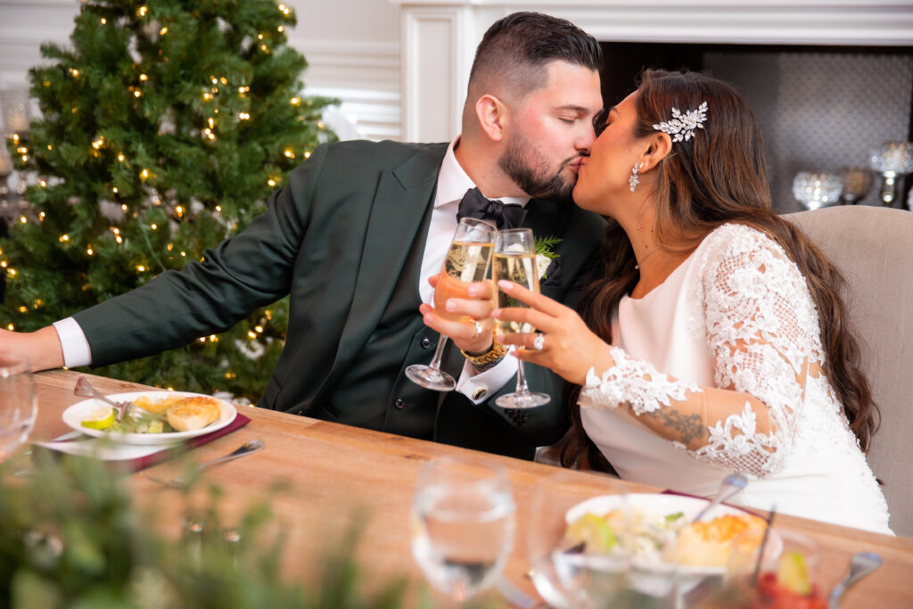 “We had an elegant Christmas-themed wedding at The Hamilton Manor on December 15 2022,” says Charmaine. “Our color scheme was emerald green, burgundy and gold with lots of greenery and winter florals scattered around the venue. Our sweetheart table was so romantic and straight out of a Hallmark movie as two Christmas trees were placed as a backdrop with three winter floral arrangements with greenery, pine cones, red romantic flowers and more lined our table alongside candles.”