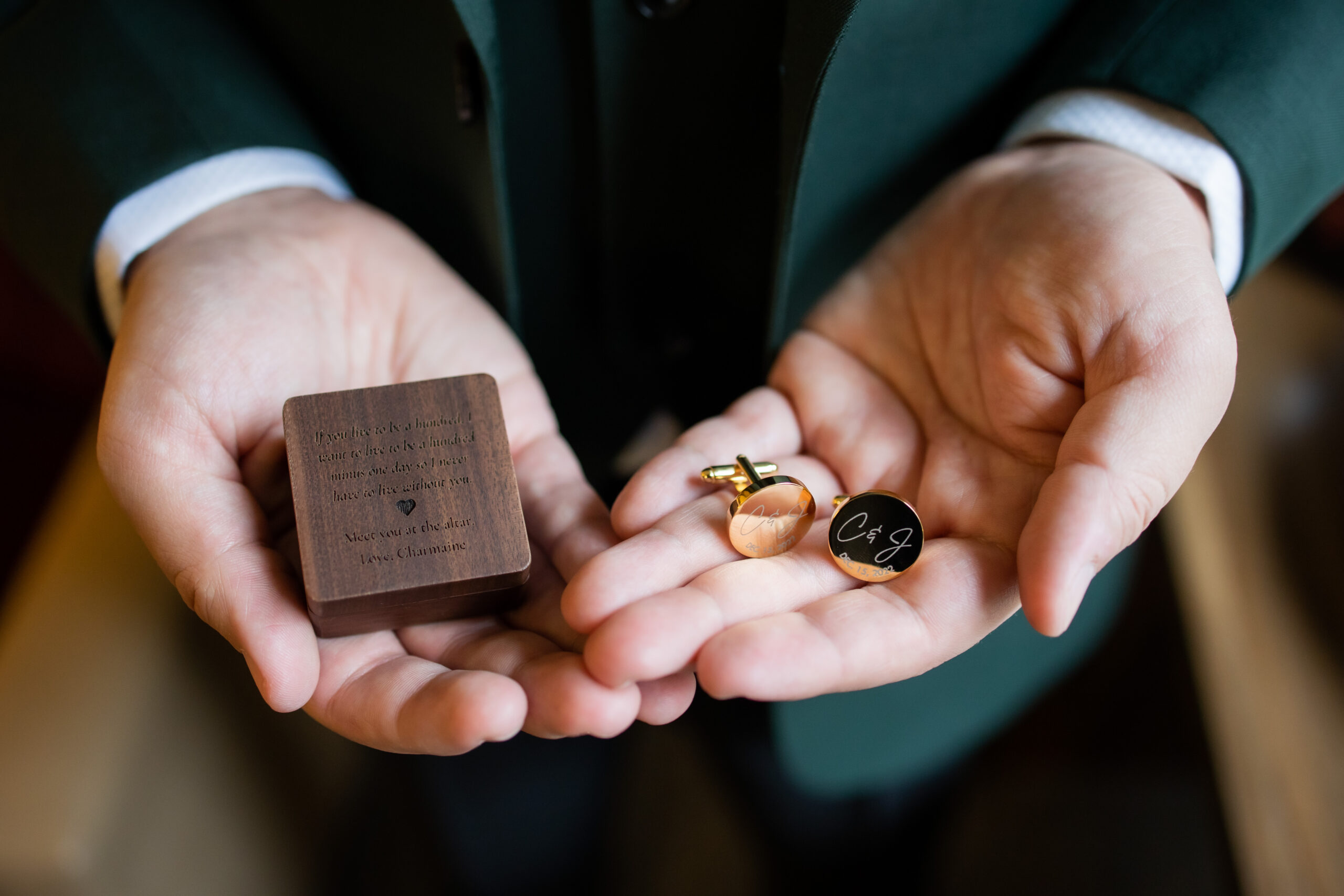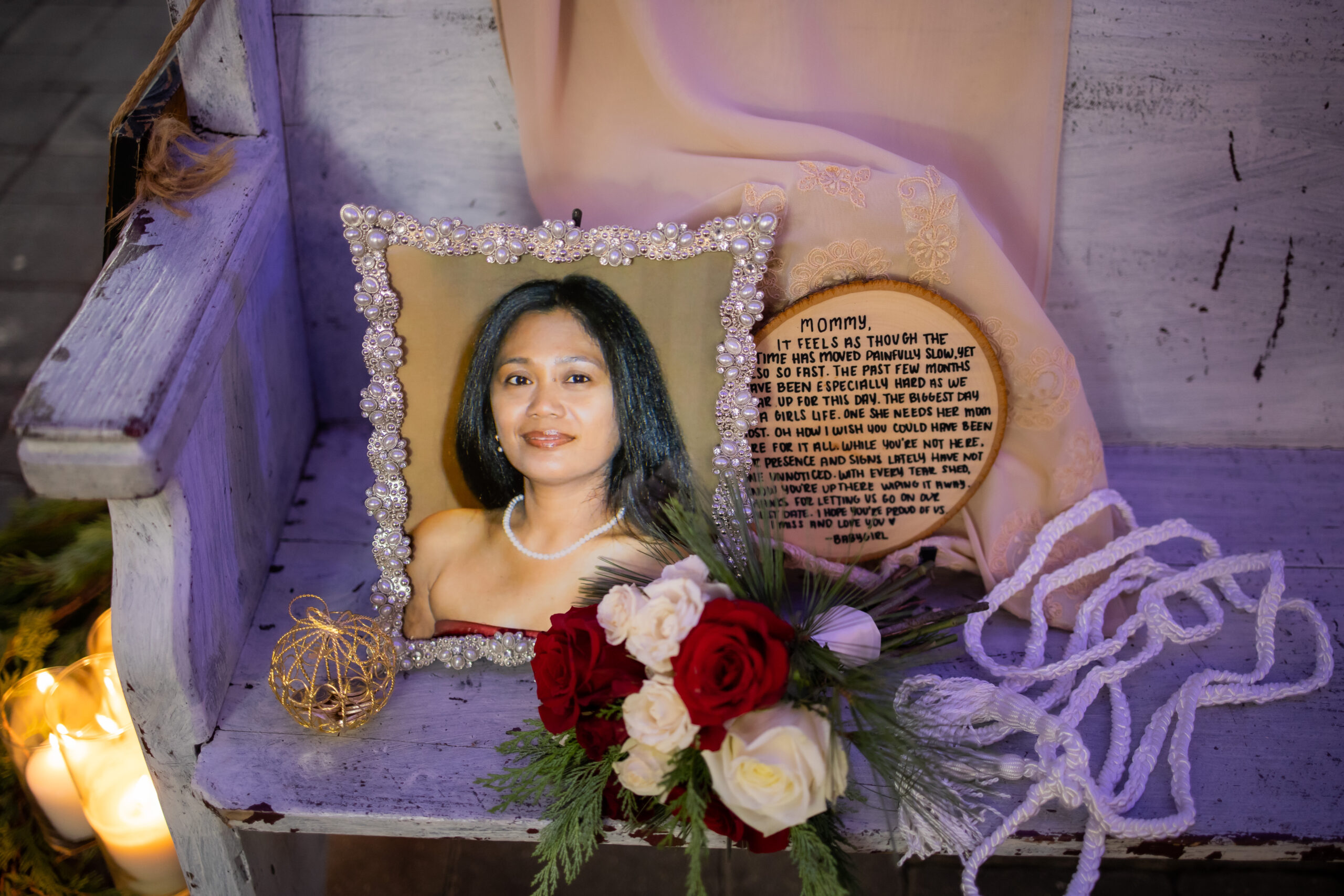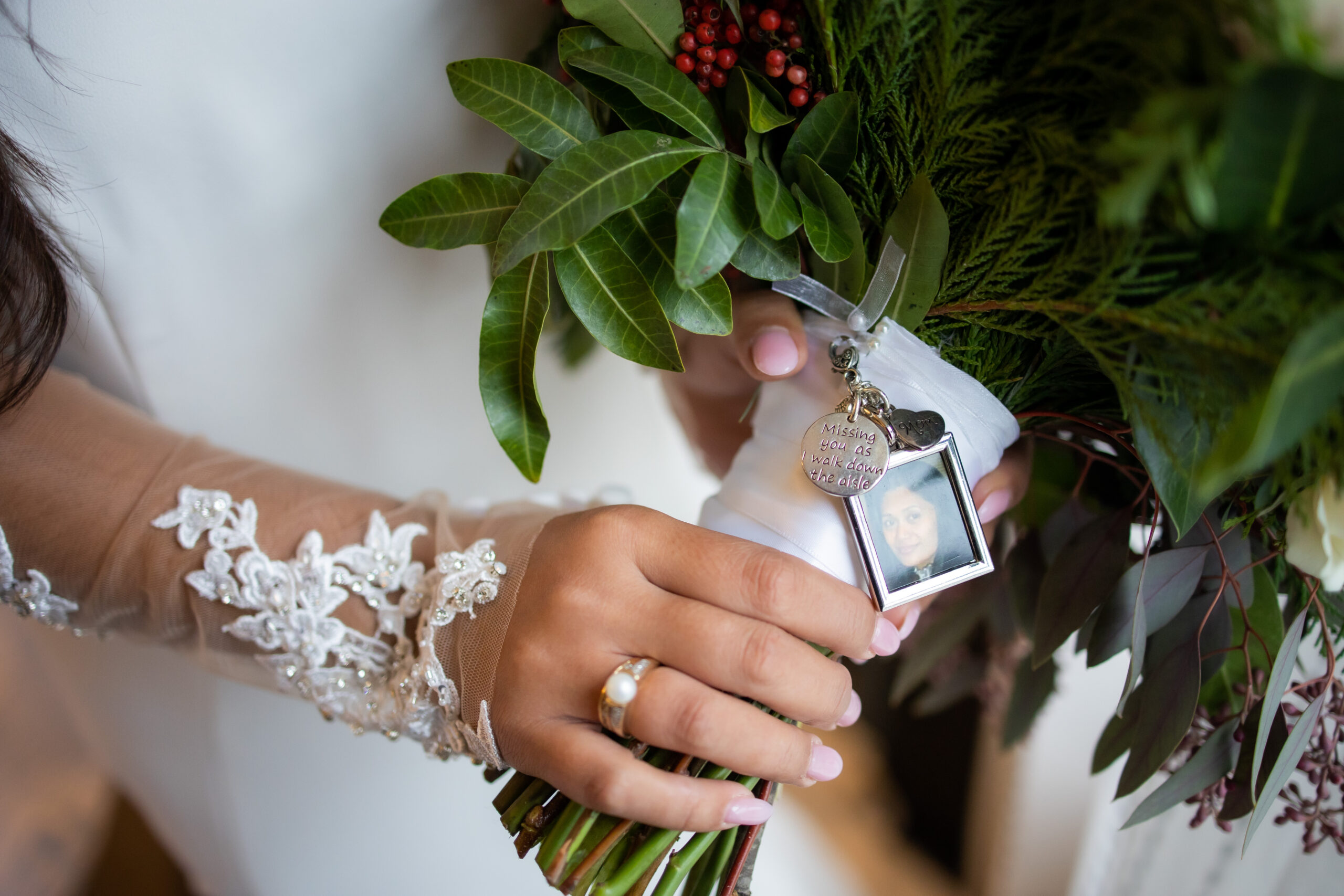 “One special detail I really cherish from our day was making sure that my mom was present for my wedding day,” says Charmaine. “I had a charm of her on my bouquet, we did a moment of silence in her honor during my ceremony, we had a special spot for her at the ceremony on our bench, we had a memory table with her picture alongside our other loved ones on our reception table and we also had a seat reserved for her at the dinner table with her picture and a handwritten note from me.”