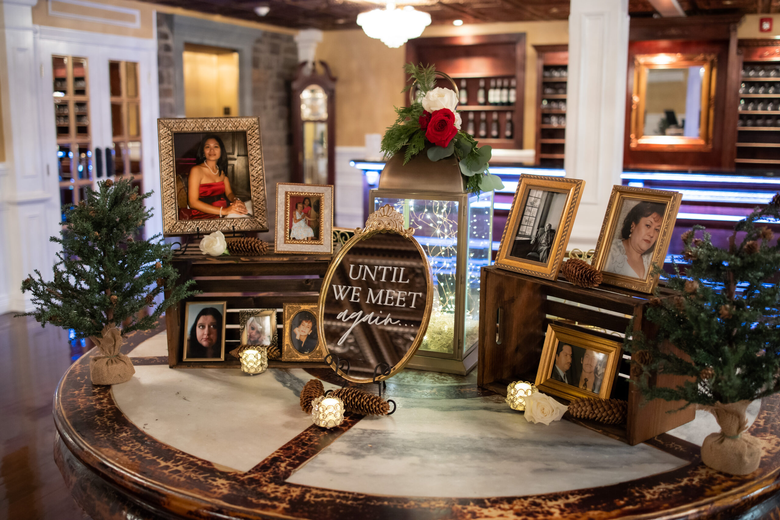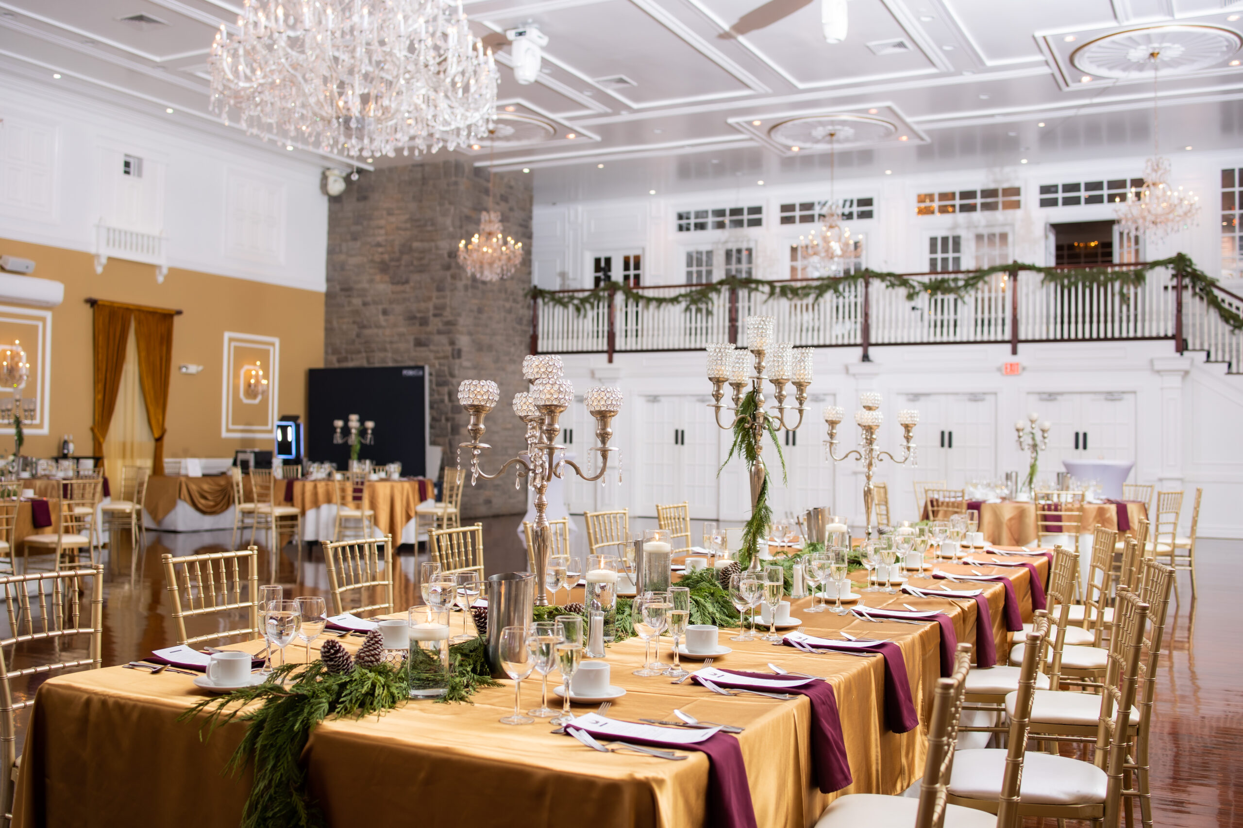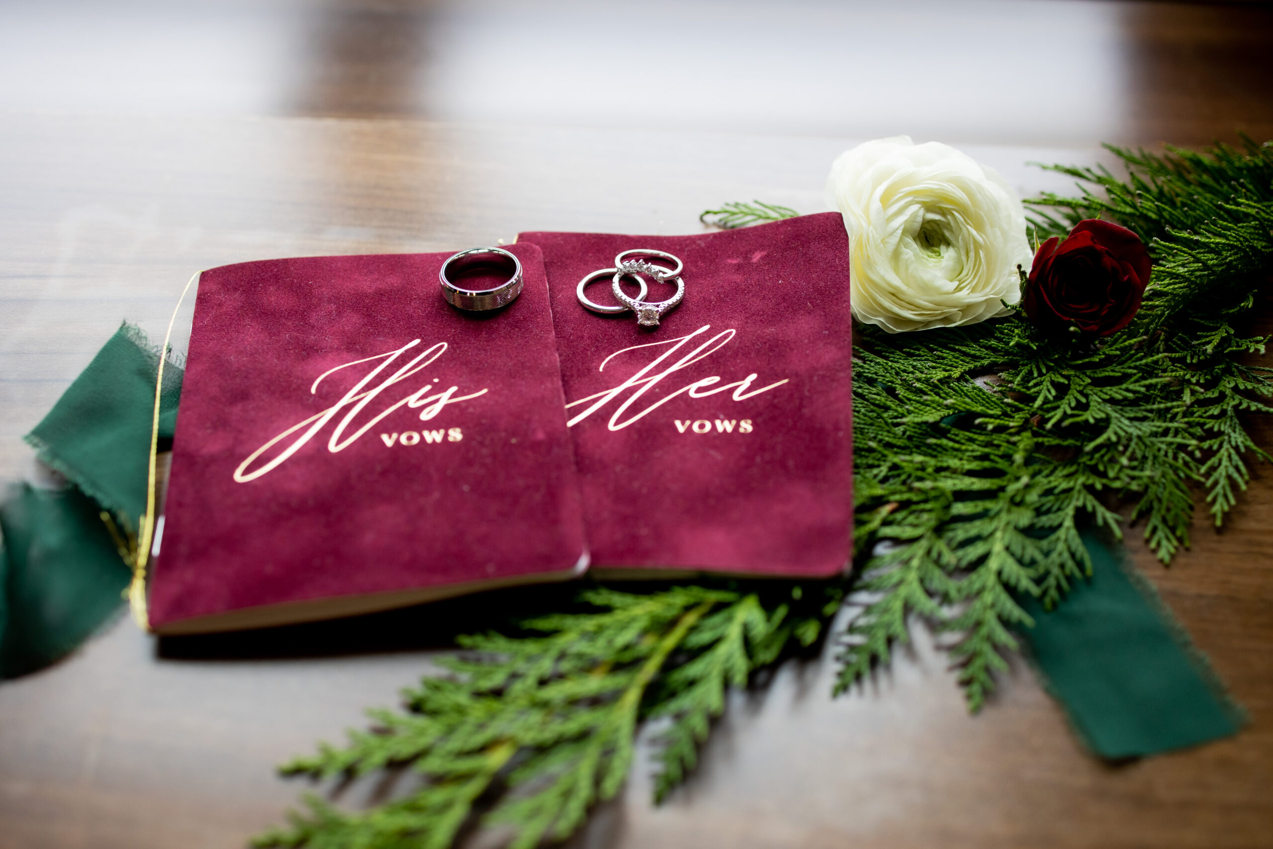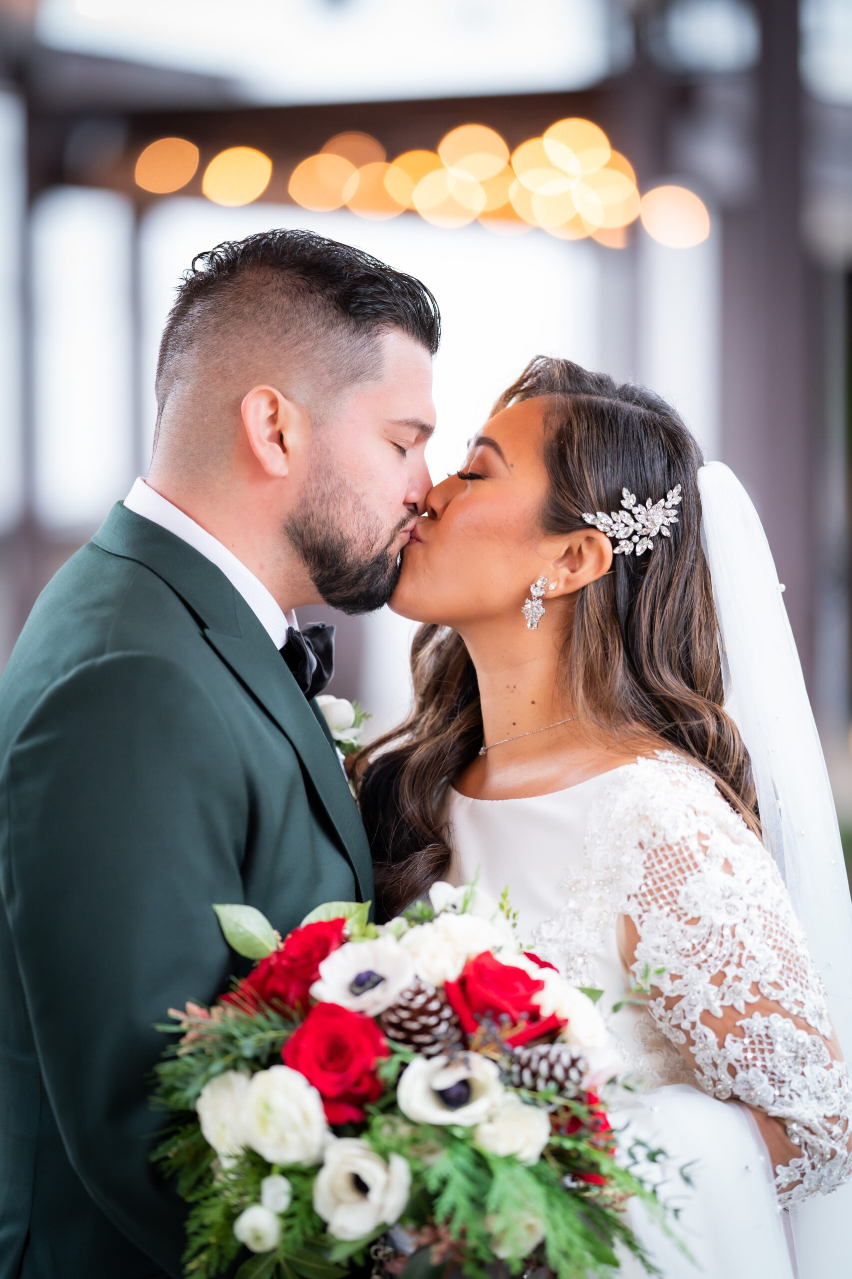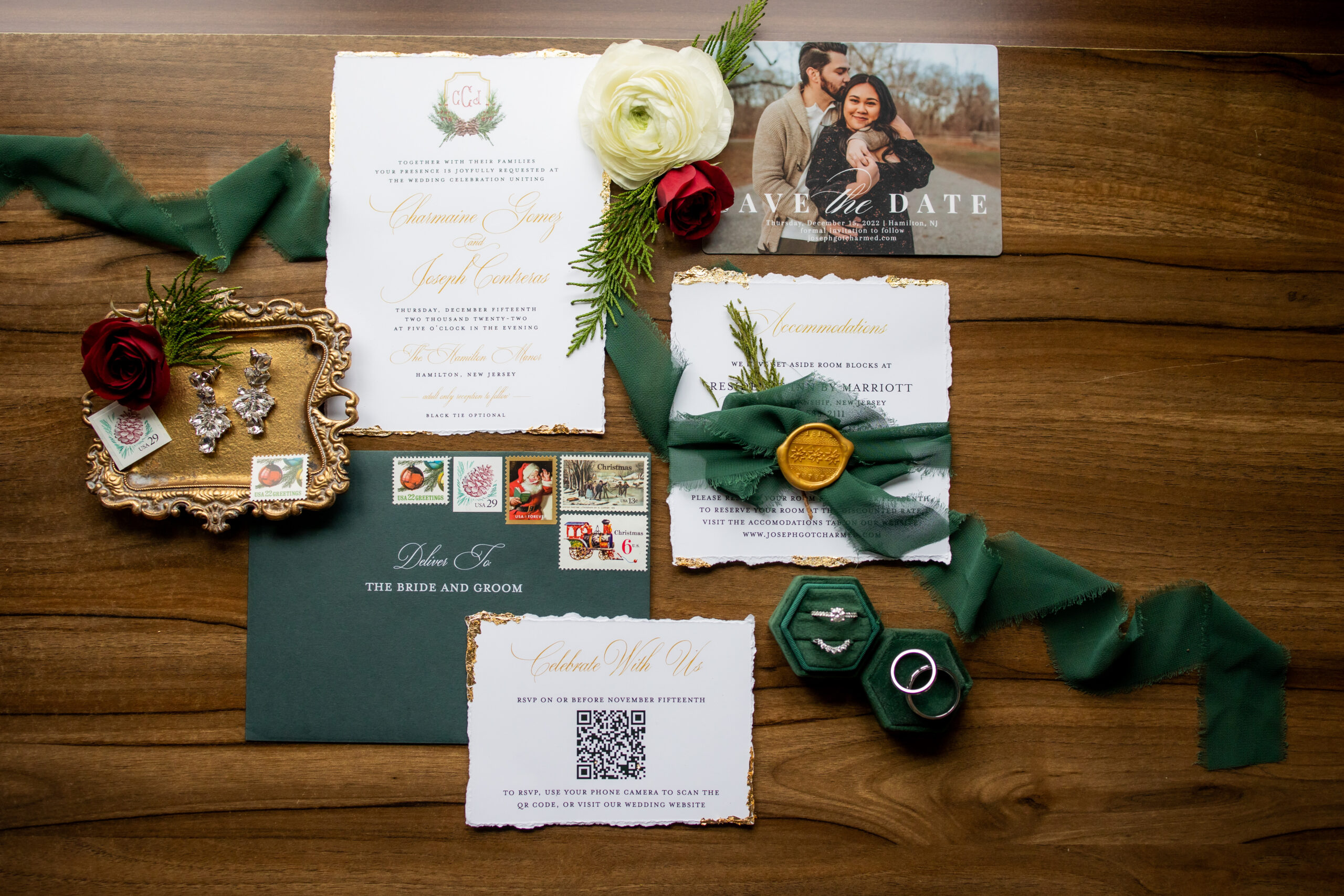 “We had an elegant Christmas-themed wedding at The Hamilton Manor on December 15 2022,” says Charmaine. “Our color scheme was emerald green, burgundy and gold with lots of greenery and winter florals scattered around the venue. Our sweetheart table was so romantic and straight out of a Hallmark movie as two Christmas trees were placed as a backdrop with three winter floral arrangements with greenery, pine cones, red romantic flowers and more lined our table alongside candles.”