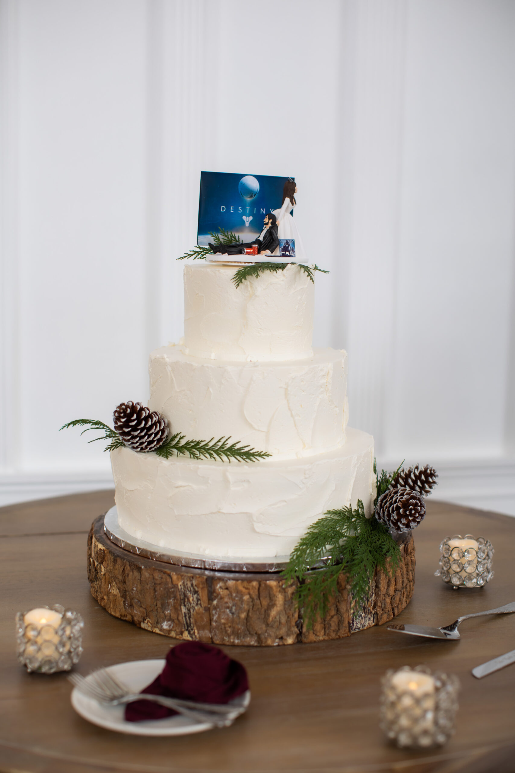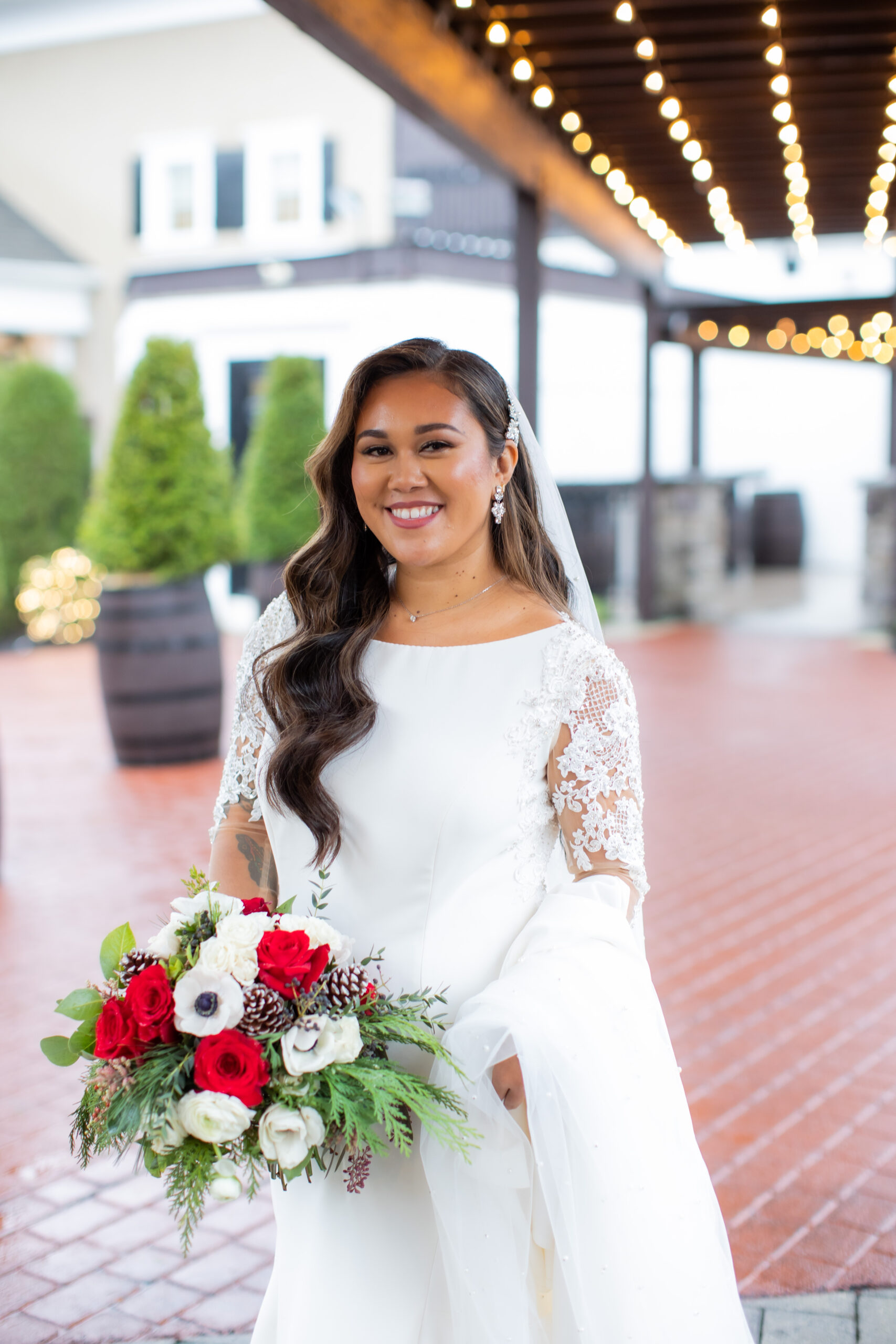 “Our sweetheart table was so romantic and straight out of a Hallmark movie,” says the bride. “Two Christmas trees were placed as a backdrop with three winter floral arrangements with greenery, pine cones, red romantic flowers alongside candles.”