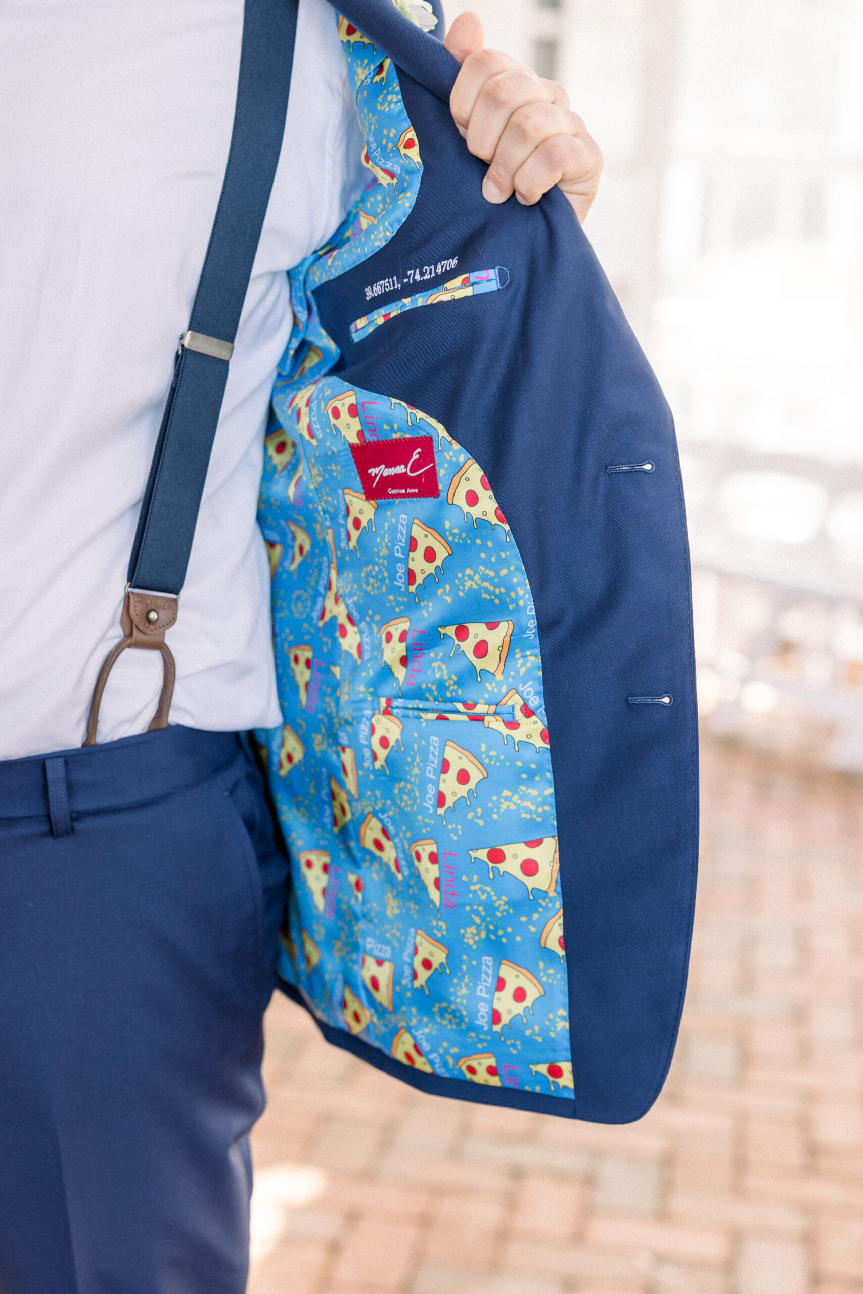 Pizza time “With our new last name as Pizzolato (and Joe being called ‘Pizza’ for years), we really leaned into that,” says Chelsea. “Joe had a pizza fabric sewn into his jacket. We had late night pizza served at the venue for the after party alongside espresso martinis and a cigar roller.”