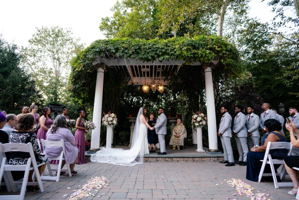 White, rose and beige rose petals adorned the aisle as they were married in the beautiful gardens at Nanina’s in the Park.
