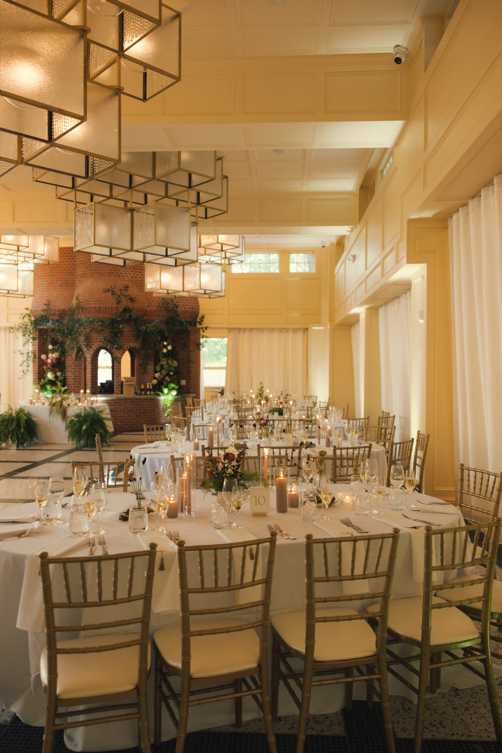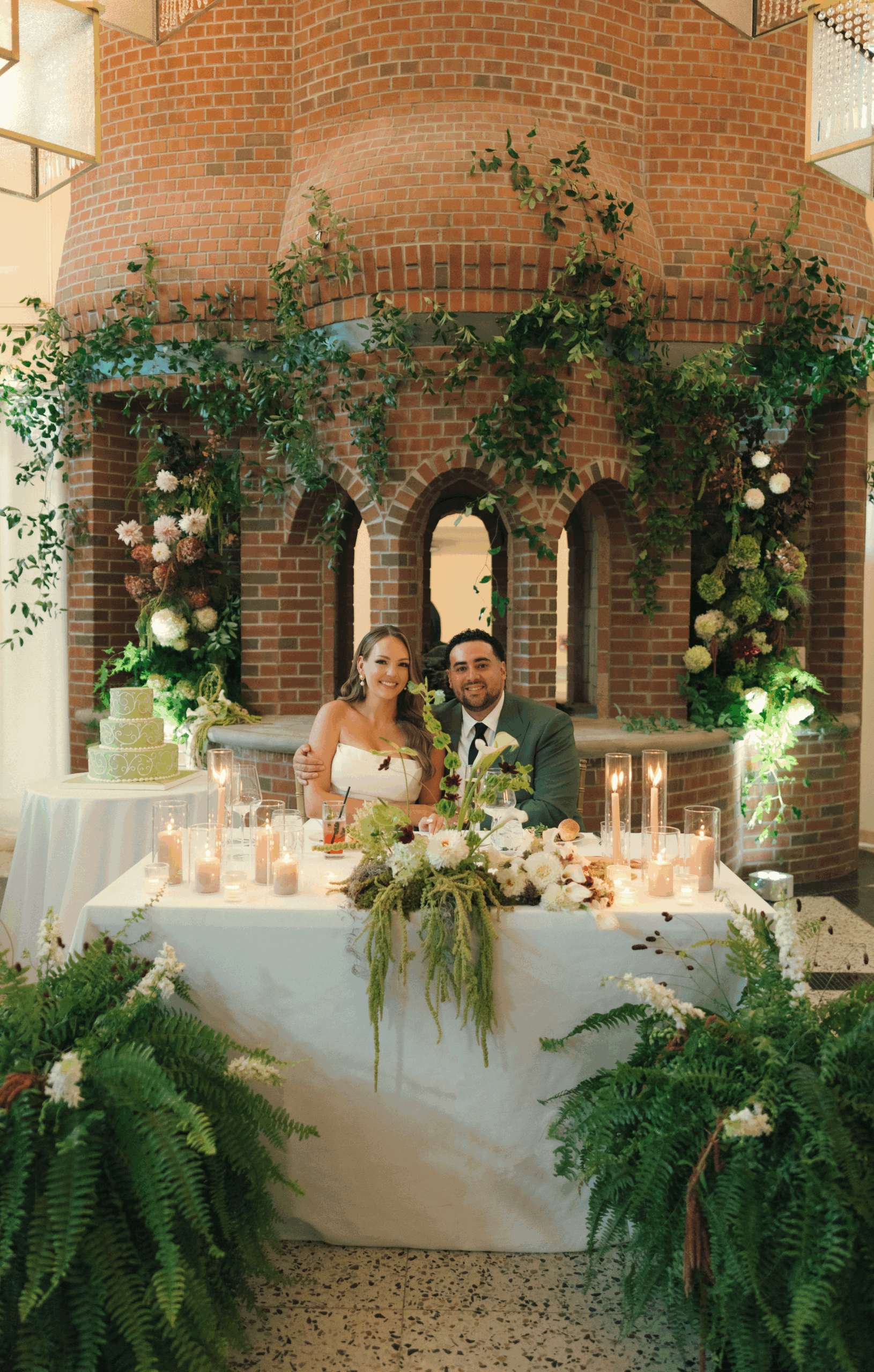 “Our flowers were such an exciting part for us too—we wanted our party to feel like a ‘swanky garden’, so my mom and I collected giant ferns over the summer to use as aisle decor and repurposed them into the reception space. Our florist SimplyCole brought our vision to life, adorning the brick fireplace with greenery that became the perfect ceremony backdrop.