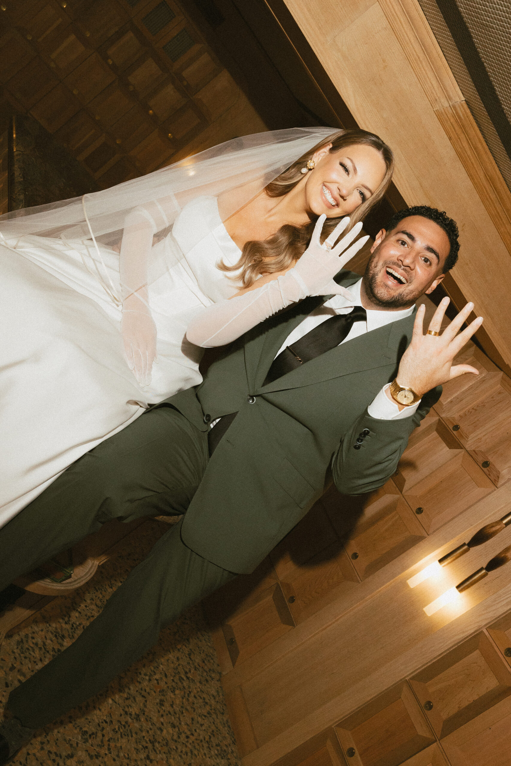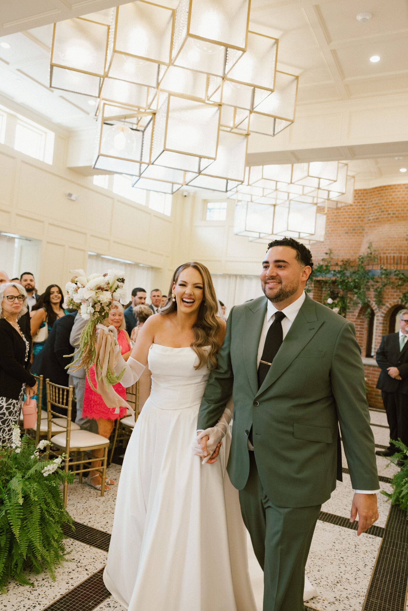 “I wore a two-piece Justin Alexander gown with sheer gloves by Cornelia James. John wore a custom green suit embroidered with our initials and a silk floral lining that matched our designs.”