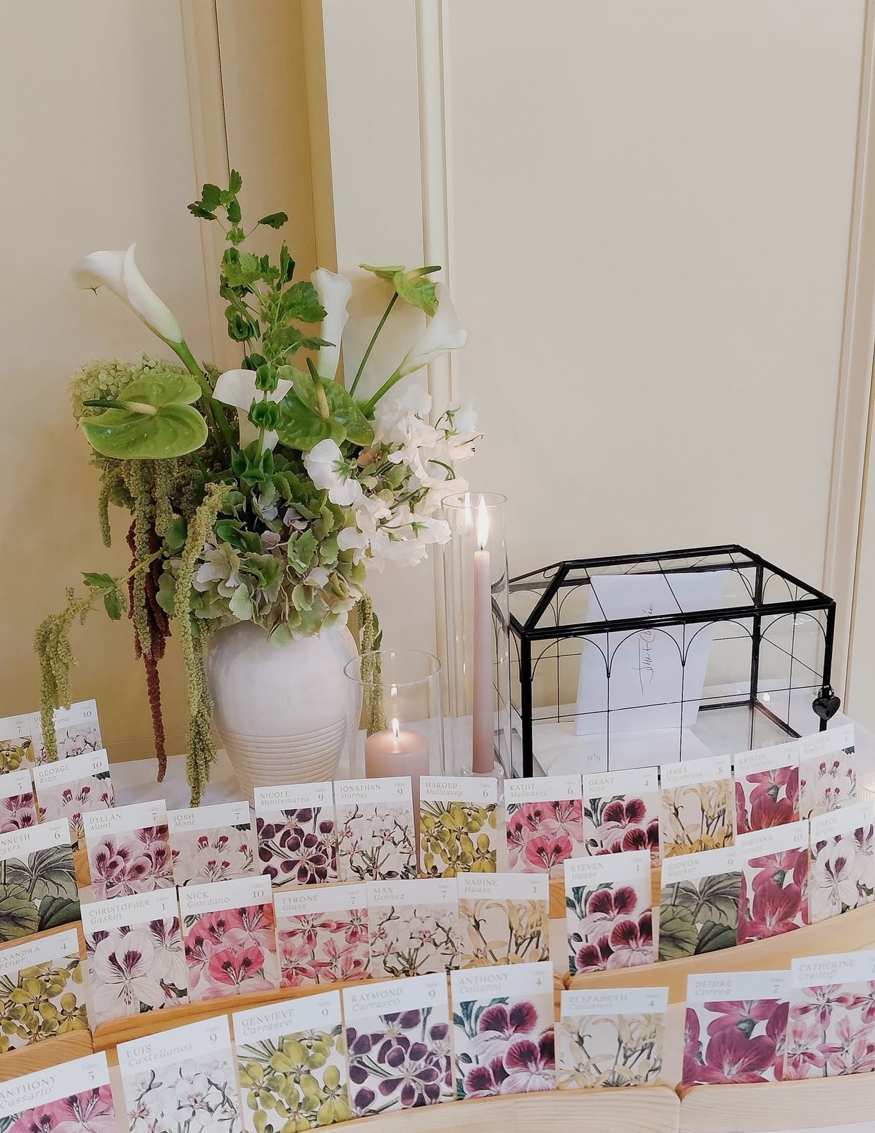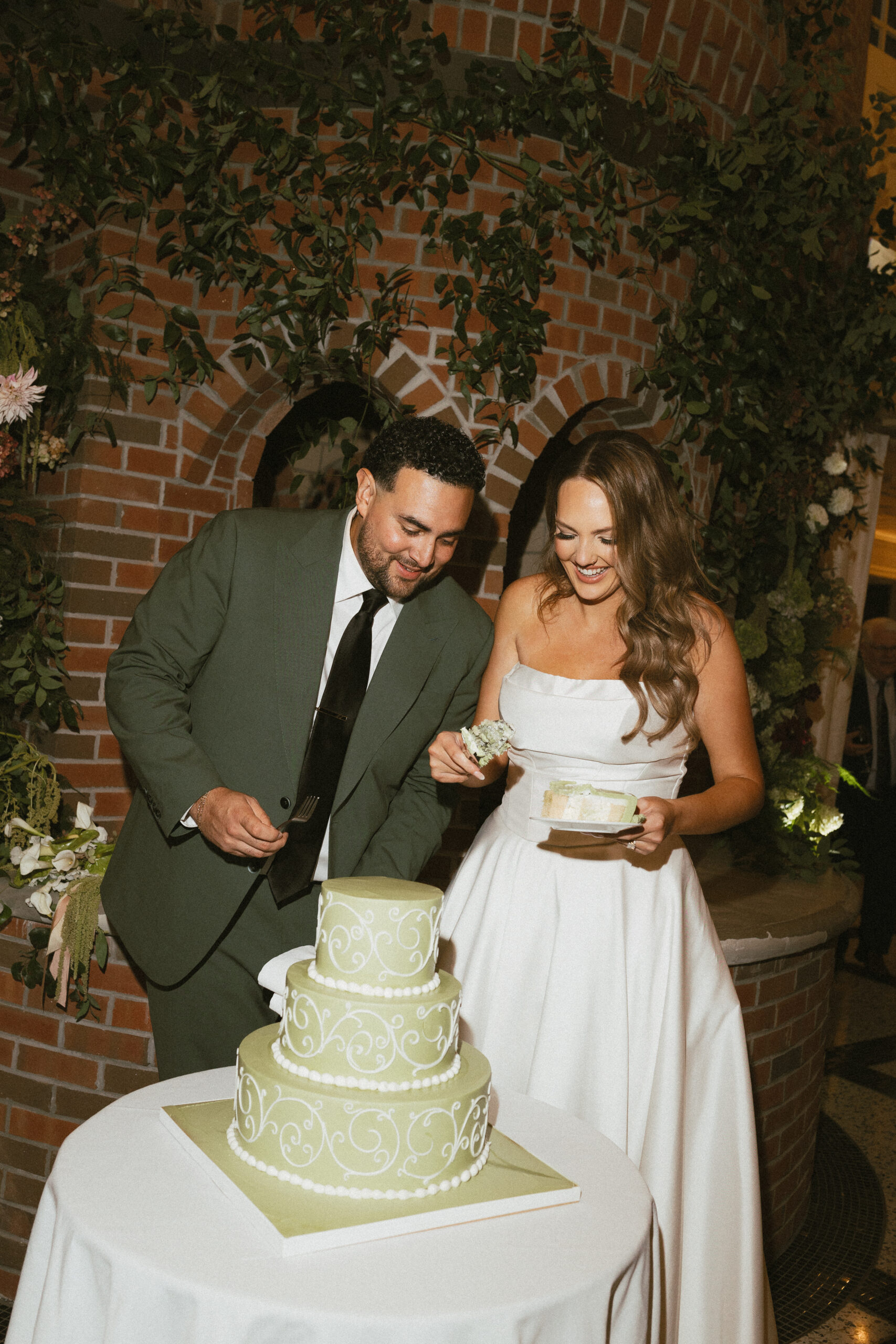 “We had so much fun deciding every detail together, even down to our green wedding cake! We leaned into a fun chartreuse green and paired it with summery motifs and floral illustrations, scanned from a book on botanicals, which we used for our escort cards and layered signage.”